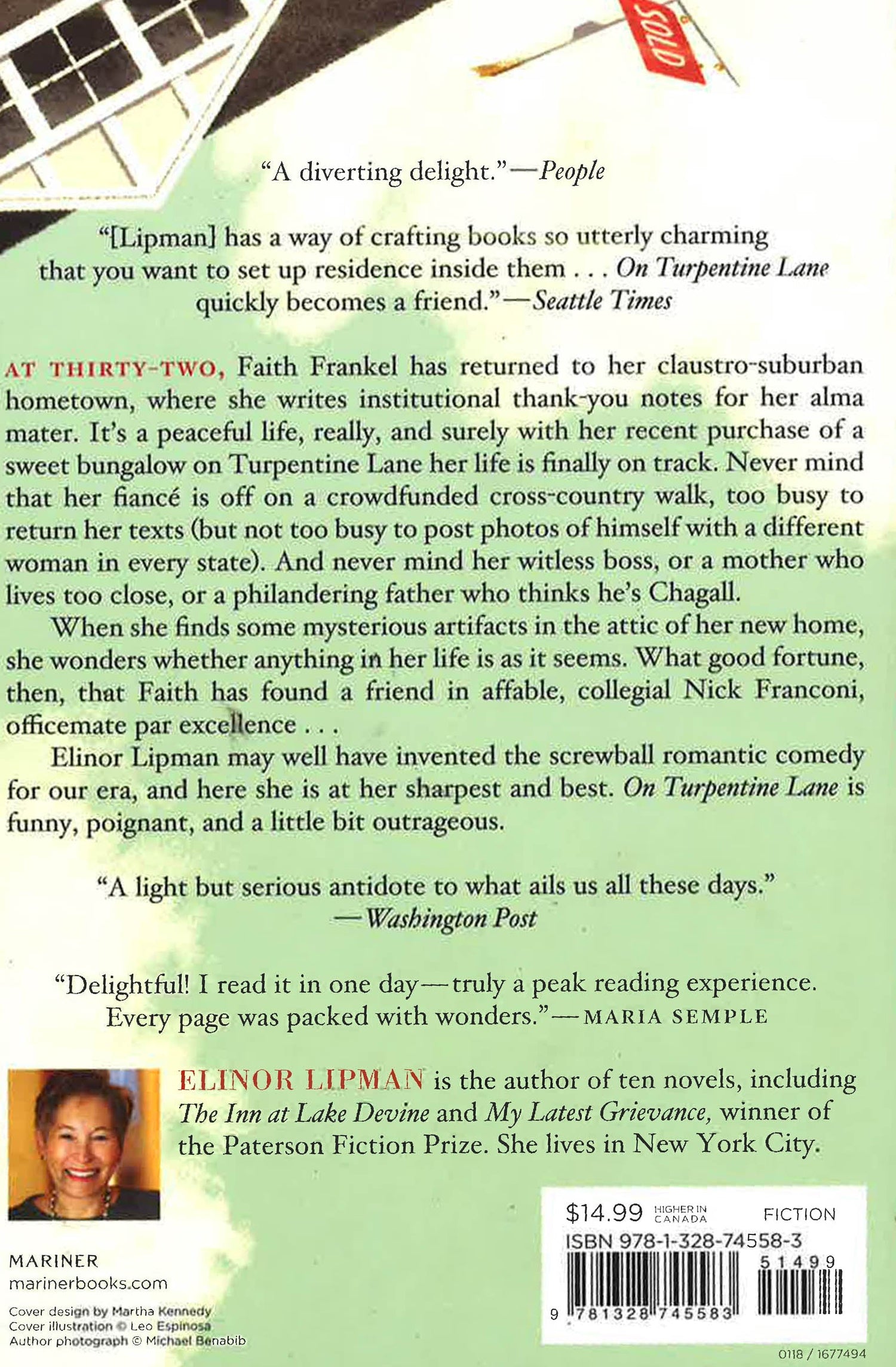 "Light and tight, On Turpentine Lane is constructed with an almost scary mastery."--New York Times Book Review "A diverting delight."--People "[Lipman] has a way of crafting books so utterly charming that you want to set up residence inside them...On Turpentine Lane quickly becomes a friend."--Seattle Times At thirty-two, Faith Frankel has returned to her claustro-suburban hometown, where she writes institutional thank-you notes for her alma mater. It's a peaceful life, really, and surely with her recent purchase of a sweet bungalow on Turpentine Lane her life is finally on track. Never mind that her fiancé is off on a crowdfunded cross-country walk, too busy to return her texts (but not too busy to post photos of himself with a different woman in every state). And never mind her witless boss, or a mother who lives too close, or a philandering father who thinks he's Chagall.