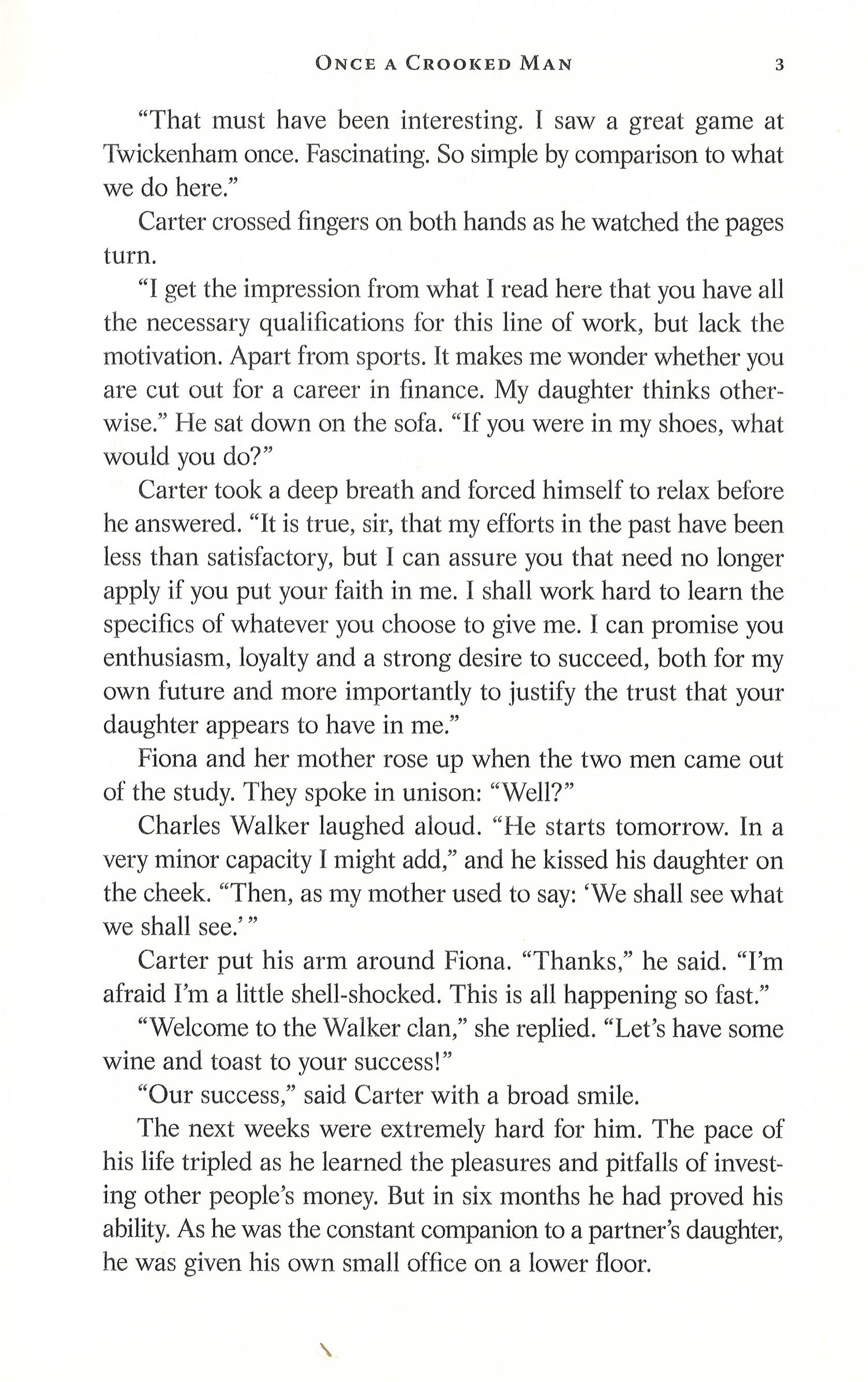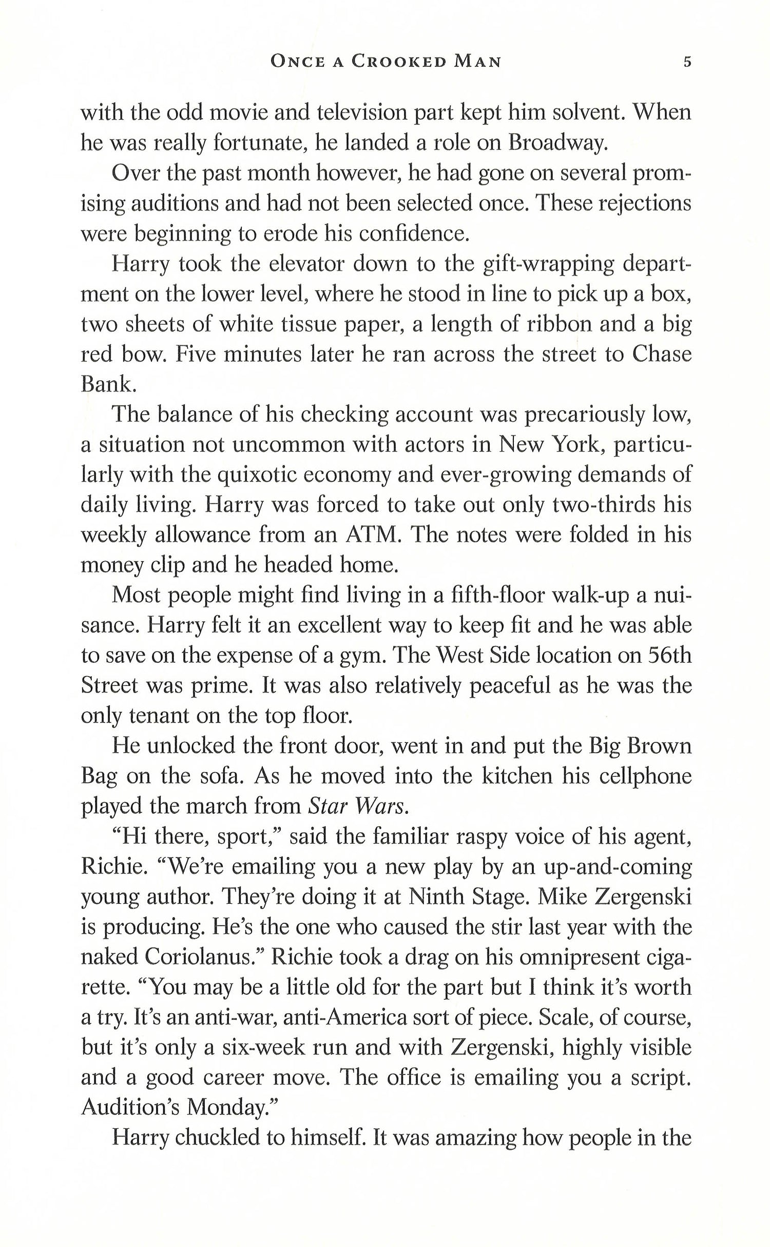Crime pays. And pays well. Sal, Max and Enzo Bruschetti have proved this over a lifetime of nefarious activity that they have kept hidden from law enforcement. Nowhere in any file, on any computer is there a record of anything illegal from which they have profited. But Max has a problem. His body is getting old and his doctor has told him to take it easy. Max has decided that the time has come for the family to retire. But when young actor Harry Murphy overhears the Bruschetti brothers planning changes to their organization, including the murder of a man in London who knows too much, the Bruschetti's plans begin to unravel. After Harry makes the well-intentioned if egregious mistake of trying to warn the Bruchetti's intended victim he finds himself alone in a foreign country, on the wrong side of the law, with a suitcase full of cash and a dangerous man on his trail. And while his good looks, charm and cheerful persistence may prove assets in the turbulent events that follow, none of Harry's past roles have prepared him for what happens next. At turns tense and funny, Once a Crooked Man is infused with the infectious charm that has made David McCallum one of television's longest running, most-beloved stars.