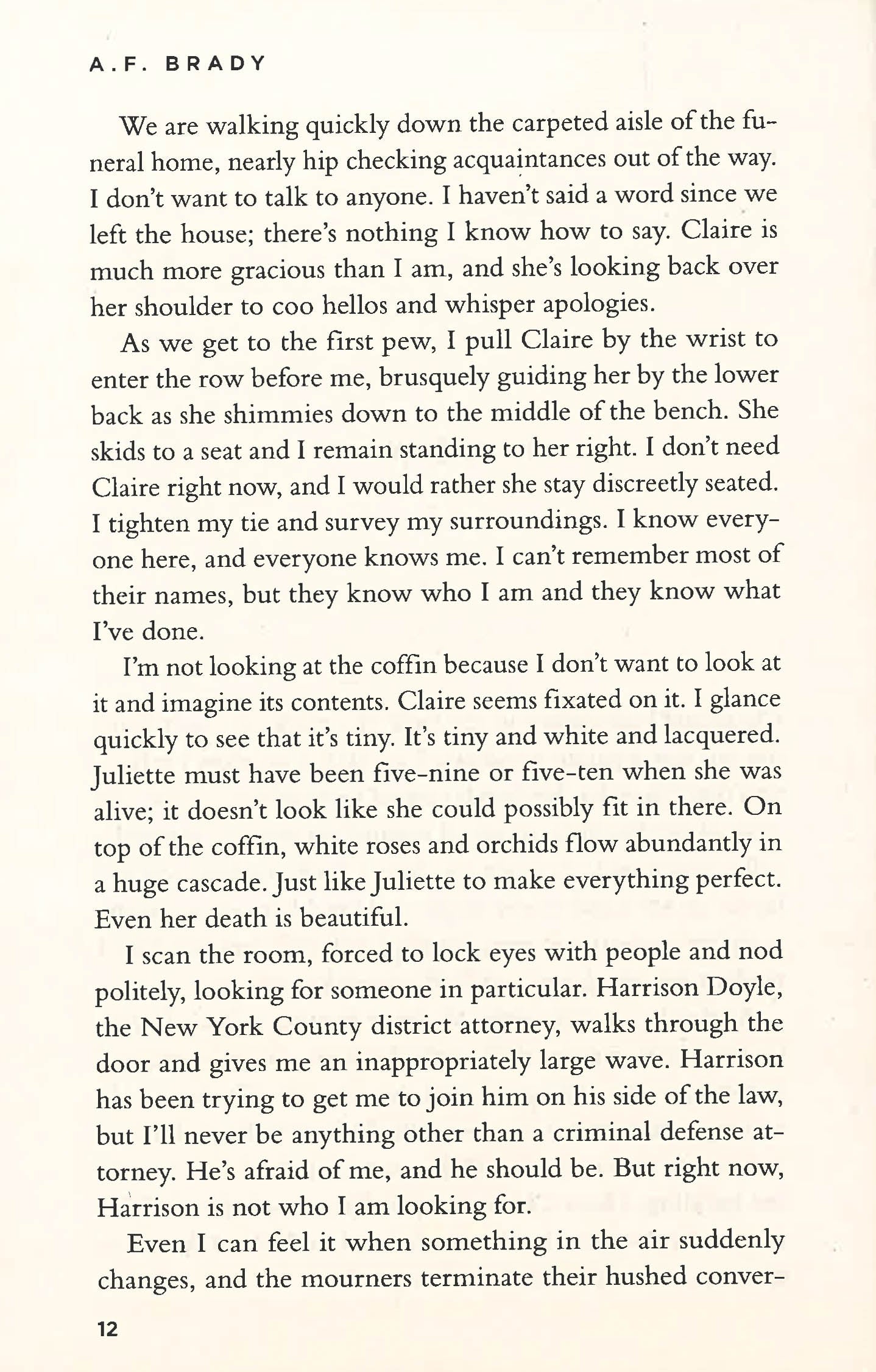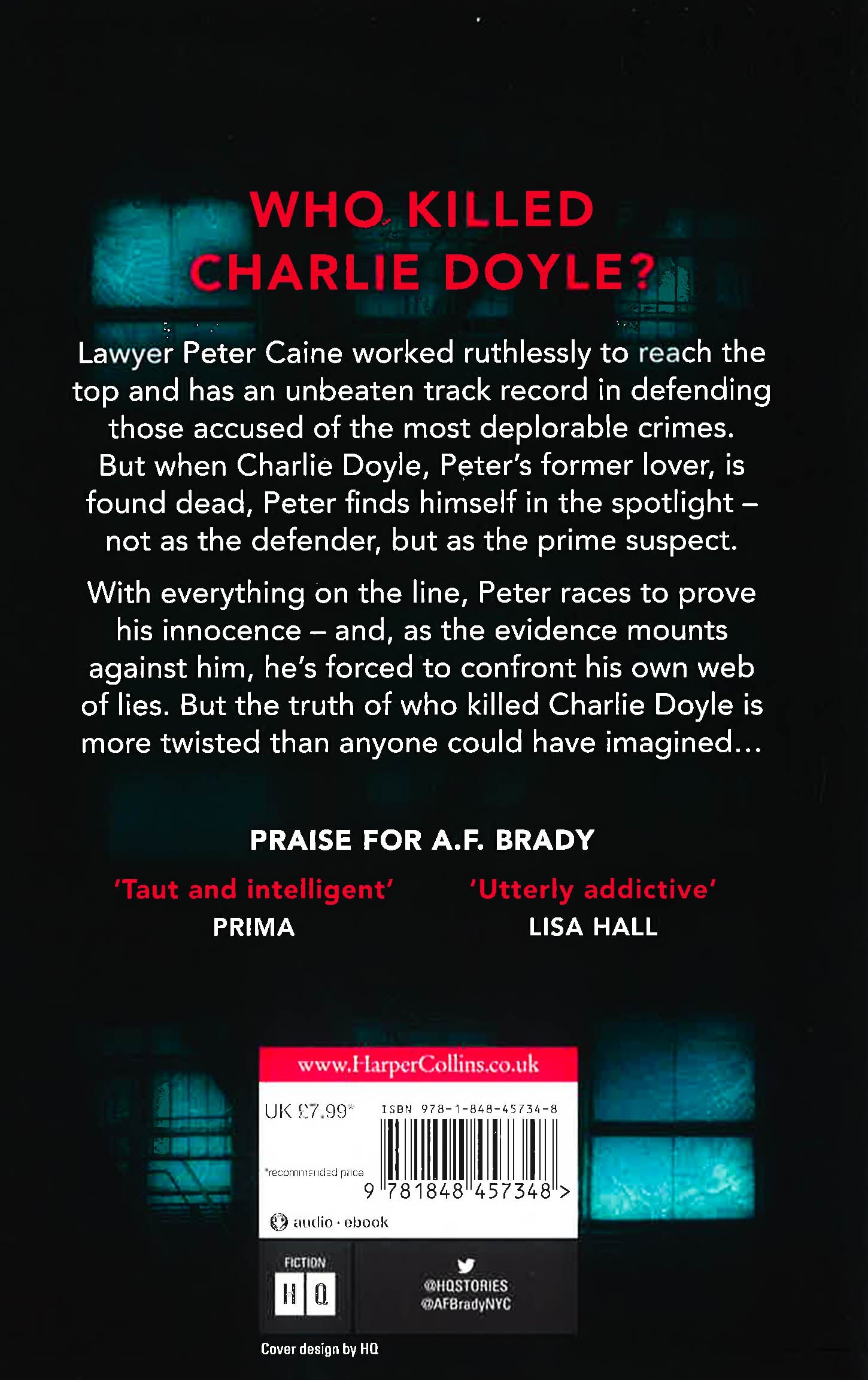 Did he kill Charlie Doyle? And if he didn't...who did? Peter Caine, a cutthroat Manhattan defense attorney, worked ruthlessly to become the best at his job. On the surface, he is charming and handsome, but inside he is cold and heartless. He fights without remorse to acquit murderers, pedophiles and rapists. When Charlie Doyle, the daughter of the Manhattan DA-and Peter's former lover-is murdered, Peter's world is quickly sent into a tailspin. He becomes the prime suspect as the DA, a professional enemy of Peter's, embarks on a witch hunt to avenge his daughter's death, stopping at nothing to ensure Peter is found guilty of the murder. In the challenge of his career and his life, Peter races against the clock to prove his innocence. As the evidence mounts against him, he's forced to begin unraveling his own dark web of lies and confront the sins of his past. But the truth of who killed Charlie Doyle is more twisted and sinister than anyone could have imagined...