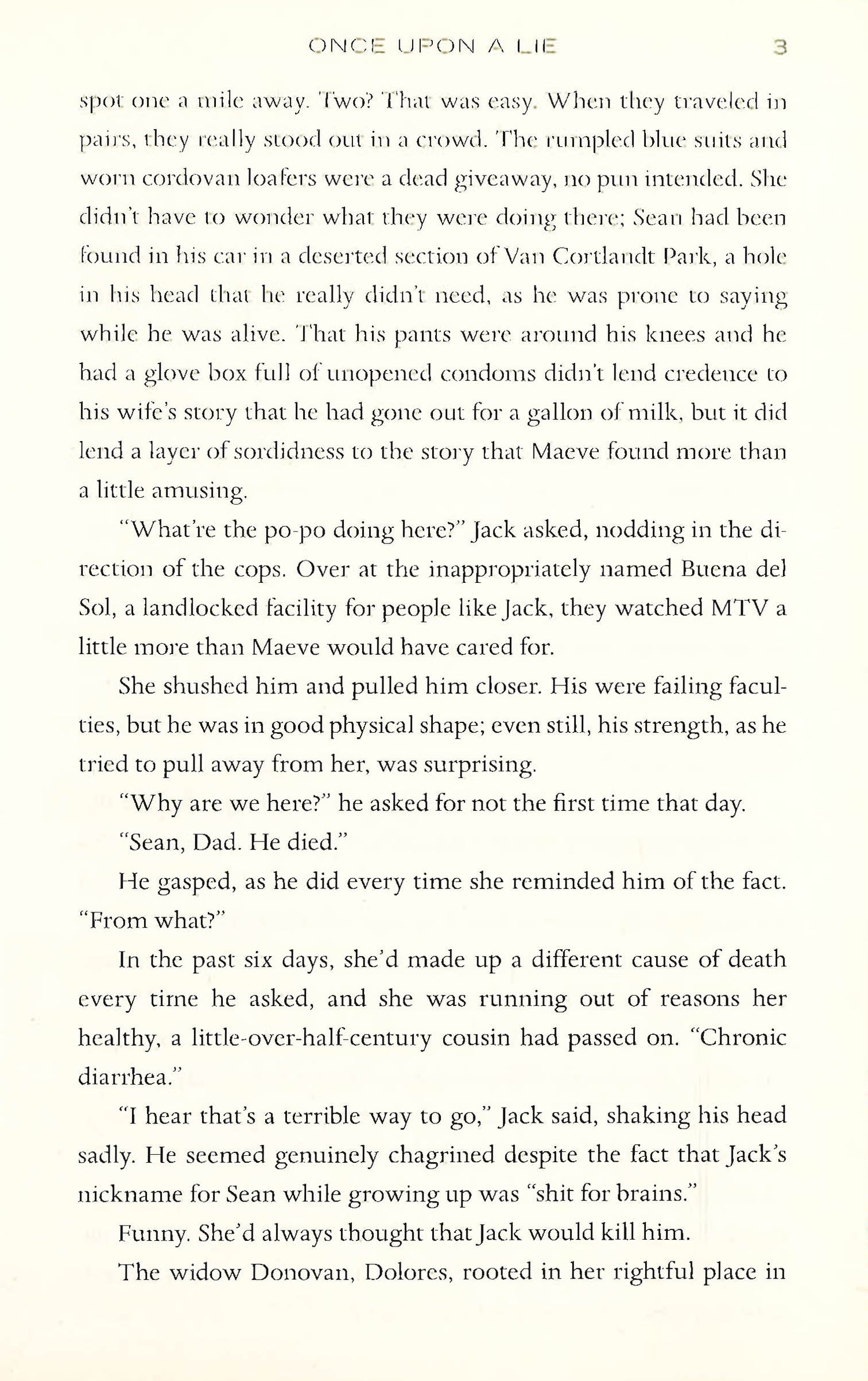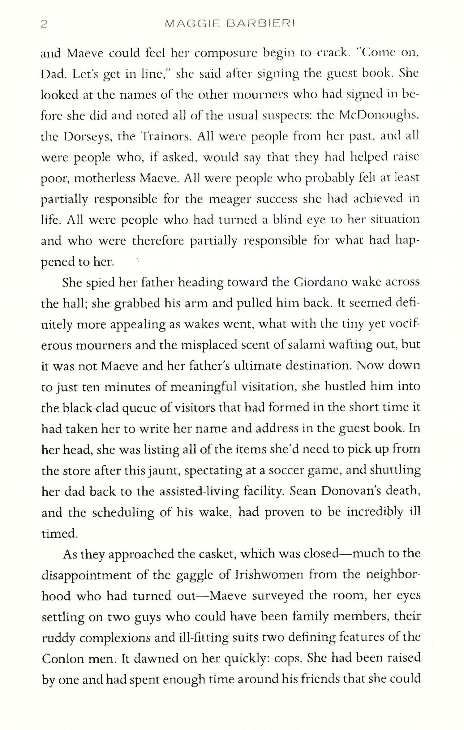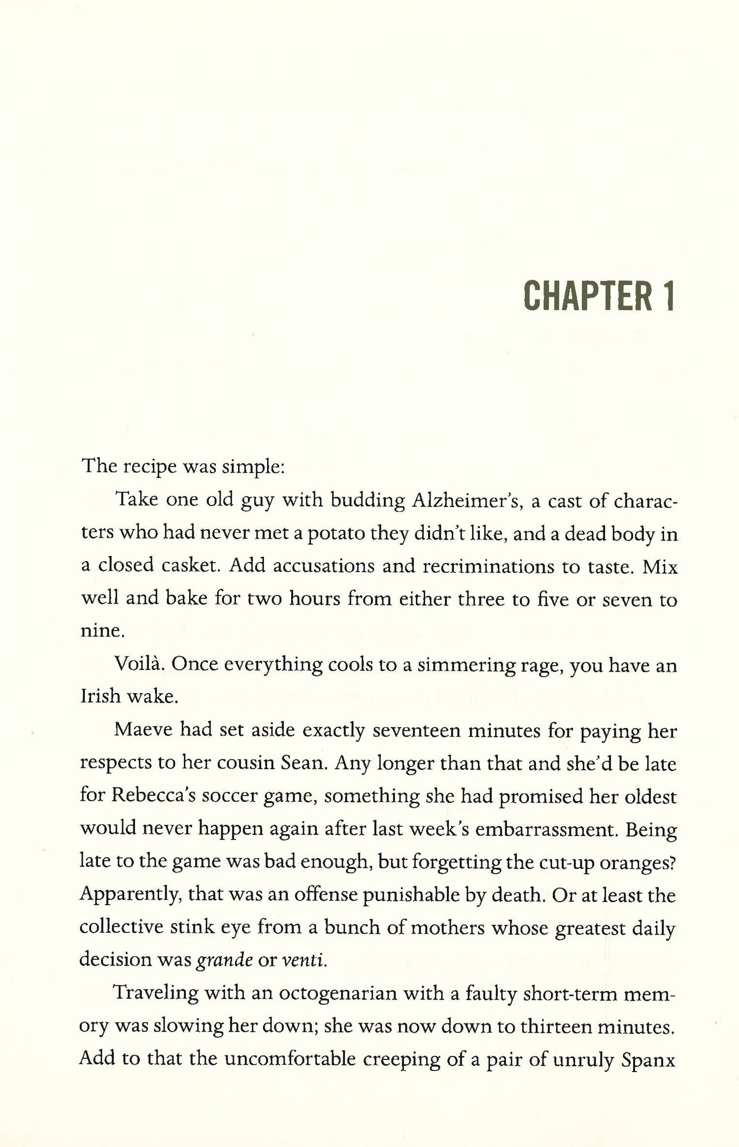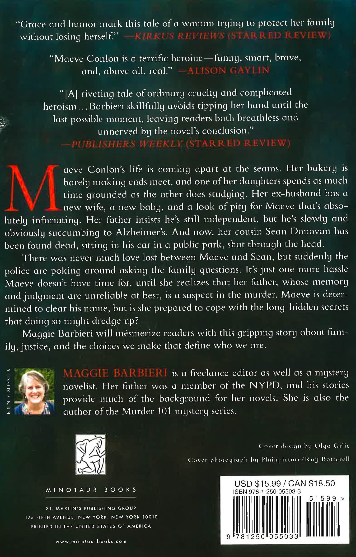 Maeve Conlon's life is coming apart at the seams. Her bakery is barely making ends meet, and one of her daughters spends as much time grounded as the other does studying. Her ex-husband has a new wife, a new baby, and a look of pity for Maeve that's absolutely infuriating. Her father insists he's still independent, but he's slowly and obviously succumbing to Alzheimer's. And now, her cousin Sean Donovan has been found dead, sitting in his car in a public park, shot through the head.There was never much love lost between Maeve and Sean and she's not exactly devastated by his death, but suddenly the police are poking around asking the family questions. It's just one more hassle Maeve doesn't have time for, until she realizes that her father, whose memory and judgment are unreliable at best, is a suspect in the murder. Maeve is determined to clear his name, but is she prepared to cope with the dark memories and long-hidden secrets that doing so might dredge up?