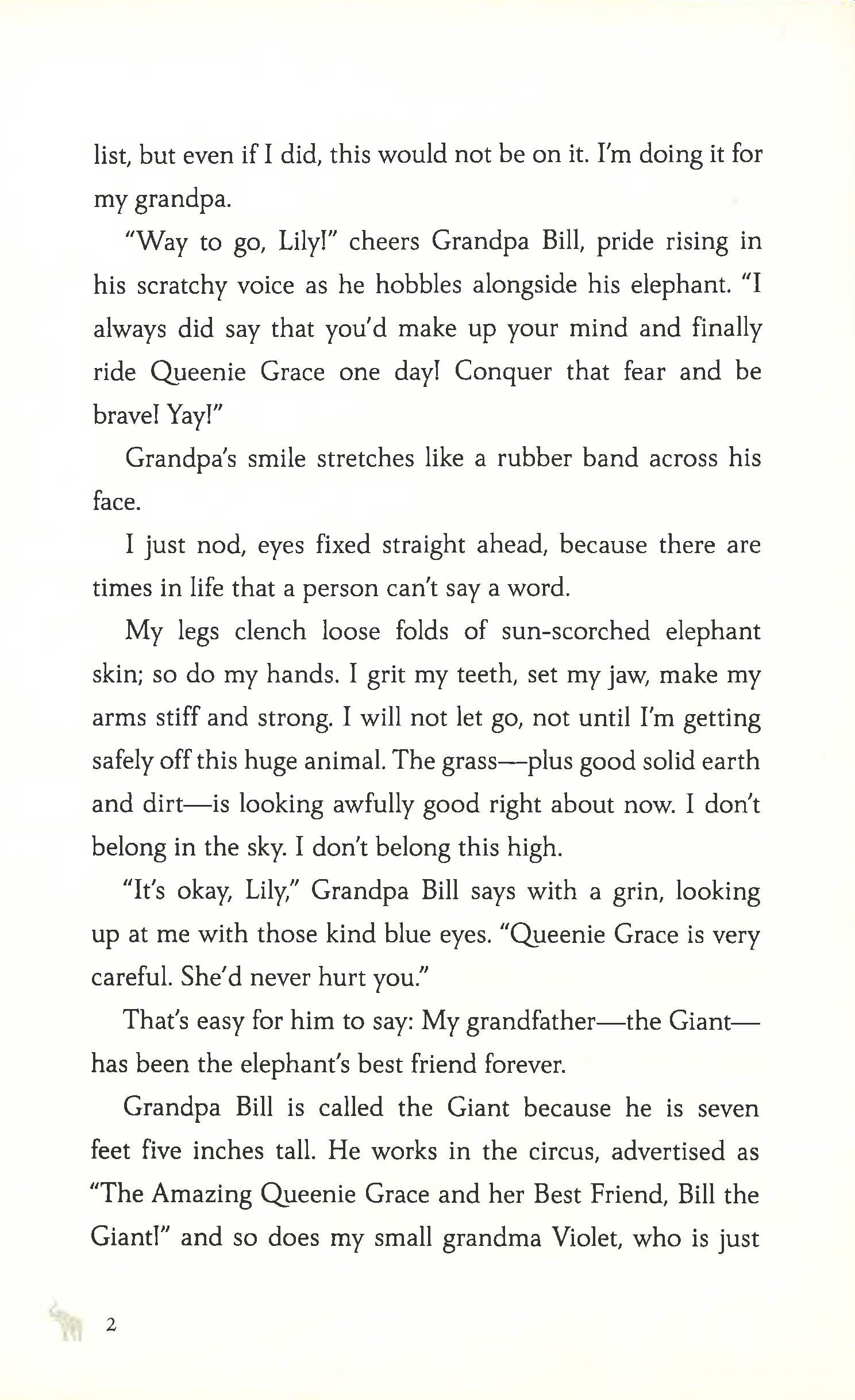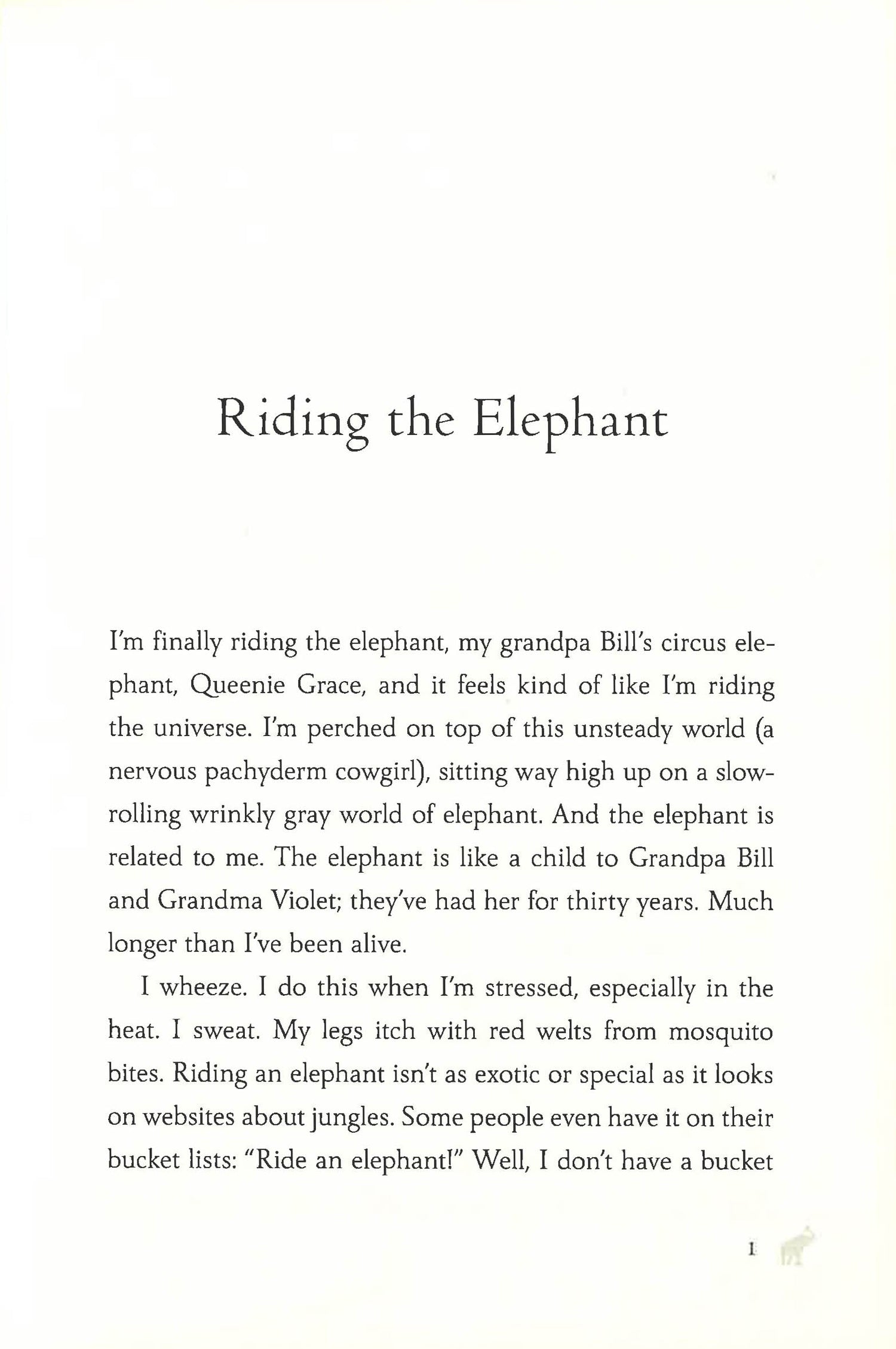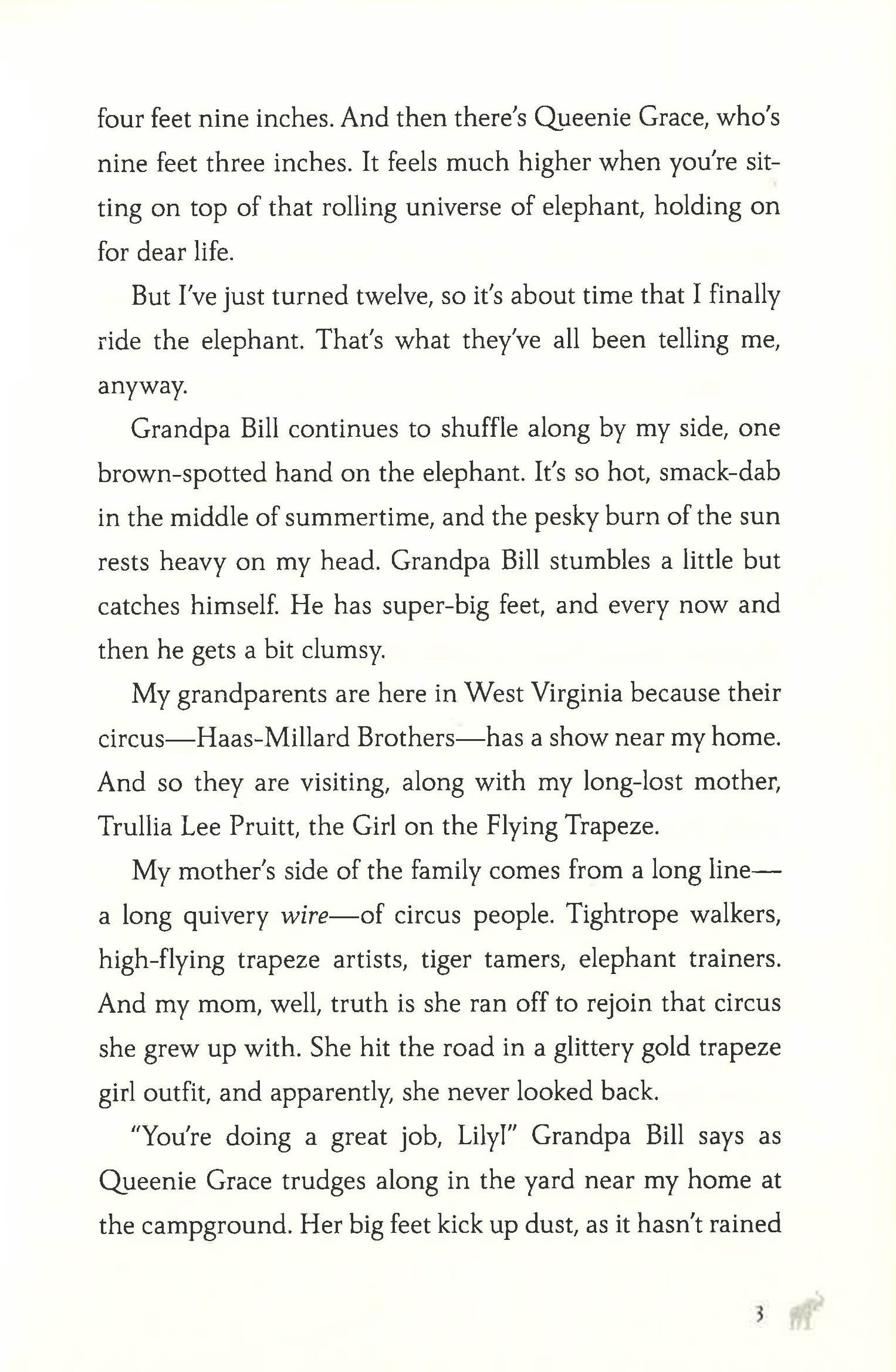 A poignant middle grade animal story from talented author Linda Oatman High that will appeal to fans of Katherine Applegate's The One and Only Ivan. In this heartwarming novel, a girl and an elephant face the same devastating loss--and slowly realize that they share the same powerful love. Twelve-year-old Lily Pruitt loves her grandparents, but she doesn't love the circus--and the circus is their life. She's perfectly happy to stay with her father, away from her neglectful mother and her grandfather's beloved elephant, Queenie Grace. Then Grandpa Bill dies, and both Lily and Queenie Grace are devastated. When Lily travels to Florida for the funeral, she keeps her distance from the elephant. But the two are mourning the same man--and form a bond born of loss. And when Queenie Grace faces danger, Lily must come up with a plan to help save her friend. *This book may have remainder mark*