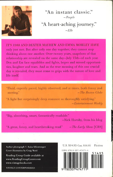 NOW A MAJOR MOTION PICTURE starring ANNE HATHAWAY and JIM STURGESS It s 1988 and Dexter Mayhew and Emma Morley have only just met. But after only one day together, they cannot stop thinking about one another. Over twenty years, snapshots of that relationship are revealed on the same day July 15th of each year. Dex and Em face squabbles and fights, hopes and missed opportunities, laughter and tears. And as the true meaning of this one crucial day is revealed, they must come to grips with the nature of love and life itself.