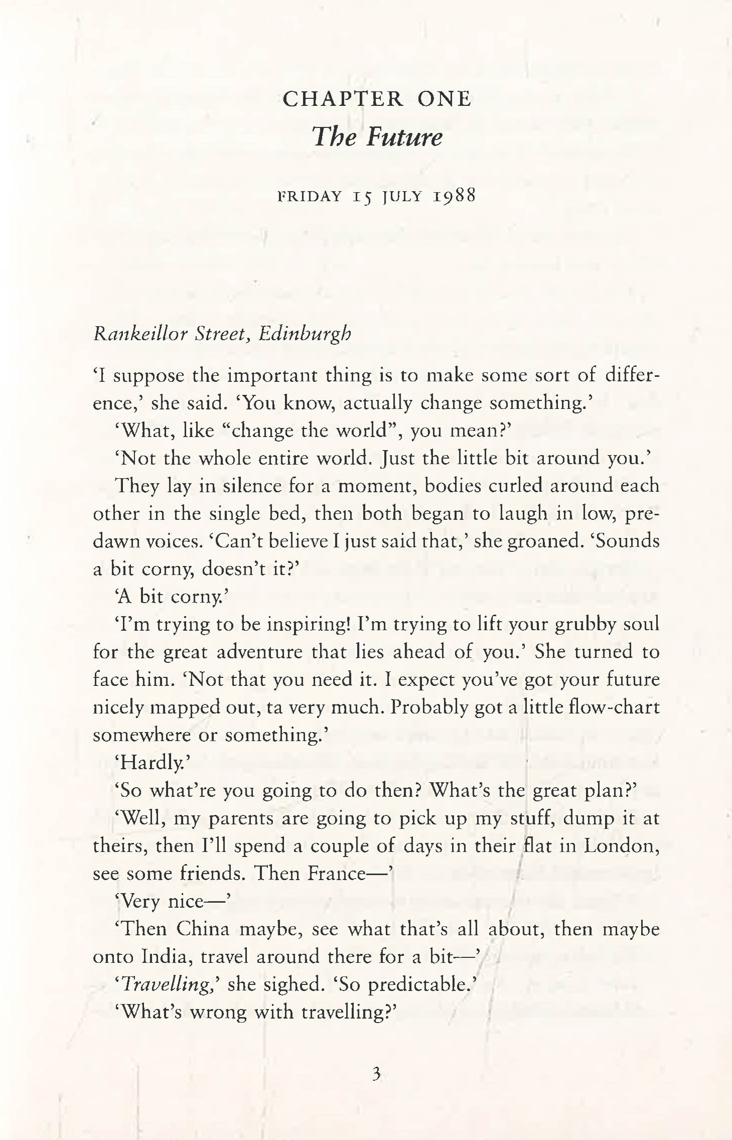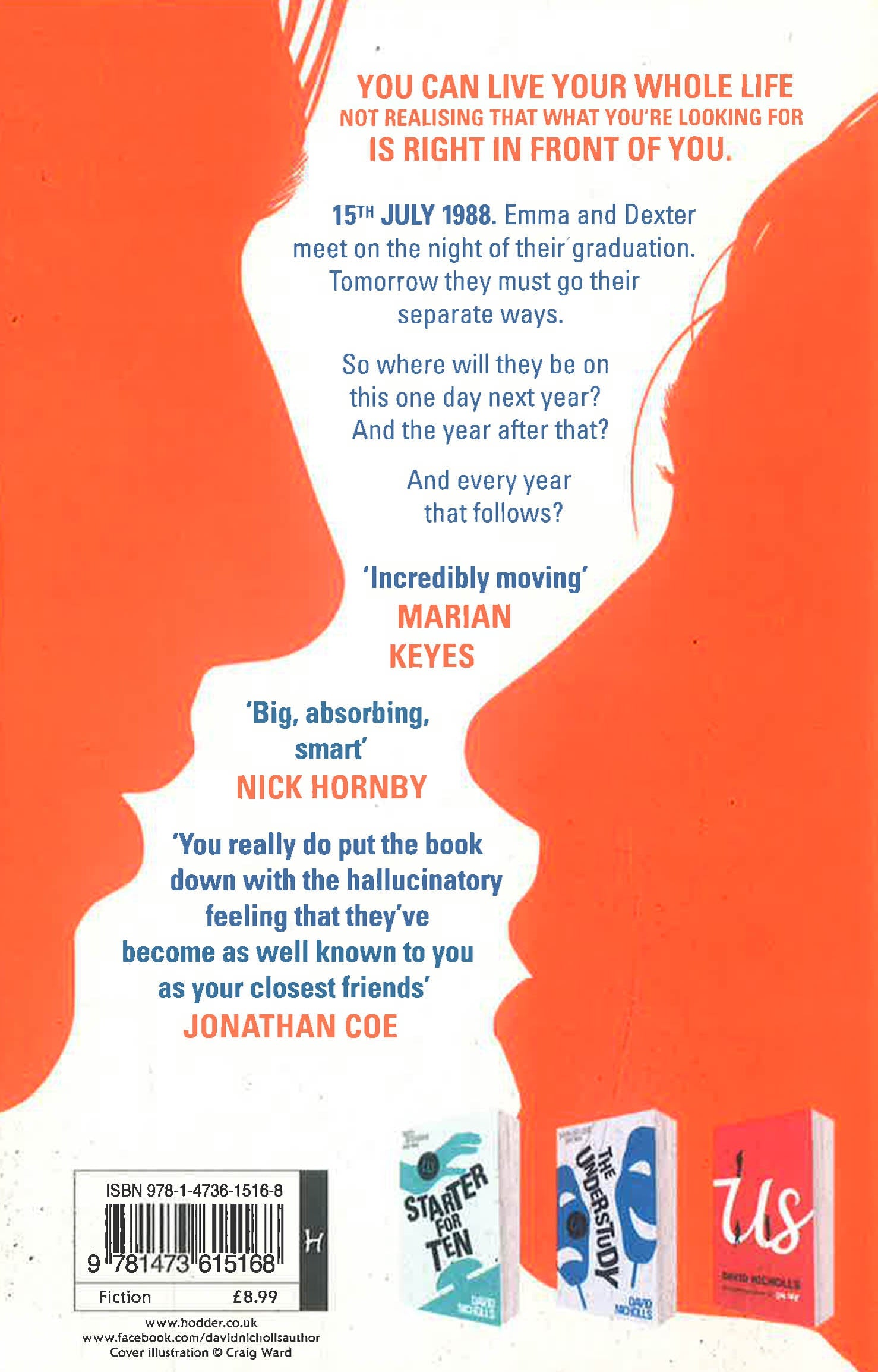 Twenty years, two people, ONE DAY. The multi-million copy bestseller that captures the experiences of a generation. 'I can imagine you at forty,' she said, a hint of malice in her voice. 'I can picture it right now.' He smiled without opening his eyes. 'Go on then.' 15th July 1988. Emma and Dexter meet for the first time on the night of their graduation. Tomorrow they must go their separate ways. So where will they be on this one day next year? And the year after that? And every year that follows?