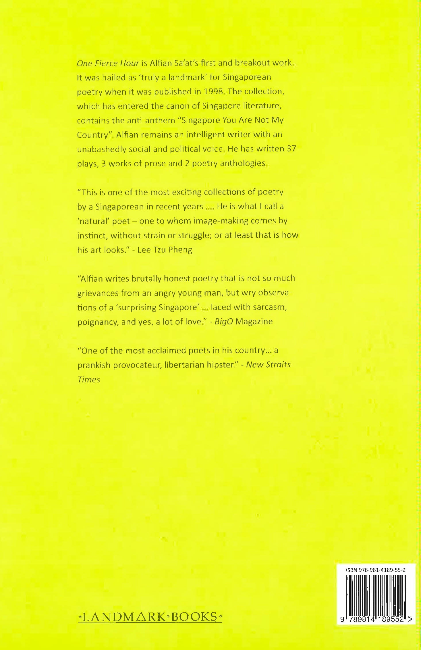 One Fierce Hour is Alfian Sa’at’s first and breakout work. It was hailed as ‘truly a landmark’ for Singaporean poetry when it was published in 1998 when the poet was just 21 years old. Since, then it has been kept in print and has entered the list of canonical anthologies of Singapore literature. The collection contains the anti-anthem “Singapore You Are Not My Country” written well before social media gave voice to dissent and different views of Singapore.