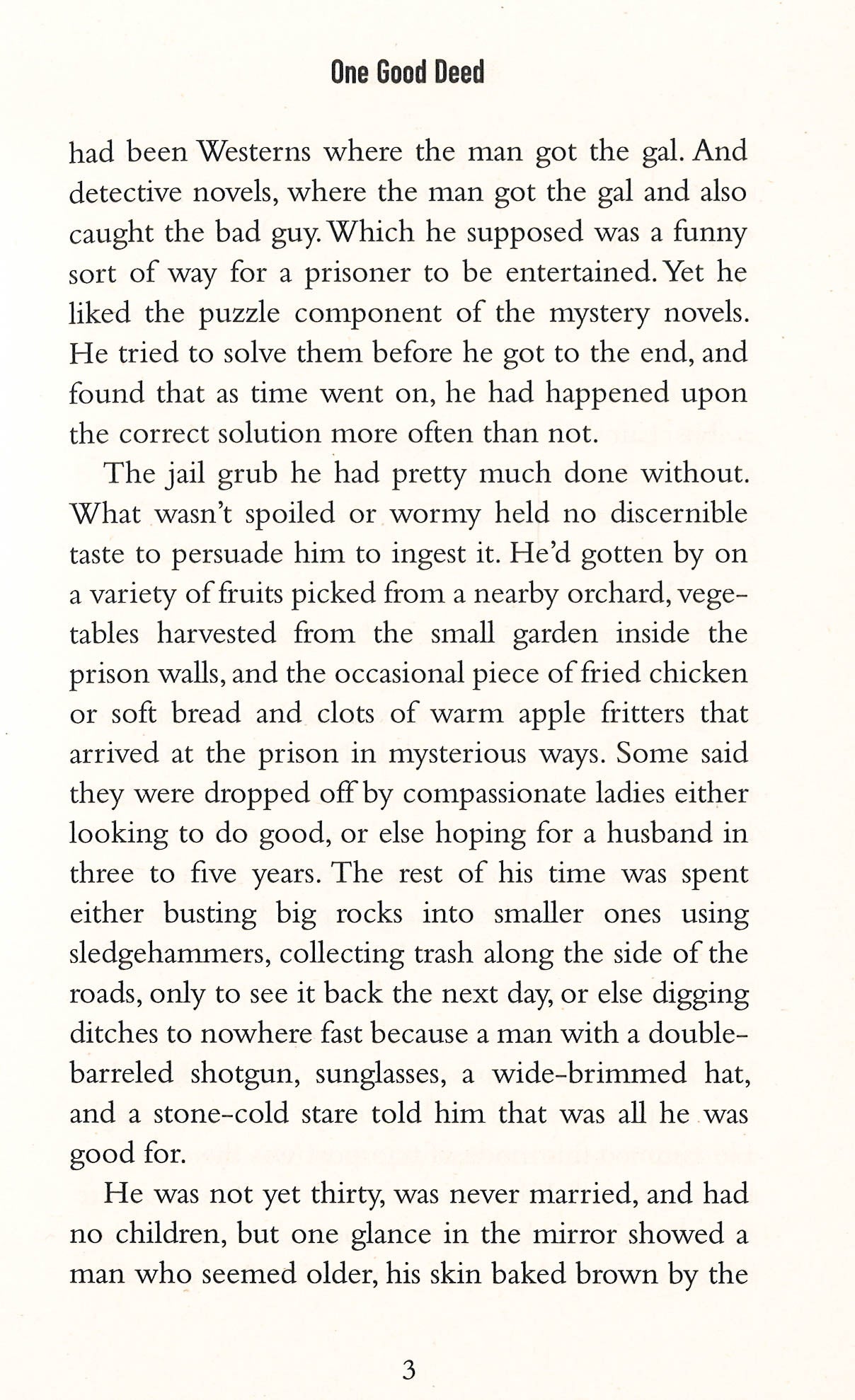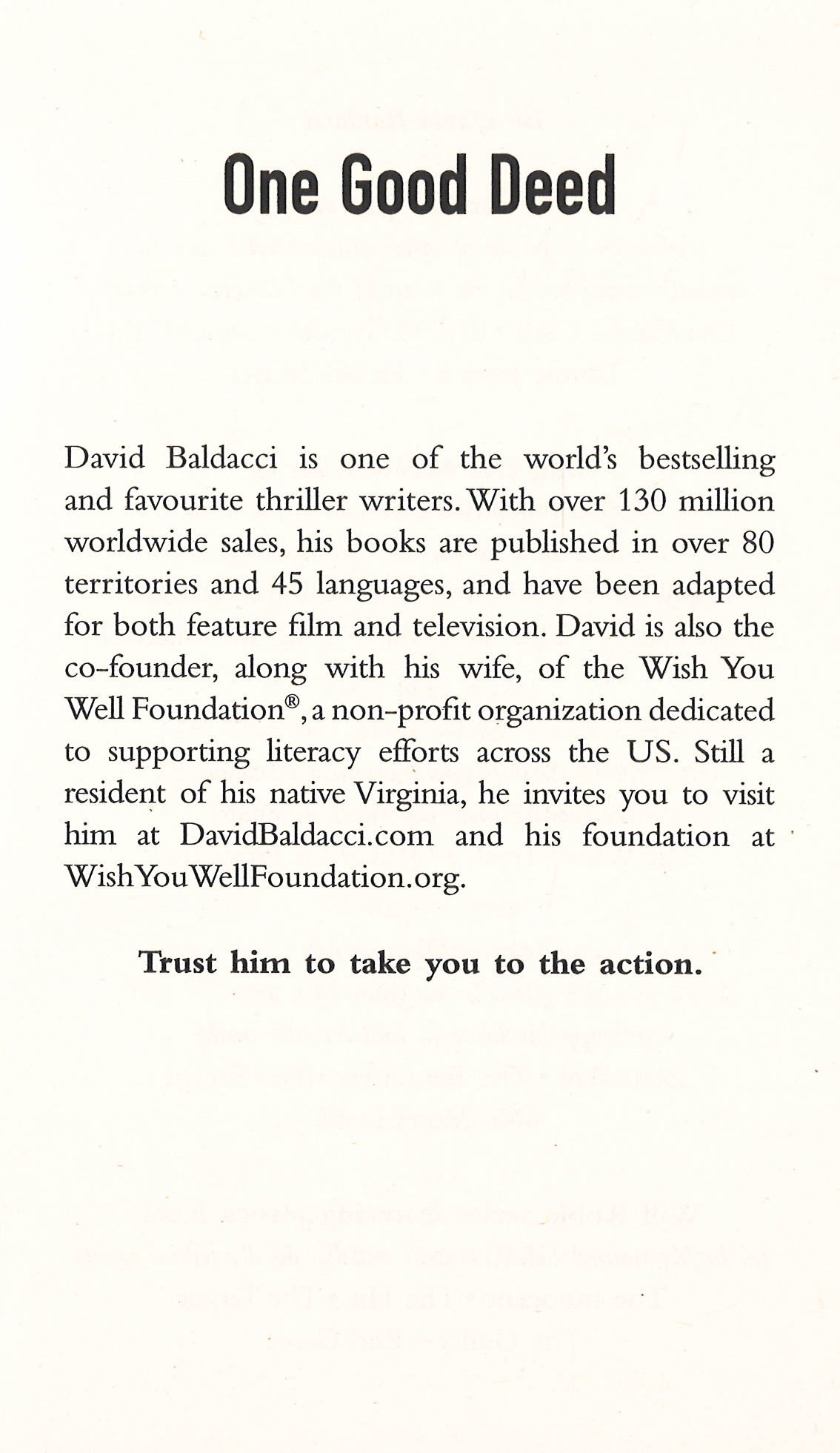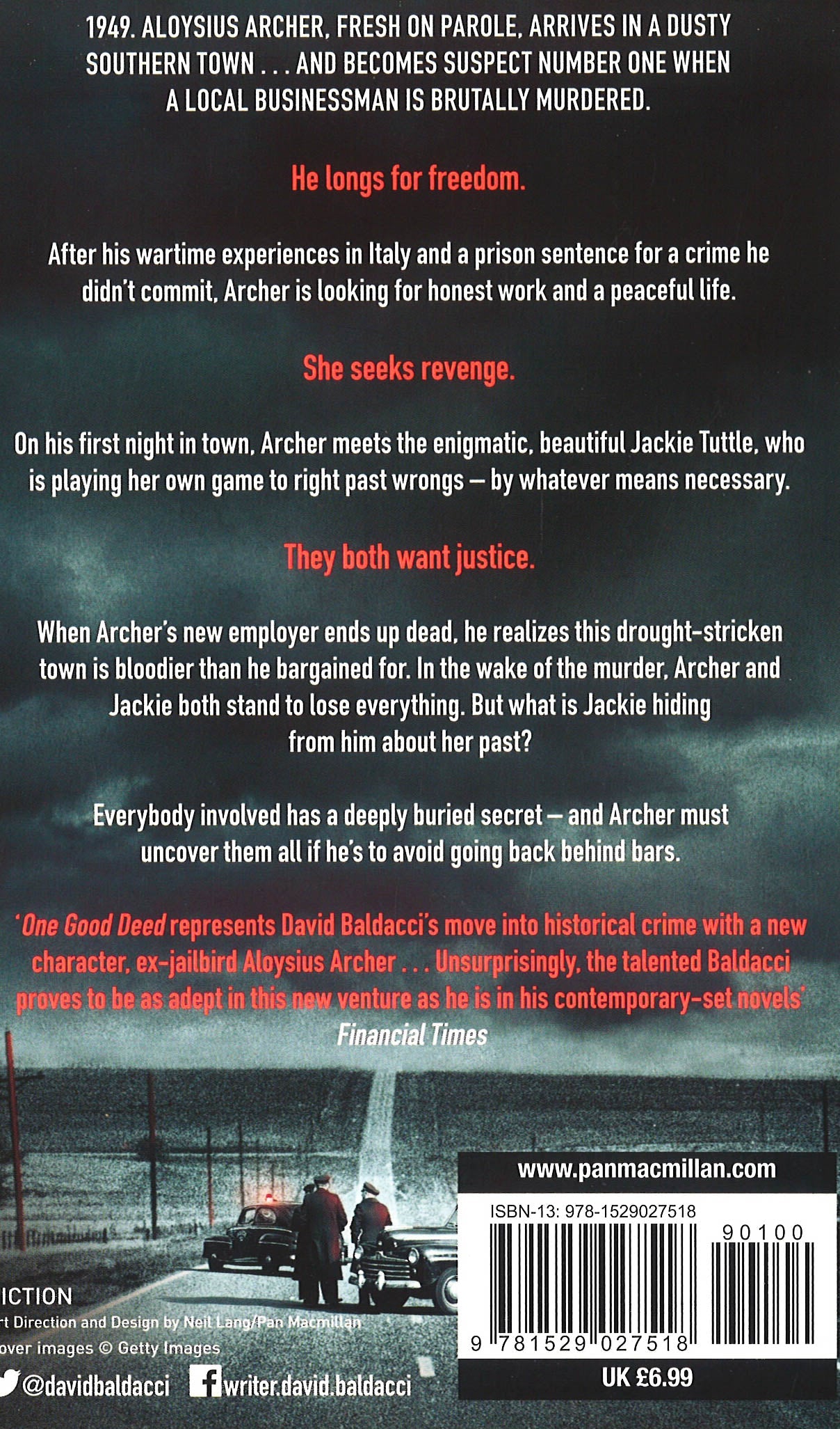 Murder and family secrets, a touch of romance and deeply-felt revenge - with the twist of all twists - make up the perfect page-turning thriller, One Good Deed. For all those who love mystery, crime, Raymond Chandler and Agatha Christie from one of the world's bestselling thriller writers, David Baldacci.In 1949, Aloysius Archer arrives in the dusty Southern town of Poca City. He has nothing but a handful of dollars, the clothes he's wearing and an appointment with his new parole officer. After his wartime experiences in Italy and a prison sentence for a crime he didn't commit, Archer is looking for a fresh start and a peaceful life.On his first night of freedom, Archer meets local business tycoon Hank Pittleman, who promises Archer handsome compensation to work as his debt collector. Yet Archer takes on more than he bargains for, as he becomes embroiled in a long-running feud between the drought-struck town's most dangerous residents. When one of them dies, the authorities label Archer as their number one suspect.A bloody game is being played above and below the law. Everybody playing has a deeply buried secret, and Archer must uncover them all - if he's to avoid going back behind bars.