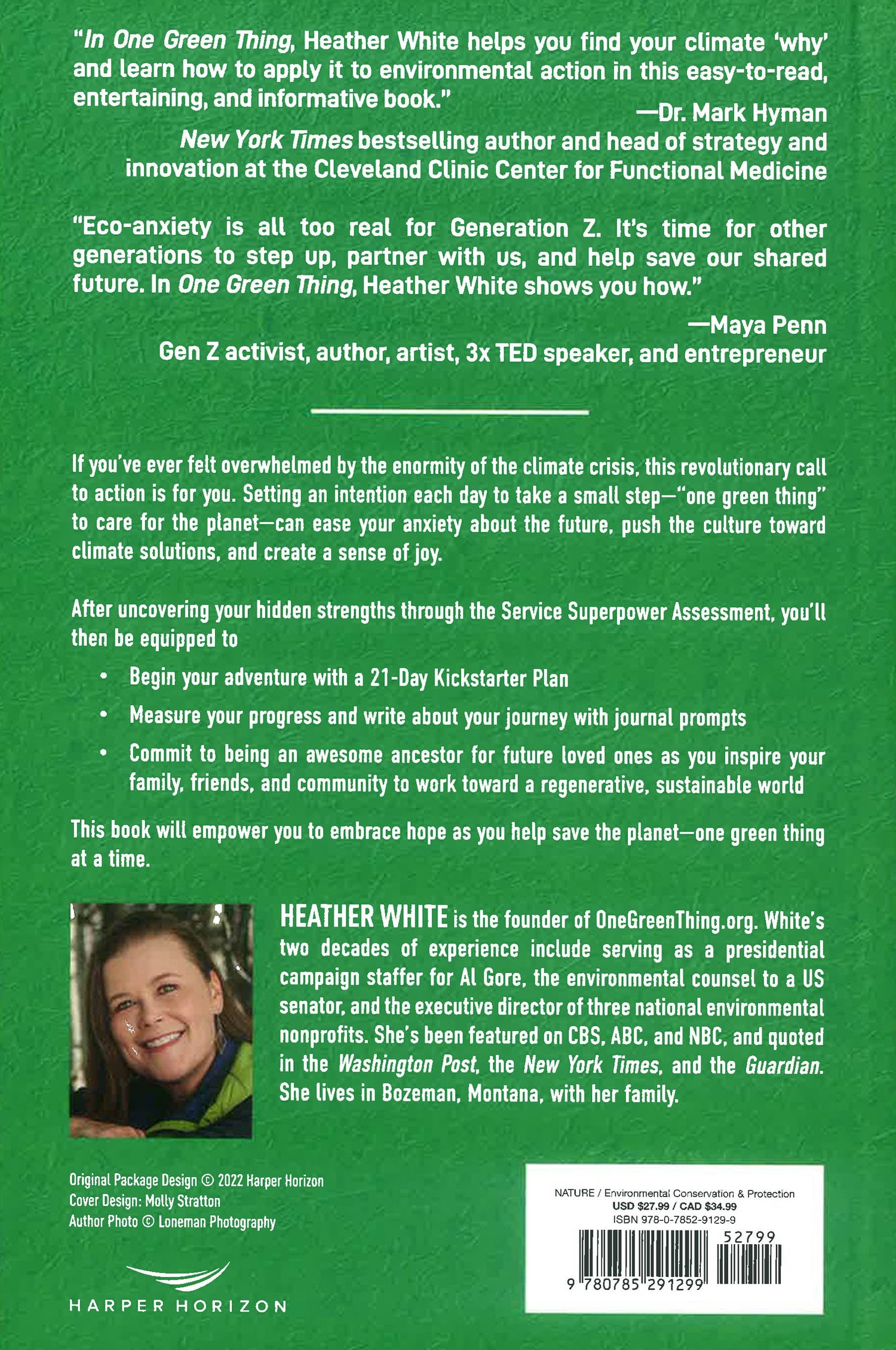 Your non-overwhelming, down-to-earth guide for daily climate action…personalized to your unique strengths. The climate crisis is the biggest challenge of our time. But the urgency of a warming world creates anxiety and can sometimes cause us to throw our hands in the air and think, How can I possibly make a difference? Heather White—known as "the Brené Brown of the environmental movement"—will show you how to contribute to the green lifestyle movement through self-discovery and joy. Your personality, interests, and strengths give you a unique role to play in the climate movement. Are you the Influencer? the Beacon? the Spark? the Sage? Once you identify your Service Superpower Profile, it's time to dive into the action and track your progress.One Green Thing is this generation's definitive climate action handbook. In it you'll:Learn your unique strengths of climate service and how to focus those strengths into specific actions.Log the mental health benefits and measure your progress.Reflect on your journey and your "why" for taking action with exercises and journal prompts.Commit to being an awesome ancestor for future loved ones as you inspire your family, friends, and community to work toward a regenerative, sustainable world. Embark on the journey and find your ONE GREEN THING—your personal action that will contribute to climate healing, ease your eco-anxiety, and create a sense of hope—without becoming overwhelmed.