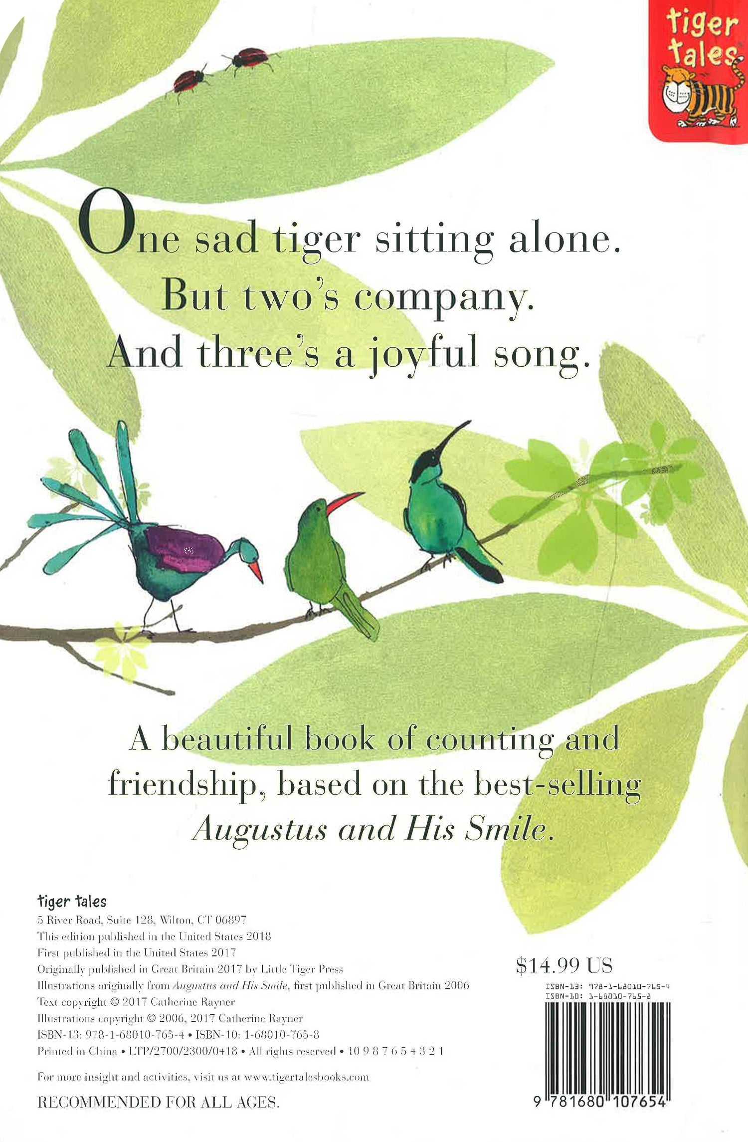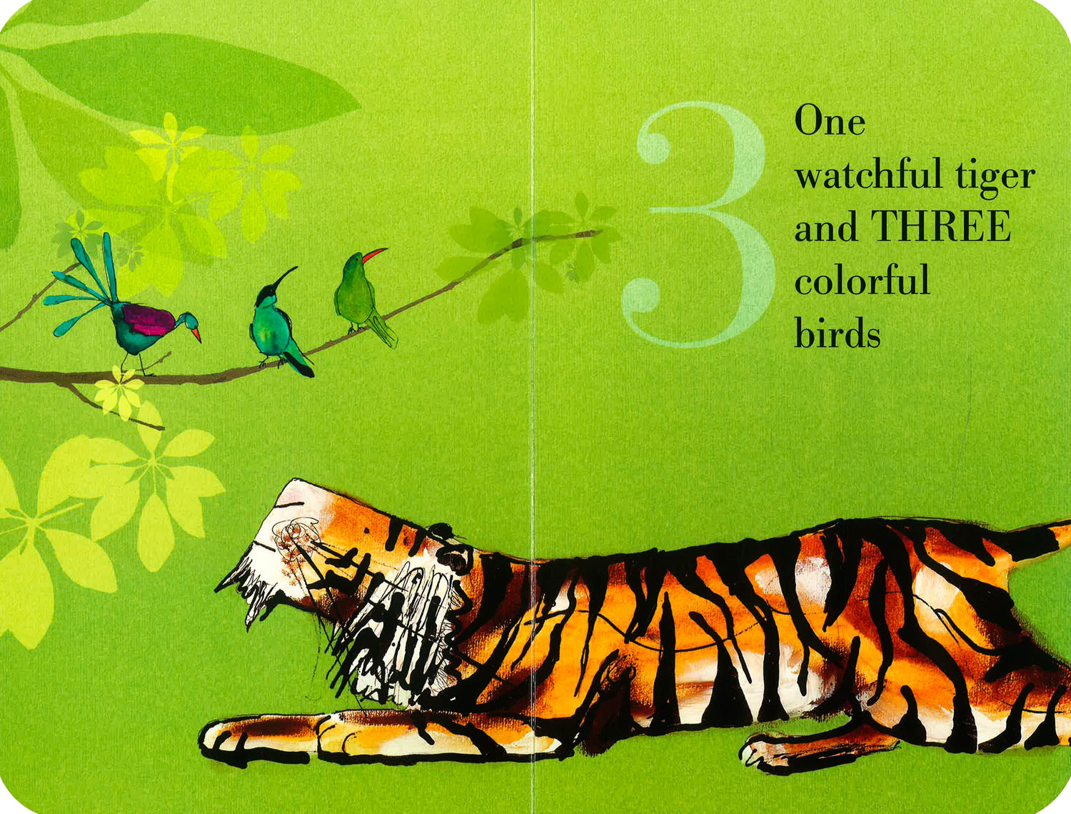 One tiger sits all alone, feeling sad. Then he finds two bright bugs, three colourful birds, and more, and soon he isn’t sad anymore. Children will learn to count from 1 to 10 as they travel with the tiger to each new adventure in this beautiful book of friendship.
