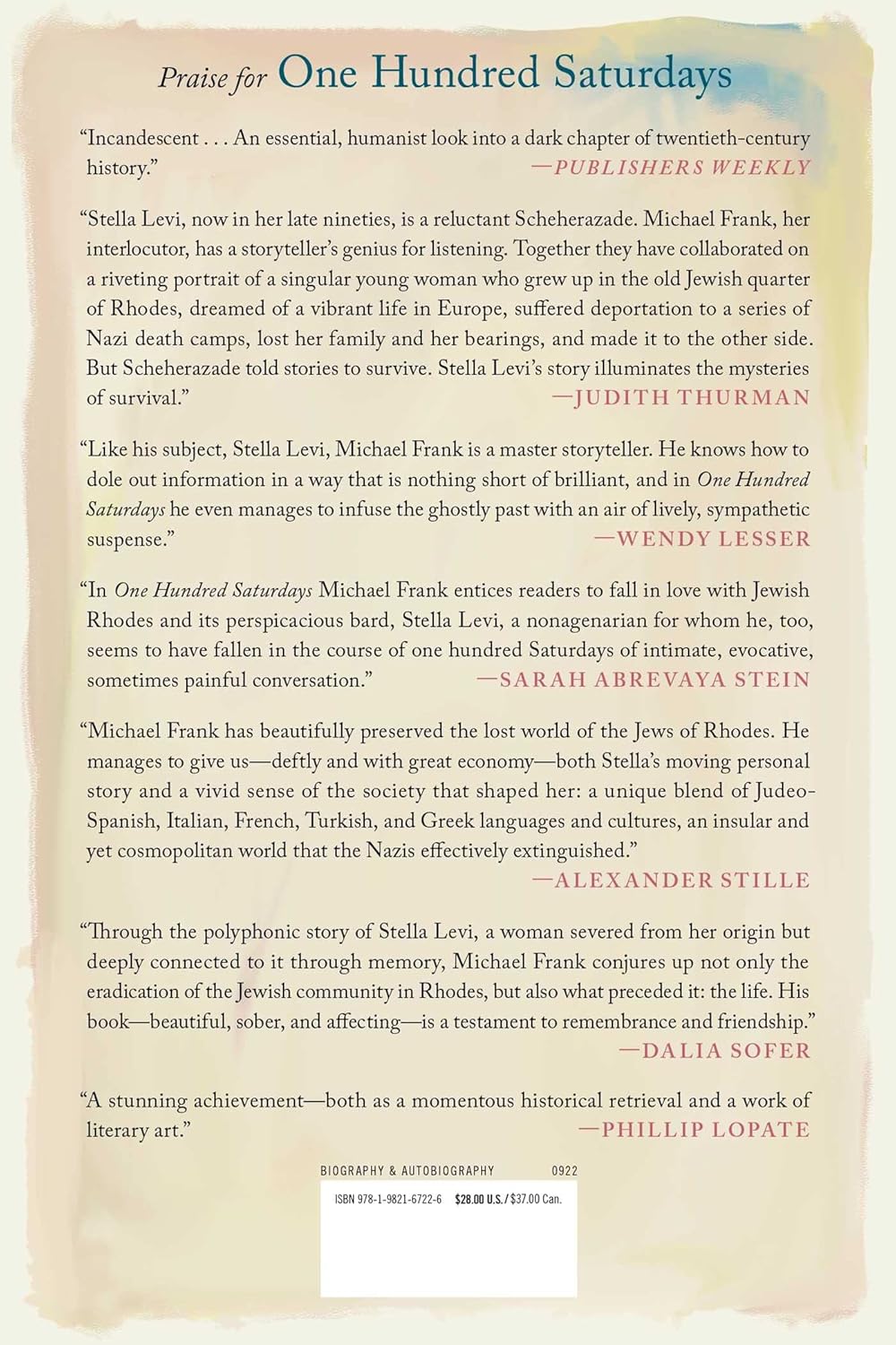 The remarkable story of ninety-nine-year-old Stella Levi whose conversations with the writer Michael Frank over the course of six years bring to life the vibrant world of Jewish Rhodes, the deportation to Auschwitz that extinguished ninety percent of her community, and the resilience and wisdom of the woman who lived to tell the tale.