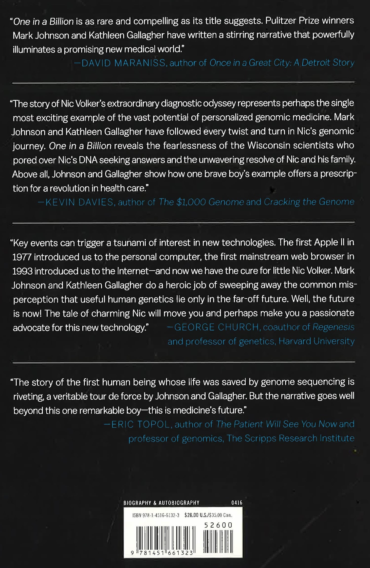 Pulitzer Prize–winning journalists Mark Johnson and Kathleen Gallagher chronicle the story of Nic Volker, the Wisconsin boy at the center of a daring breakthrough in medicine - a complete gene sequencing to discover the cure for an otherwise undiagnosable illness. At just two years old, Nic experienced a searing pain that signaled the awakening of a new and deadly disease, one that would hurl Nic and his family up against the limits of modern medicine.For years, through false starts and failed cures, Nic holds on to life, buoyed up by his mother’s fierce drive to get him the care he needs. But when even the world’s experts are stumped by Nic’s illness, his doctors come up with a radical, long-shot plan: a step into the unknown.The next major scientific frontier, following the completion of the Human Genome Project, was to figure out how to use our new knowledge to save lives - to bring genomic or personalized medicine into reality. It’s a quest that is undertaken by researchers around the world. But it is only when geneticist Howard Jacob hears about young Nic that the finish line finally comes into sight: It’s no longer a race to make history. It’s a race to save this boy’s life.One in a Billion is an unforgettable tale of the lives that converged to launch a medical revolution. As pioneering geneticist Mary-Claire King pronounced upon learning Nic’s story: “It was as if one had heard about Case Zero of AIDS and the cure, all at once.”