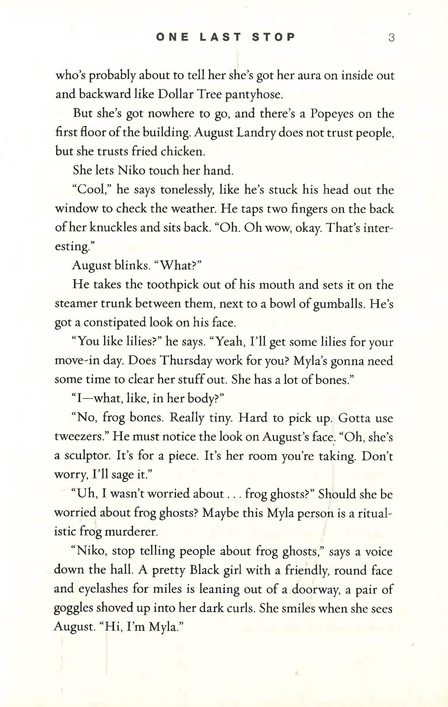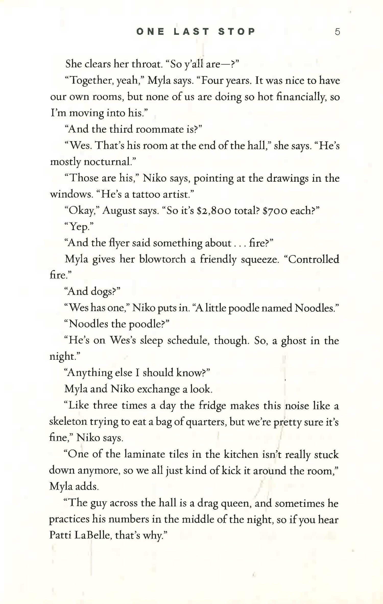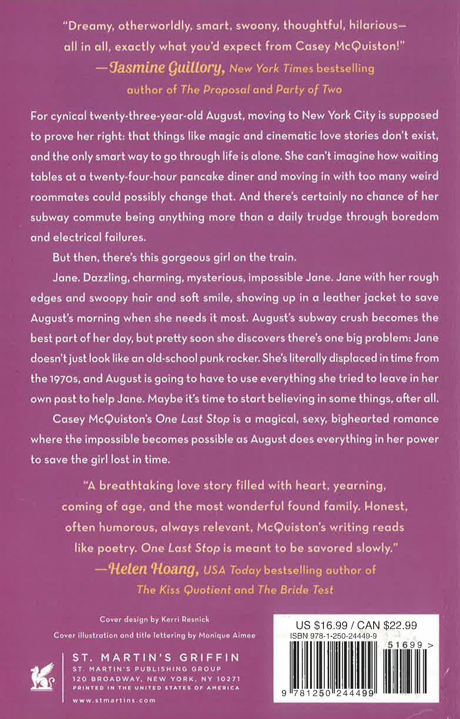 For cynical twenty-three-year-old August, moving to New York City is supposed to prove her right: that things like magic and cinematic love stories don't exist, and the only smart way to go through life is alone. She can't imagine how waiting tables at a 24-hour pancake diner and moving in with too many weird roommates could possibly change that. And there's certainly no chance of her subway commute being anything more than a daily trudge through boredom and electrical failures. But then, there's this gorgeous girl on the train. Jane. Dazzling, charming, mysterious, impossible Jane. Jane with her rough edges and swoopy hair and soft smile, showing up in a leather jacket to save August's day when she needed it most. August's subway crush becomes the best part of her day, but pretty soon, she discovers there's one big problem: Jane doesn't just look like an old school punk rocker. She's literally displaced in time from the 1970s, and August is going to have to use everything she tried to leave in her own past to help her. Maybe it's time to start believing in some things, after all. Casey McQuiston's One Last Stop is a magical, sexy, big-hearted romance where the impossible becomes possible as August does everything in her power to save the girl lost in time.