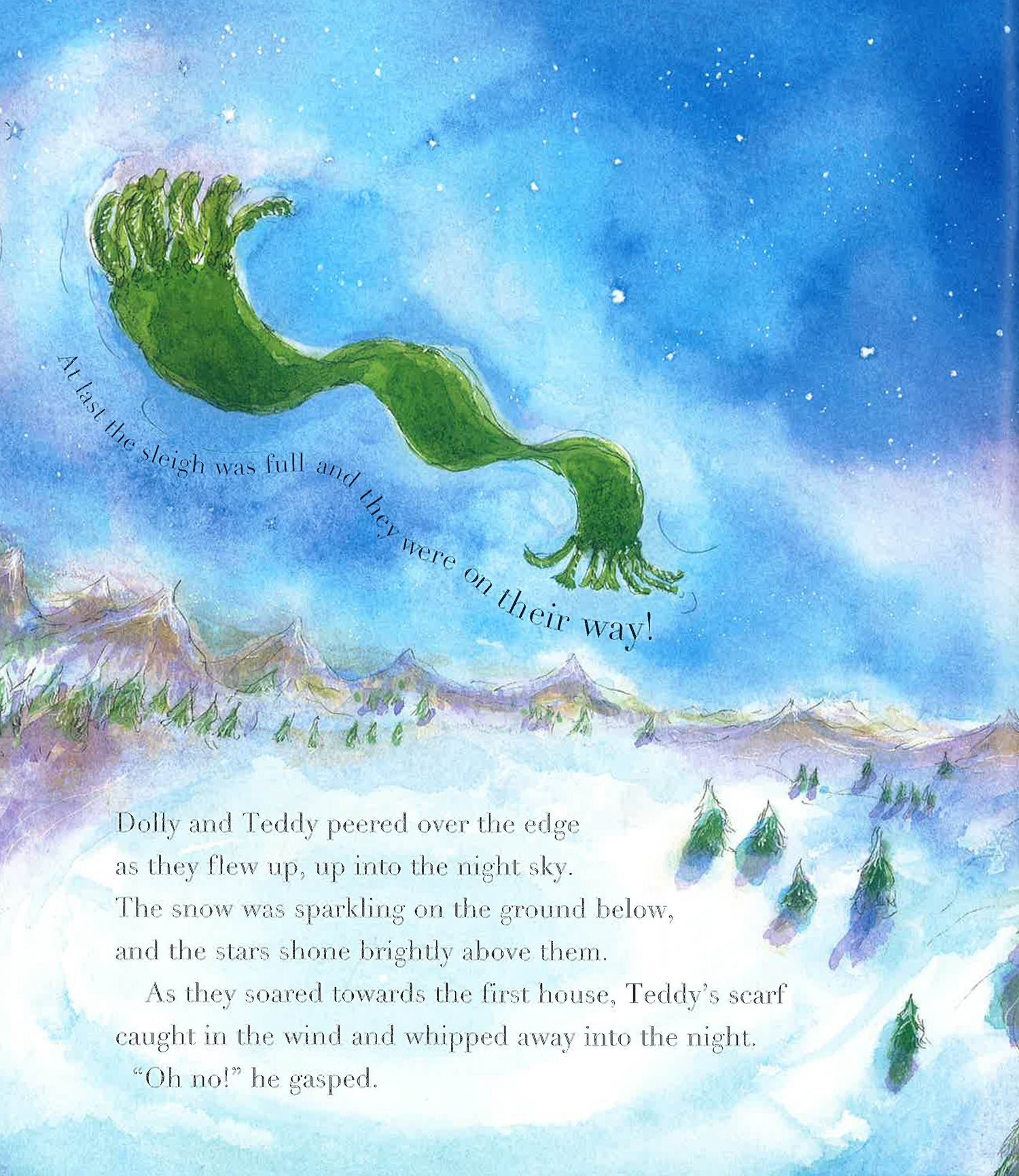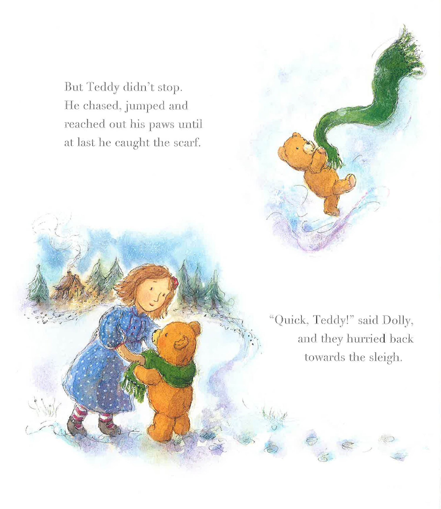 But oh no! Teddy loses his scarf, and when he chases after it, the sleigh leaves without them.