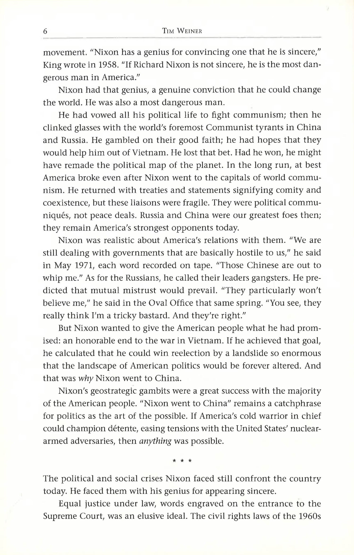 The New York Times Bestseller. A shocking and riveting look at one of the most dramatic and disastrous presidencies in US history, from Pulitzer Prize and National Book Award winner Tim Weiner. Based largely on documents declassified only in the last few years, One Man Against the World paints a devastating portrait of a tortured yet brilliant man who led the country largely according to a deep-seated insecurity and distrust of not only his cabinet and congress, but the American population at large. In riveting, tick-tock prose, Weiner illuminates how the Vietnam War and the Watergate controversy that brought about Nixon's demise were inextricably linked. From the hail of garbage and curses that awaited Nixon upon his arrival at the White House, when he became the president of a nation as deeply divided as it had been since the end of the Civil War, to the unprecedented action Nixon took against American citizens, who he considered as traitorous as the army of North Vietnam, to the infamous break-in and the tapes that bear remarkable record of the most intimate and damning conversations between the president and his confidantes, Weiner narrates the history of Nixon's anguished presidency in fascinating and fresh detail. A crucial new look at the greatest political suicide in history, One Man Against the World leaves us not only with new insight into this tumultuous period, but also into the motivations and demons of an American president who saw enemies everywhere, and, thinking the world was against him, undermined the foundations of the country he had hoped to lead.
