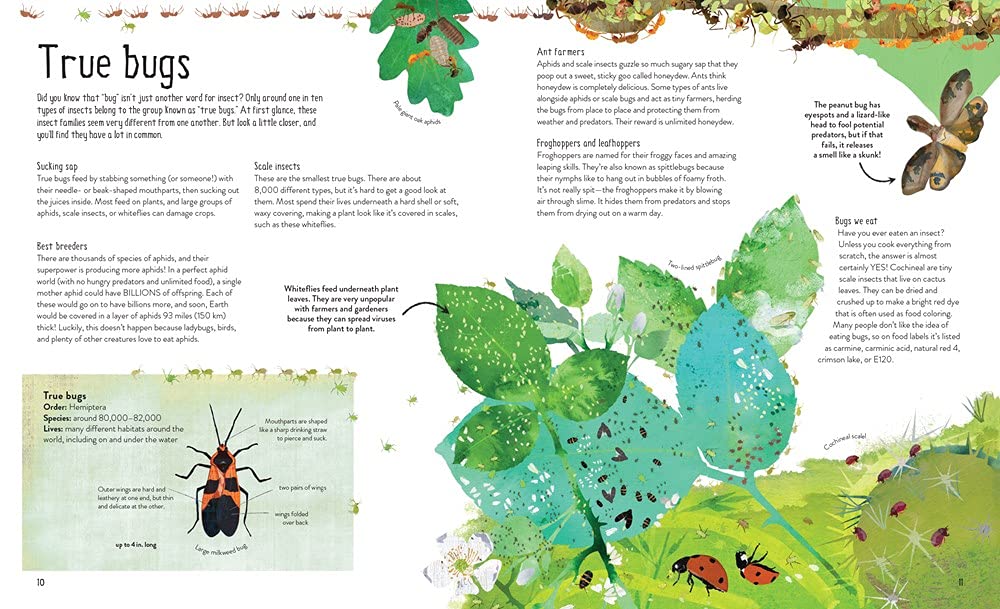 Broken down into sections exploring each of the main types of insect, each section takes a different, playfully visual approach to really capture the character of the insects in the order being explored. As well as including practical advice for observing insects safely, a section at the back of the book describes ways to help insects and encourage them into a garden no matter how small.