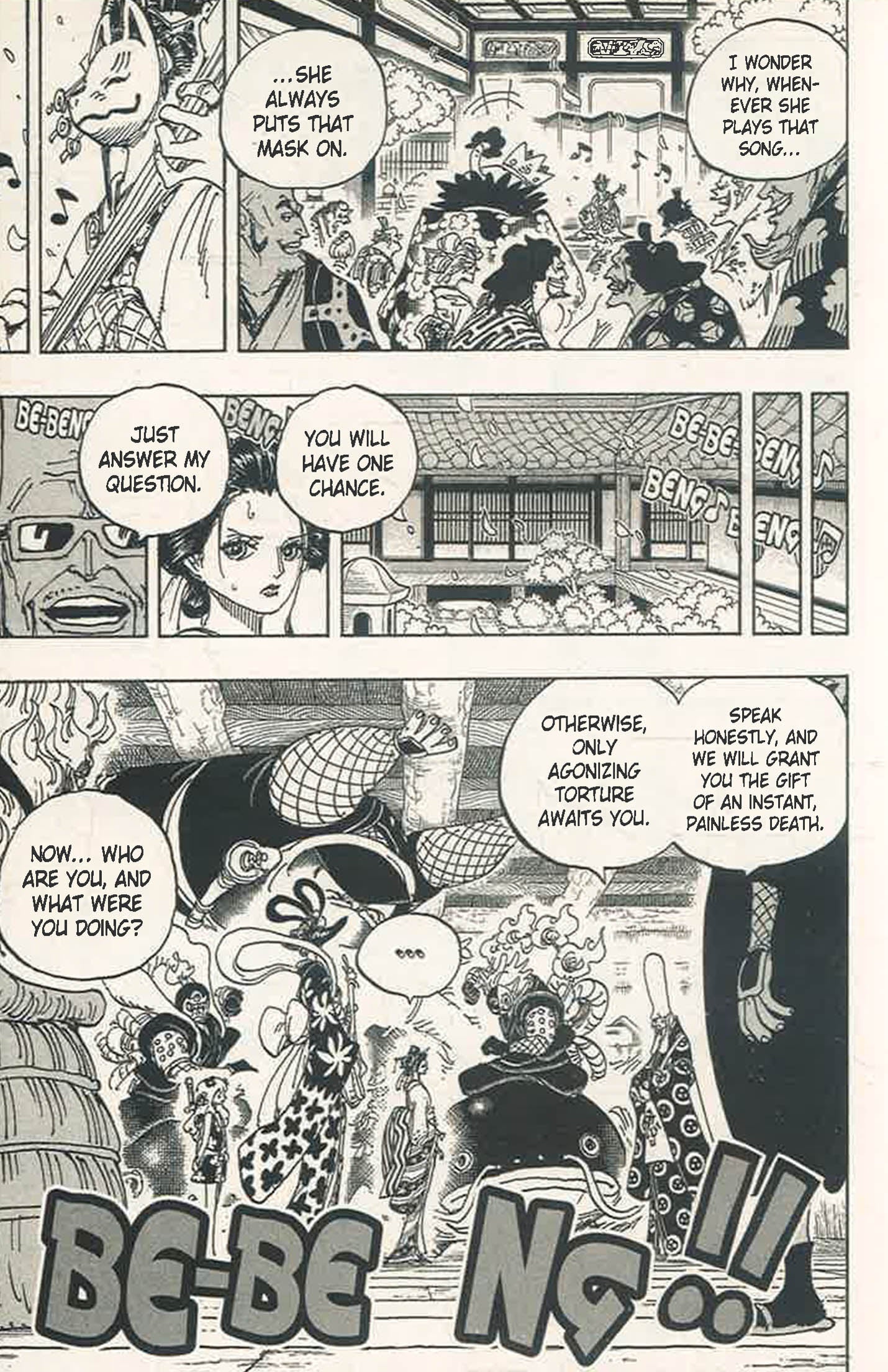 Robin infiltrates the Shogun’s palace in order to collect valuable intelligence, but she’s quickly spotted by Orochi's henchmen. Can she be ninja-like and make a stealthy escape? Meanwhile, after his painful defeat by Kaido, how will Luffy escape the excavation labor camp?!
