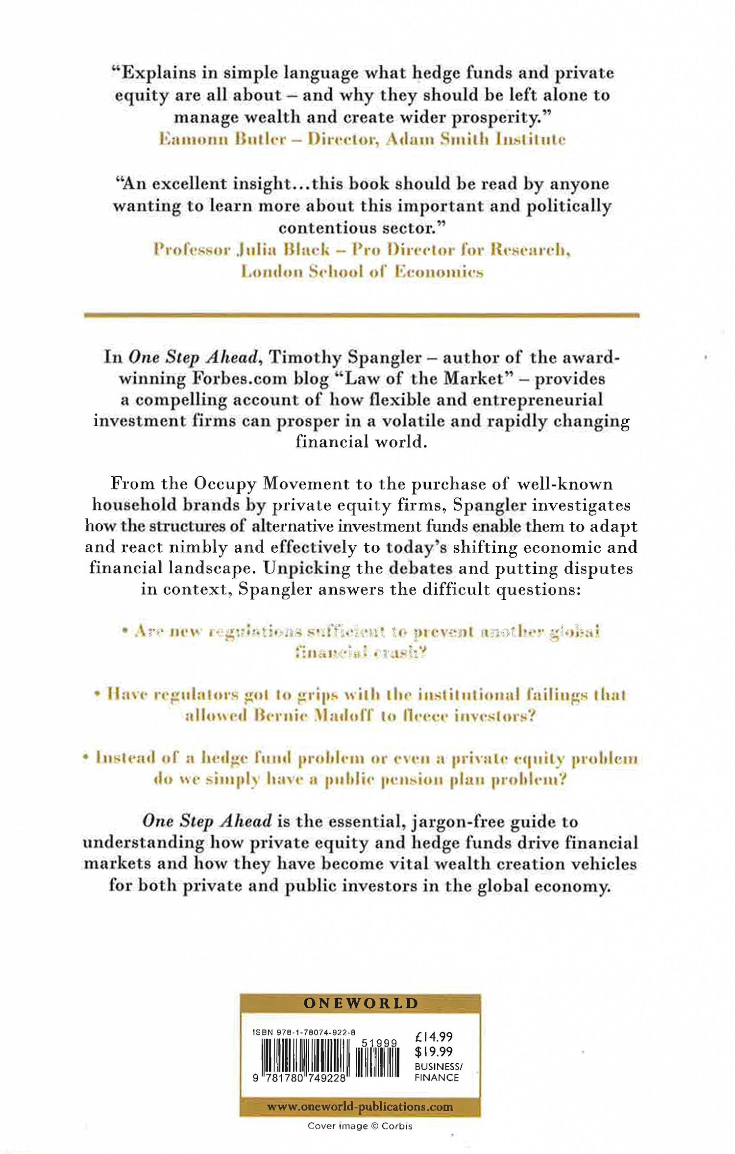 In One Step Ahead, Timothy Spangler - author of the award-winning Forbes.com blog "Law of the Market" - provides a compelling account of how flexible and entrepreneurial investment firms can prosper in a volatile and rapidly changing financial world. From the Occupy Movement to the purchase of well-known household brands by private equity firms, Spangler investigates how the structures of alternative investment funds enable them to adapt and react nimbly and effectively to today's shifting economic and financial landscape. Unpicking the debates and putting disputes in context, Spangler answers the difficult questions: Are new regulations sufficient to prevent another global financial crash?Have regulators got to grips with the institutional failings that allowed Bernie Madoff to fleece investors?Instead of a hedge fund problem or even a private equity problem do we simply have a public pension plan problem? One Step Ahead is the essential, jargon-free guide to understanding how private equity and hedge funds drive financial markets and how they have become vital wealth creation vehicles for both private and public investors in the global economy.