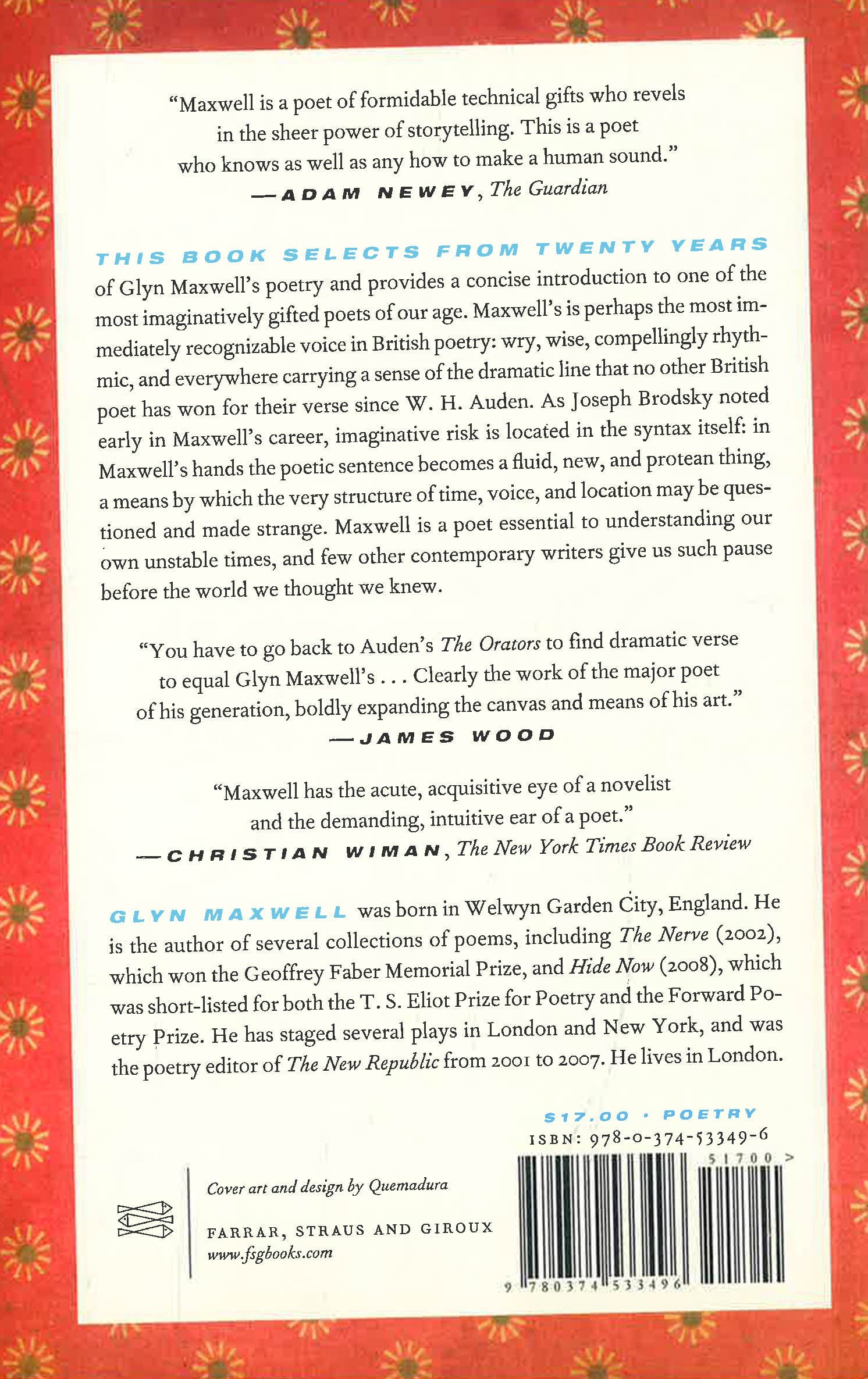The poems of Glyn Maxwell possess a slow, quiet fire. They refrain from grand gestures, from loud proclamations of emotion. Instead, Maxwell unveils these emotions gently, quietly, intricately--like little postcards in a waxed envelope. Each of his poems is Blake's "world in a grain of sand." Maxwell's works reveal very little about their subjects; there are, rather, merely the faintest, well-chosen hints of quotidian life: a man kills a wasp; a man falls in and out of love; a man escapes from an unnamed pursuer. But from these suggestive fragments, it is possible to extrapolate an entire world.