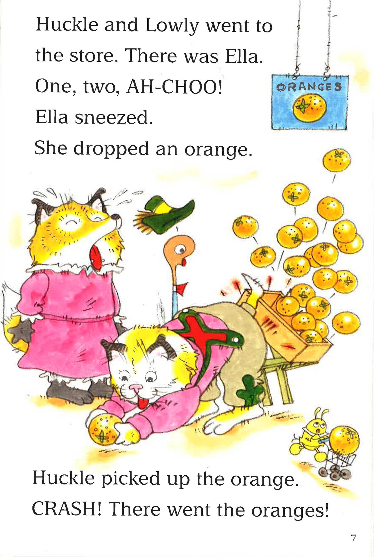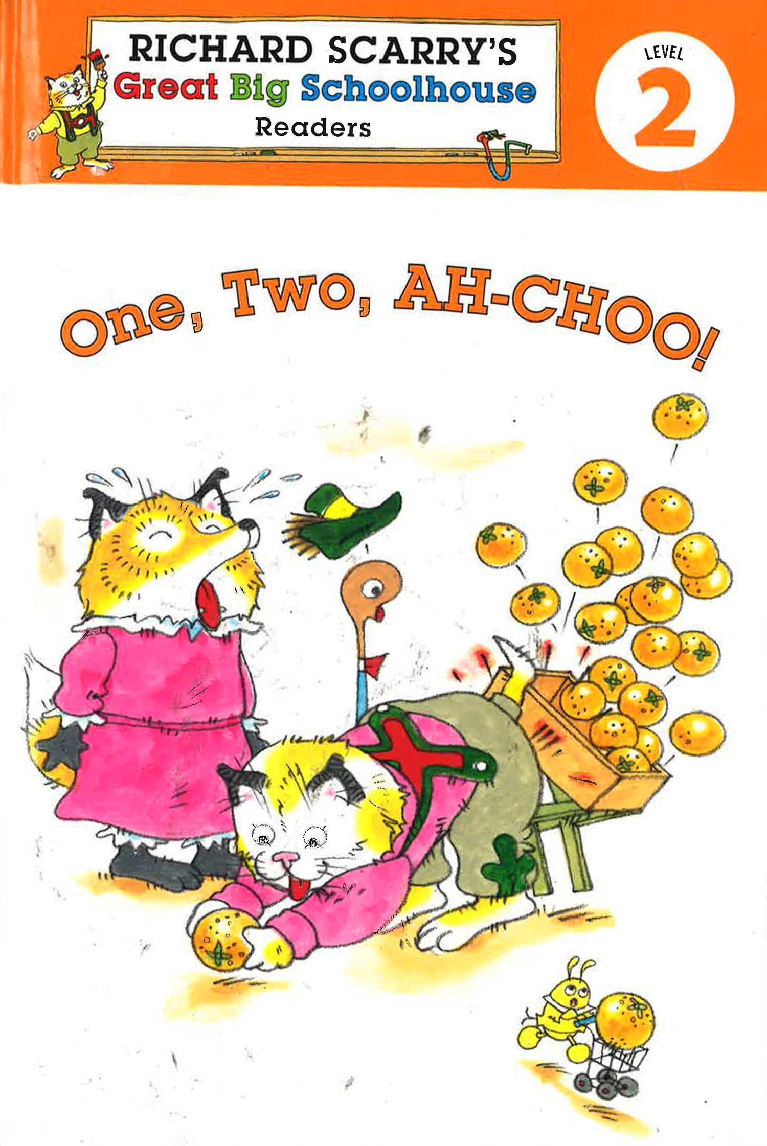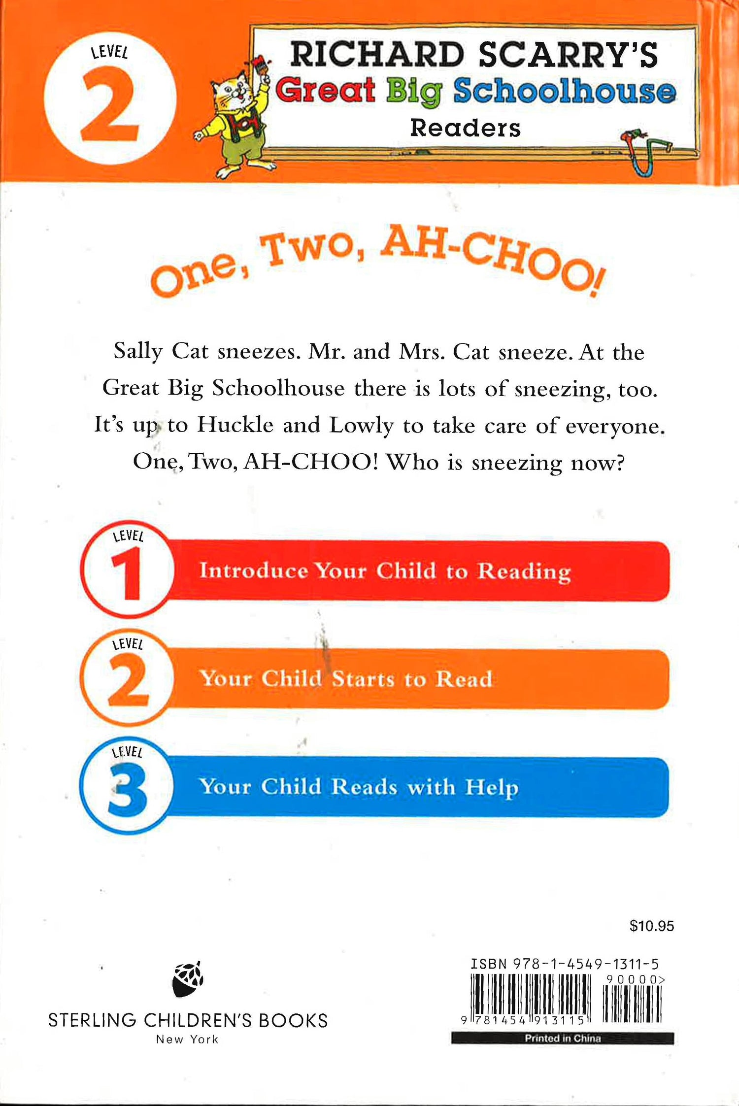 Sally Cat sneezes. Mr. and Mrs. Cat sneeze. At the Great Big Schoolhouse there is lots of sneezing, too. It's up to Huckle and Lowly to take care of everyone. One, Two, Ah-Choo! Who is sneezing now?