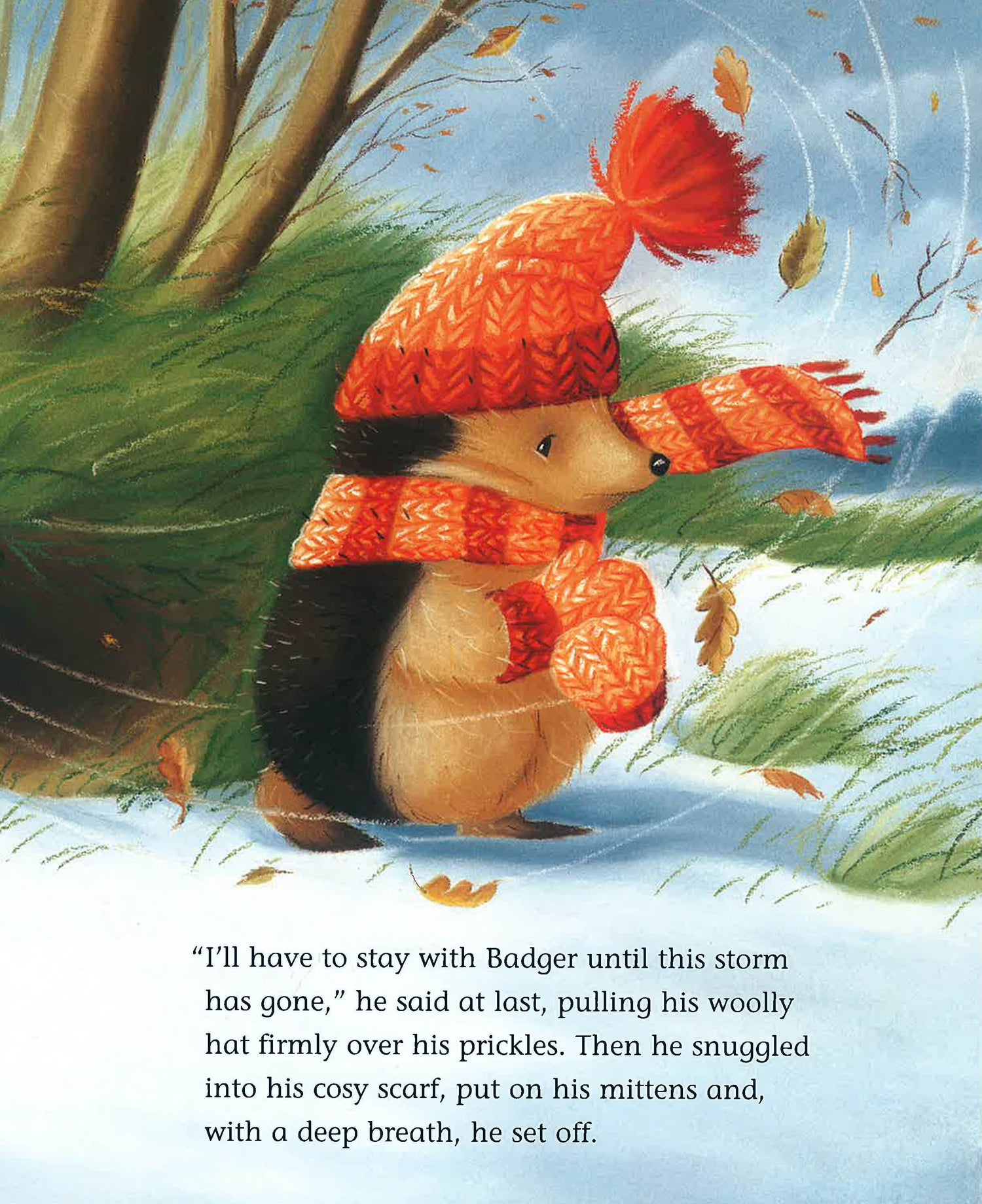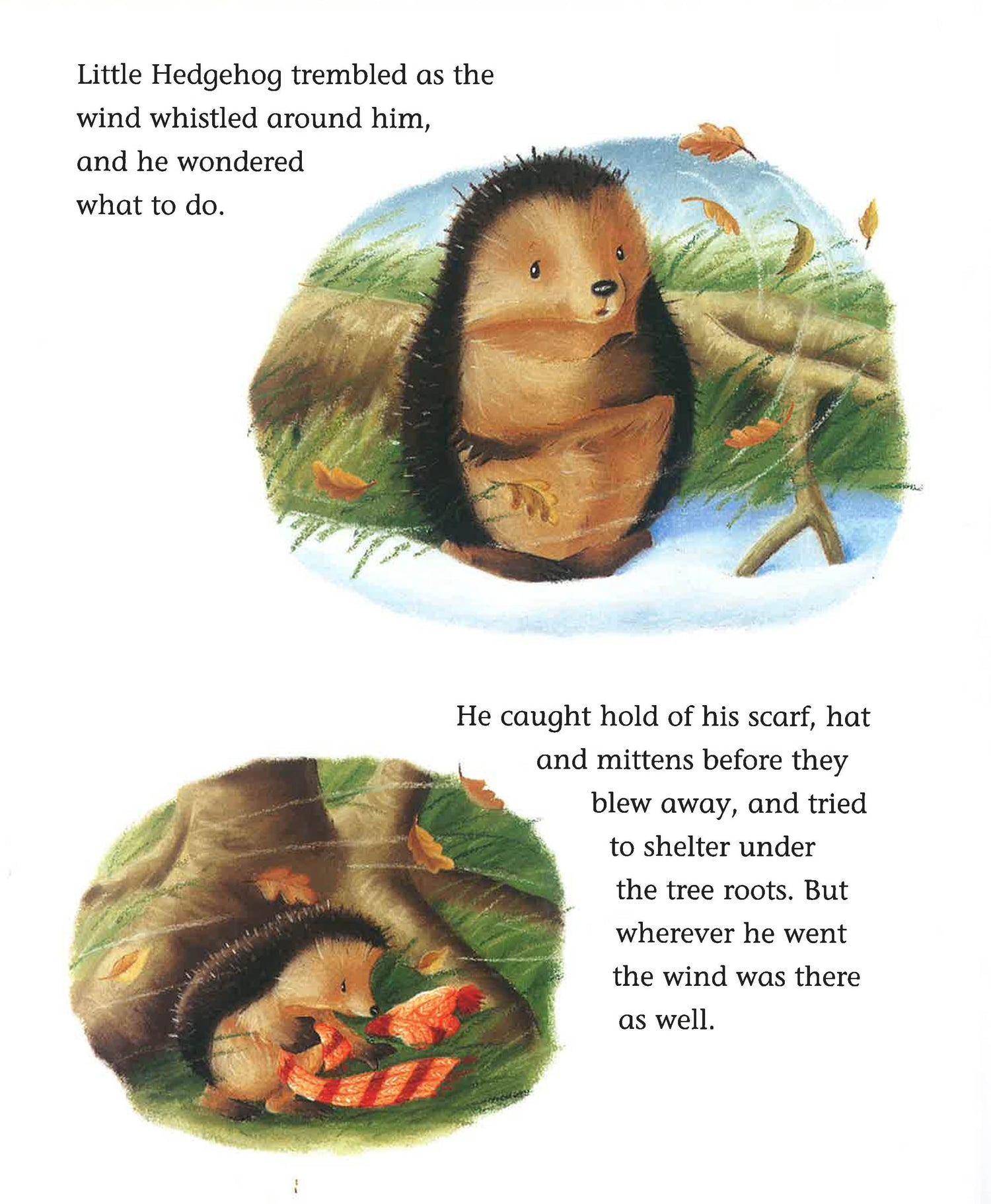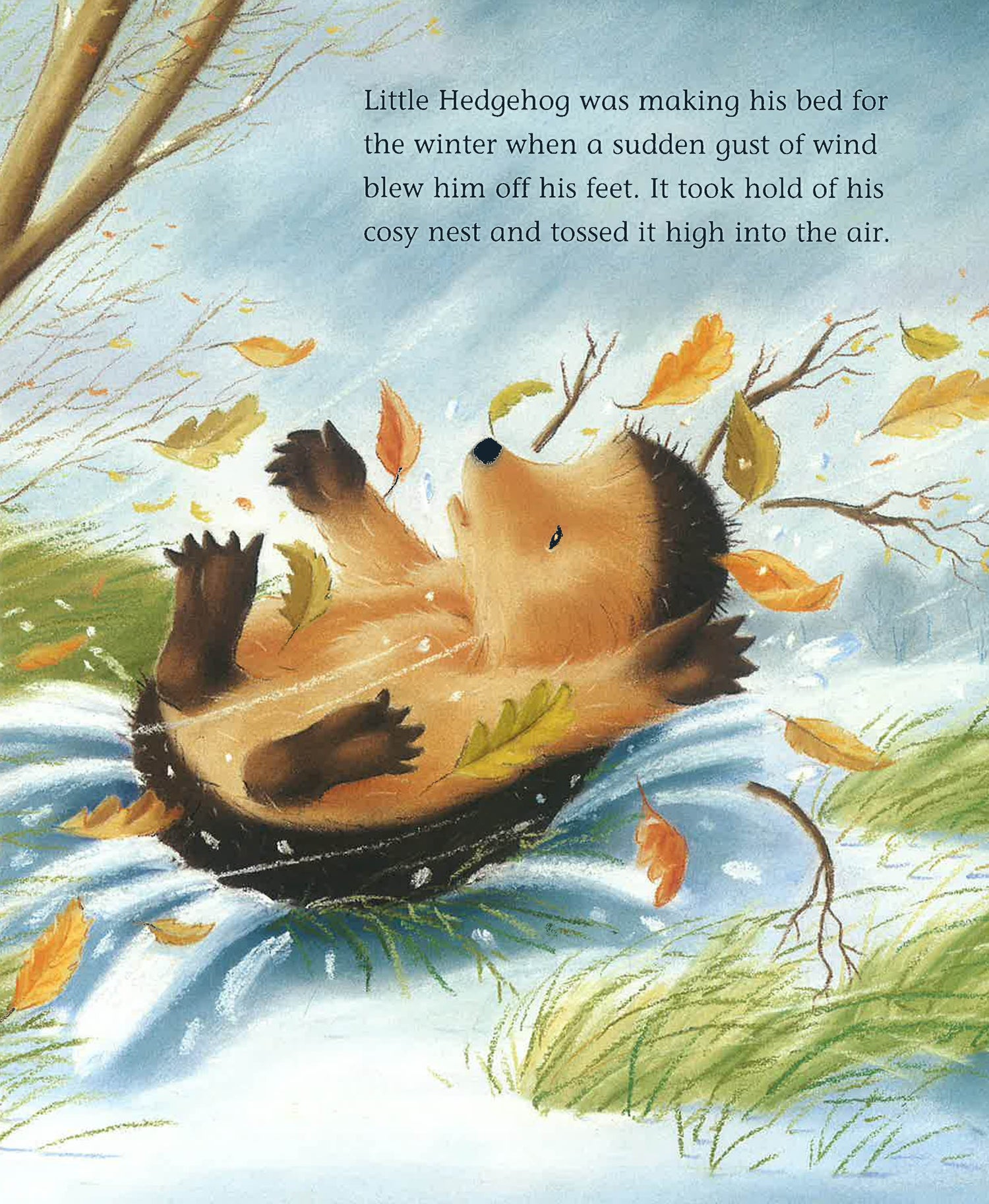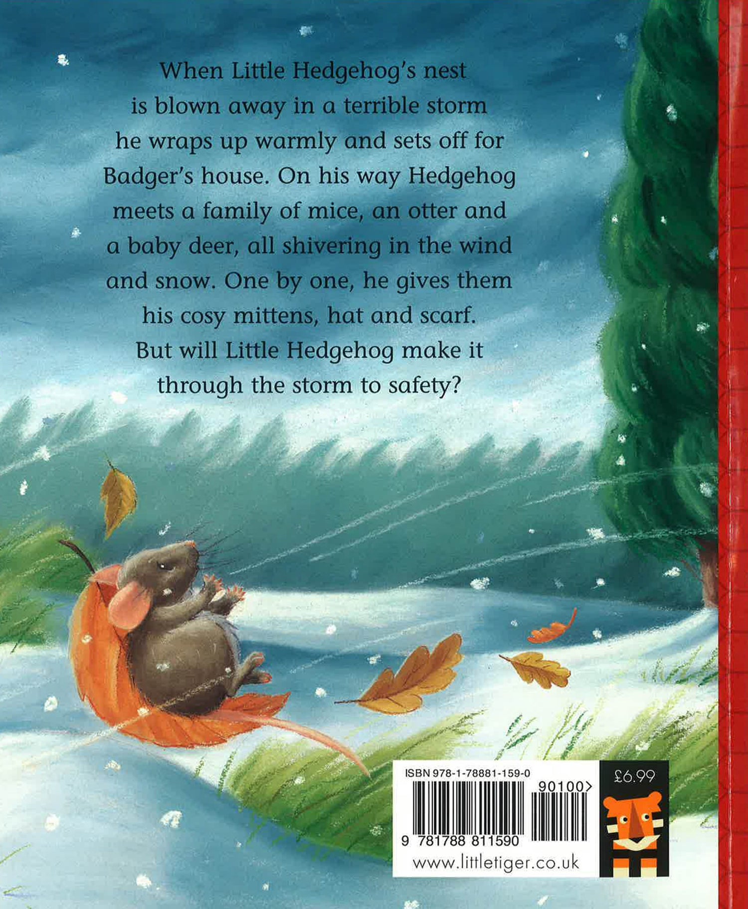 When Little Hedgehog's nest is blown away in a terrible storm he wraps up warmly and sets off for Badger's house. On his way Hedgehog meets a family of mice, an otter and a baby dee, all shivering in the wind and snow. One by one, he gives then his cosy mittens, hat and scarf. But will Little Hedgehog make it through the storm to safety?