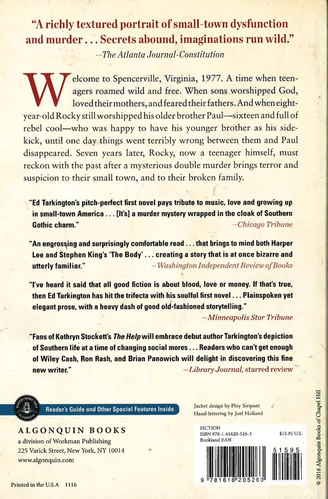 Welcome to Spencerville, Virginia, 1977. Eight-year-old Rocky worships his older brother, Paul. Sixteen and full of rebel cool, Paul spends his days cruising in his Chevy Nova blasting Neil Young, cigarette dangling from his lips, arm slung around his beautiful, troubled girlfriend. Paul is happy to have his younger brother as his sidekick. Then one day, in an act of vengeance against their father, Paul picks up Rocky from school and nearly abandons him in the woods. Afterward, Paul disappears.Seven years later, Rocky is a teenager himself. He hasn’t forgotten being abandoned by his boyhood hero, but he’s getting over it, with the help of the wealthy neighbors’ daughter, ten years his senior, who has taken him as her lover. Unbeknownst to both of them, their affair will set in motion a course of events that rains catastrophe on both their families. After a mysterious double murder brings terror and suspicion to their small town, Rocky and his family must reckon with the past and find out how much forgiveness their hearts can hold.