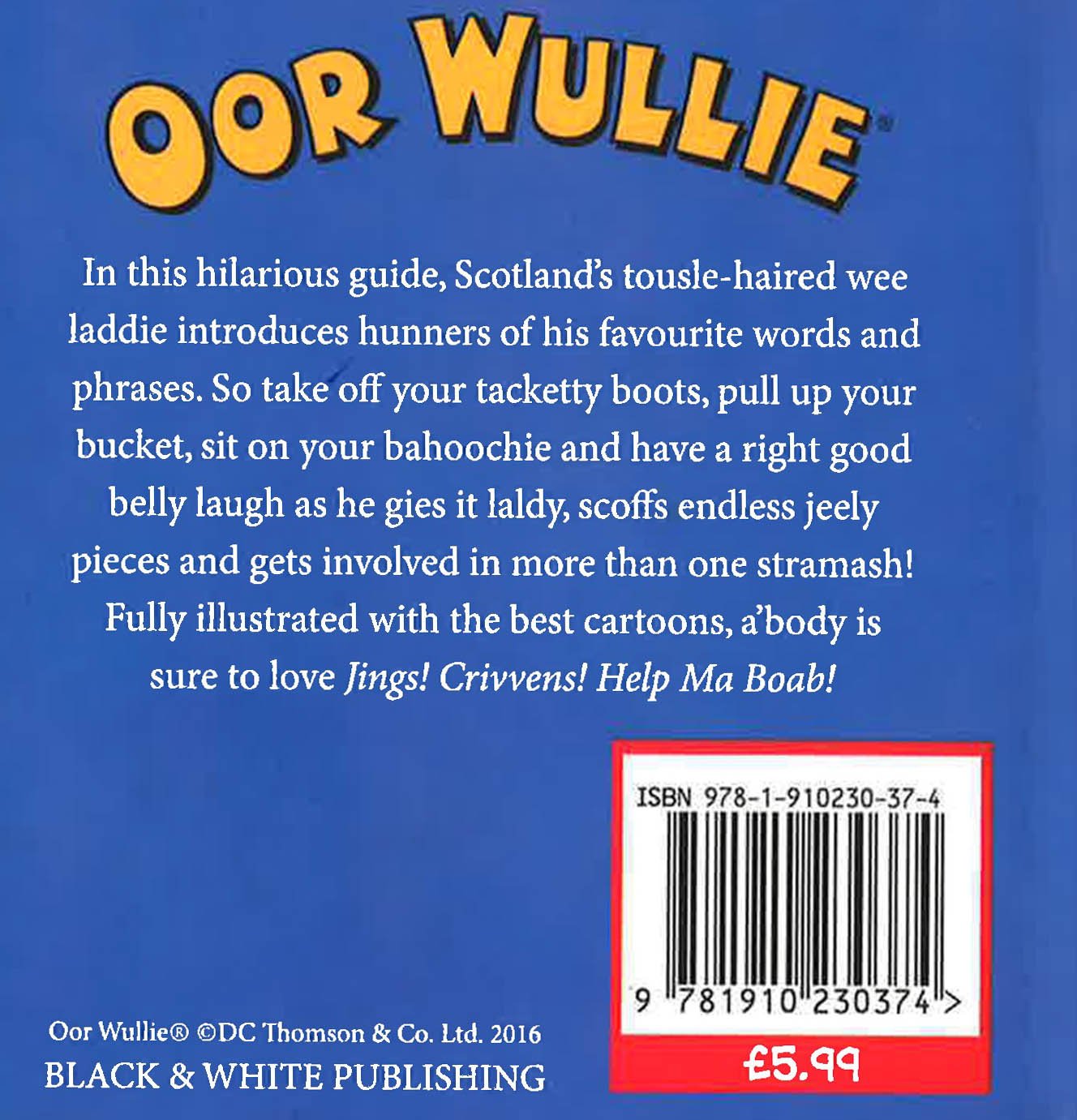 In this hilarious guide, Scotland's tousle-haired wee laddie introduces hunners of his favourite words and phrases. So take off your tacketty boots, pull up your bucket, sit on your bahoochie and have a right good belly laugh as he gies it laldy, scoffs endless jeely pieces and gets involved in more than one stramash! Fully illustrated with the best cartoons, a'body is sure to love Jings! Crivvens! Help Ma Boab!