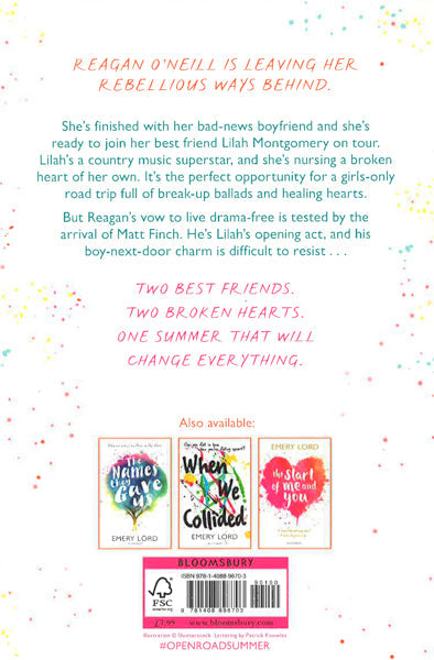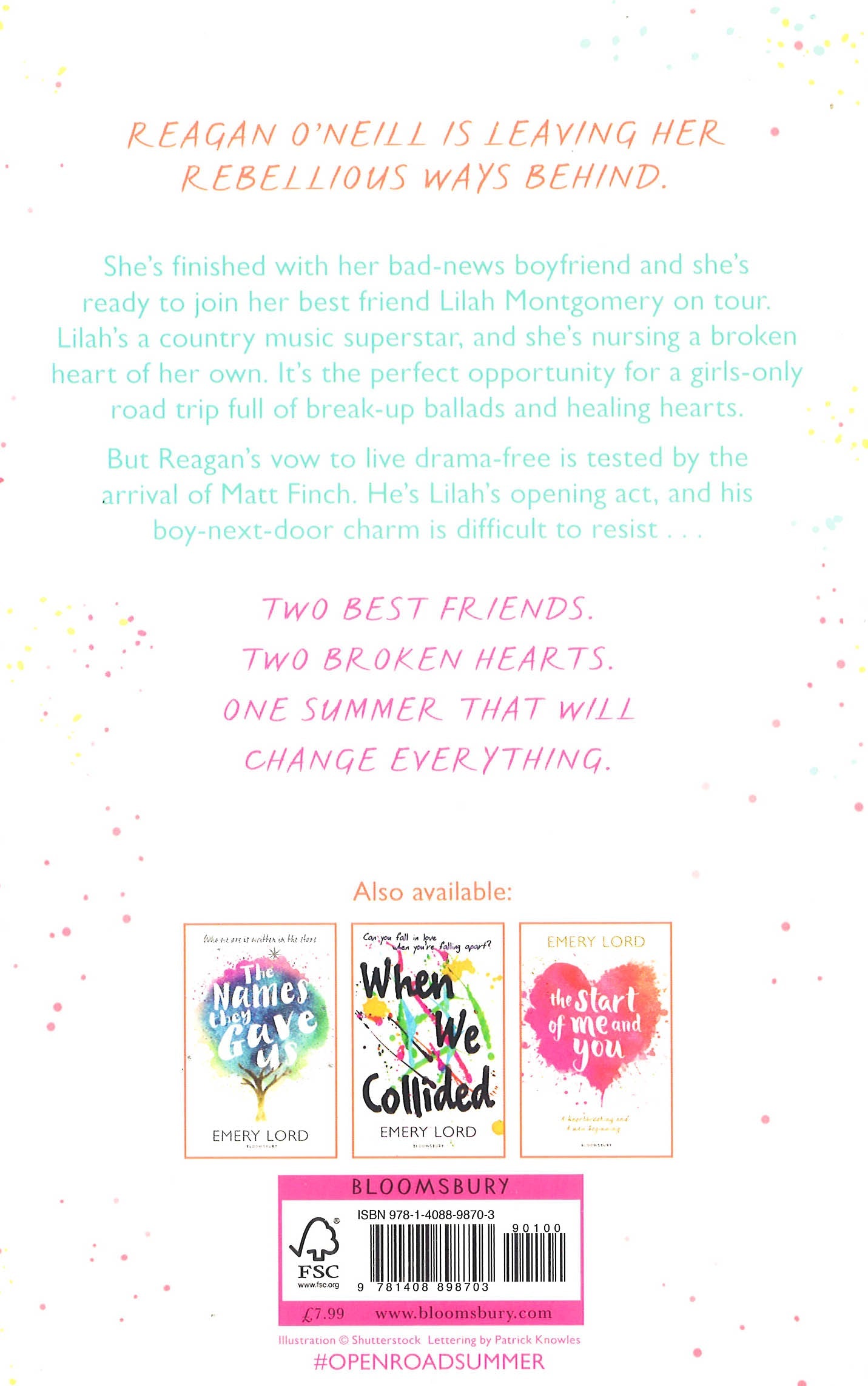 A contemporary romance that hits all the right notes - the gorgeous first novel by Emery Lord, author of When We Collided, The Names They Gave Us and the Zoella & Friends 2017 Book Club title The Start of Me and You. After finishing with her bad-news boyfriend, Reagan O'Neill is ready to leave her rebellious ways behind. Reagan's best friend and country superstar Lilah Montgomery is about to kick off her 24-city tour, and Lilah is nursing a broken heart of her own - so this is a perfect opportunity for a girls-only summer of break-up ballads and healing hearts. But when Matt Finch joins the tour as its opening act, his boy-next-door charm proves difficult for Reagan to resist, despite her vow to live a drama-free existence ... This summer, Reagan and Lilah will navigate the ups and downs of fame and friendship as they come to see that giving your heart to the right person is always a risk worth taking. Perfect for fans of Jennifer Niven, Jandy Nelson and Rainbow Rowell. A contemporary romance that hits all the right notes - the gorgeous first novel by Emery Lord, author of When We Collided, The Names They Gave Us and the Zoella & Friends 2017 Book Club title The Start of Me and You. After finishing with her bad-news boyfriend, Reagan O'Neill is ready to leave her rebellious ways behind. Reagan's best friend and country superstar Lilah Montgomery is about to kick off her 24-city tour, and Lilah is nursing a broken heart of her own - so this is a perfect opportunity for a girls-only summer of break-up ballads and healing hearts. But when Matt Finch joins the tour as its opening act, his boy-next-door charm proves difficult for Reagan to resist, despite her vow to live a drama-free existence ... This summer, Reagan and Lilah will navigate the ups and downs of fame and friendship as they come to see that giving your heart to the right person is always a risk worth taking. Perfect for fans of Jennifer Niven, Jandy Nelson and Rainbow Rowell.