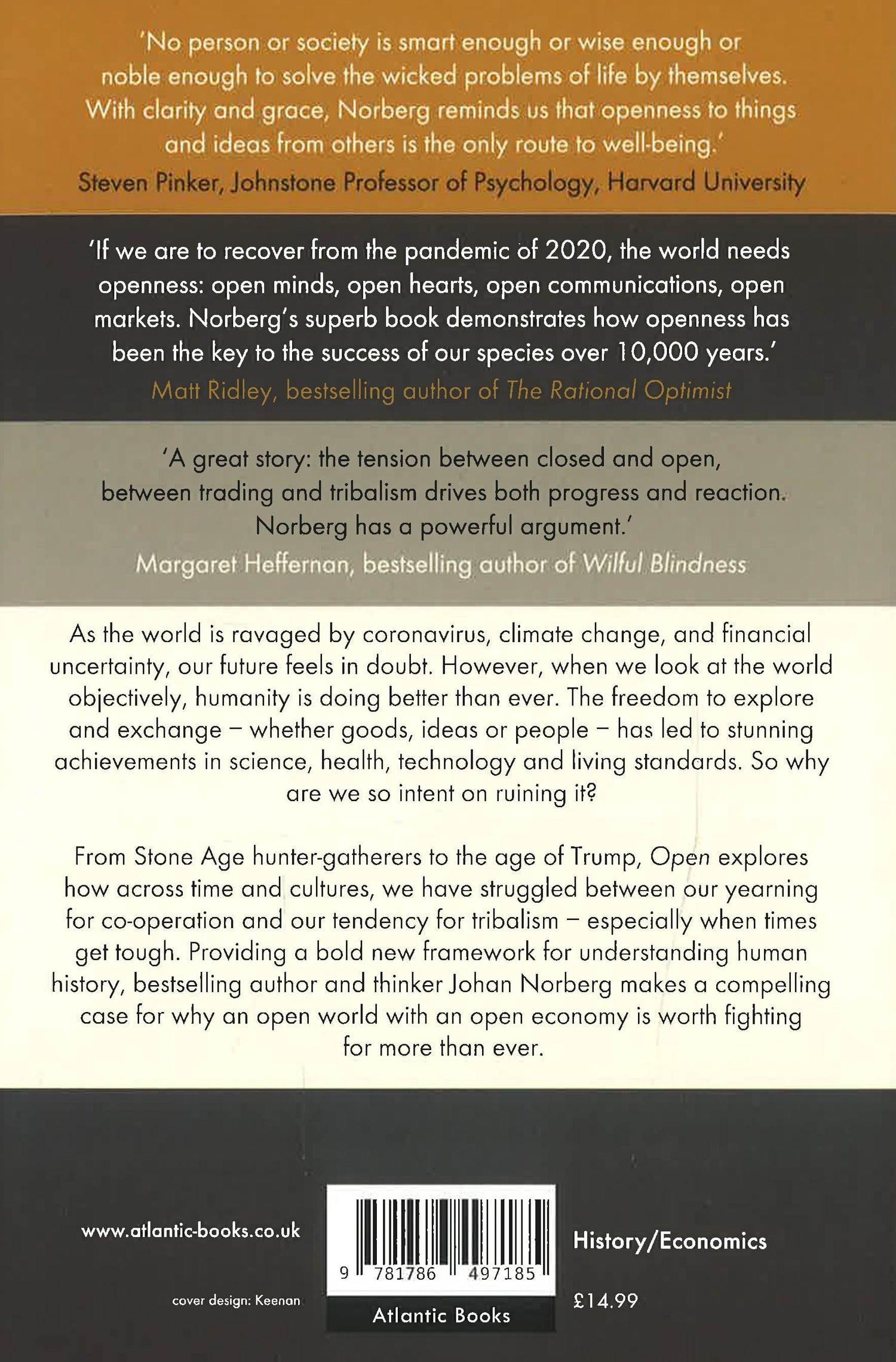 AN ECONOMIST BOOK OF THE YEARHumanity's embrace of openness is the key to our success. The freedom to explore and exchange - whether it's goods, ideas or people - has led to stunning achievements in science, technology and culture. As a result, we live at a time of unprecedented wealth and opportunity. So why are we so intent on ruining it?From Stone Age hunter-gatherers to contemporary Chinese-American relations, Open explores how across time and cultures, we have struggled with a constant tension between our yearning for co-operation and our profound need for belonging. Providing a bold new framework for understanding human history, bestselling author and thinker Johan Norberg examines why we're often uncomfortable with openness - but also why it is essential for progress. Part sweeping history and part polemic, this urgent book makes a compelling case for why an open world with an open economy is worth fighting for more than ever.