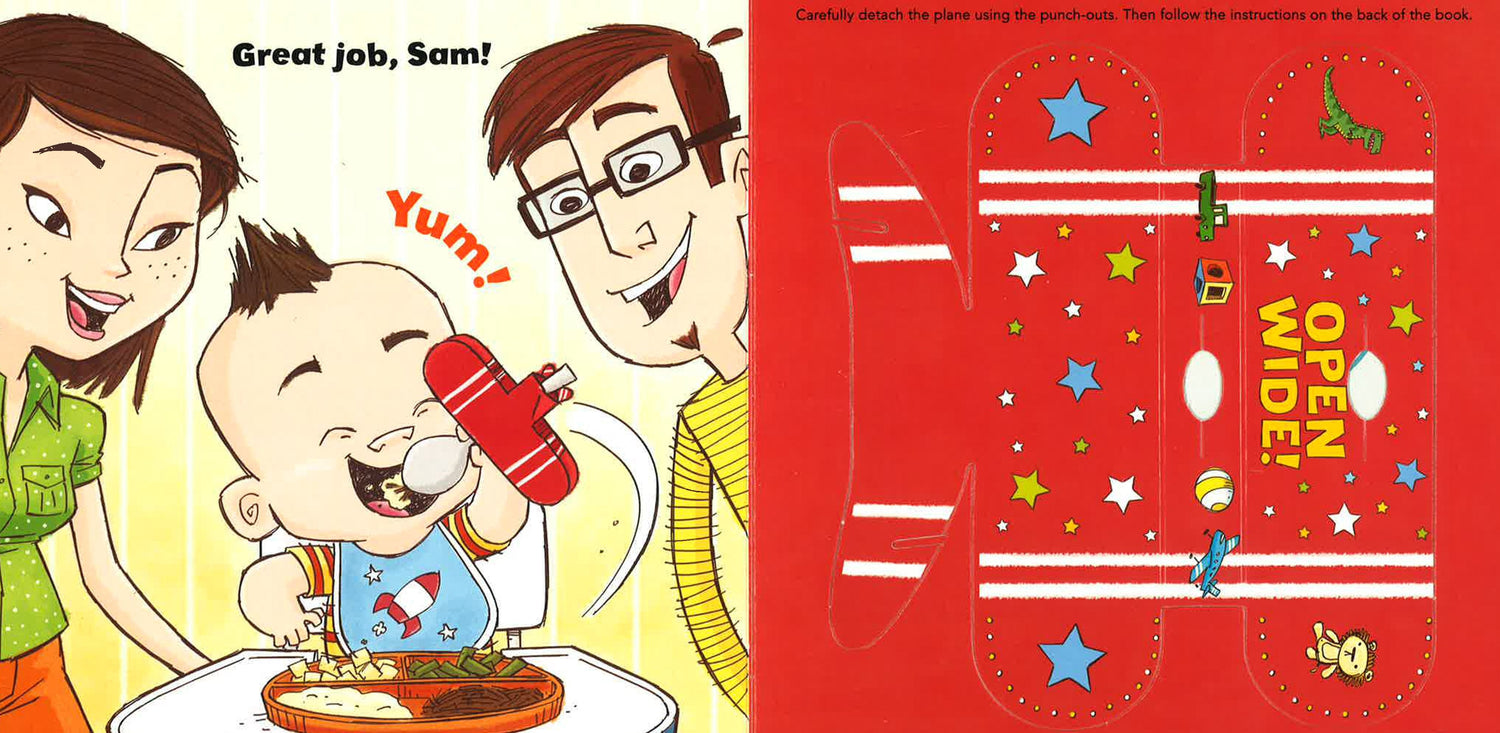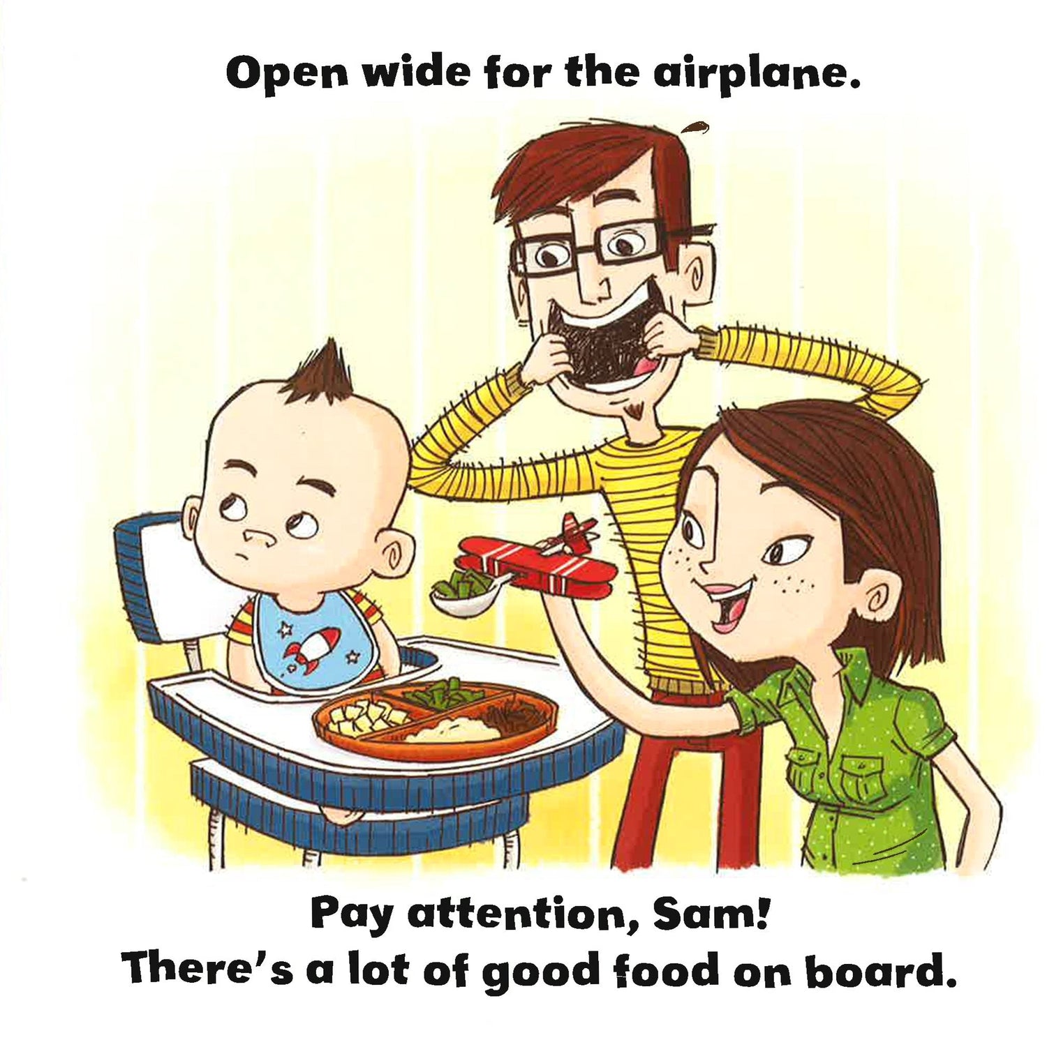 Get ready to chow down in this hilarious board book with a free punch-out paper airplane! Picky eating is a common occurrence in many households, but this charming story turns this topic on its head as little Sam's refusal to eat changes a simple dinnertime meal into a hilarious display of silly parental antics! Laugh out loud as Sam's dad becomes an elephant, flies around the room like an airplane, and performs more daring tricks to try to get Sam to eat! OPEN WIDE! is a familiar picky eating story with a humorous and satisfying surprise ending. Includes a punch-out paper airplane that children can put on their spoons, just like Sam's!