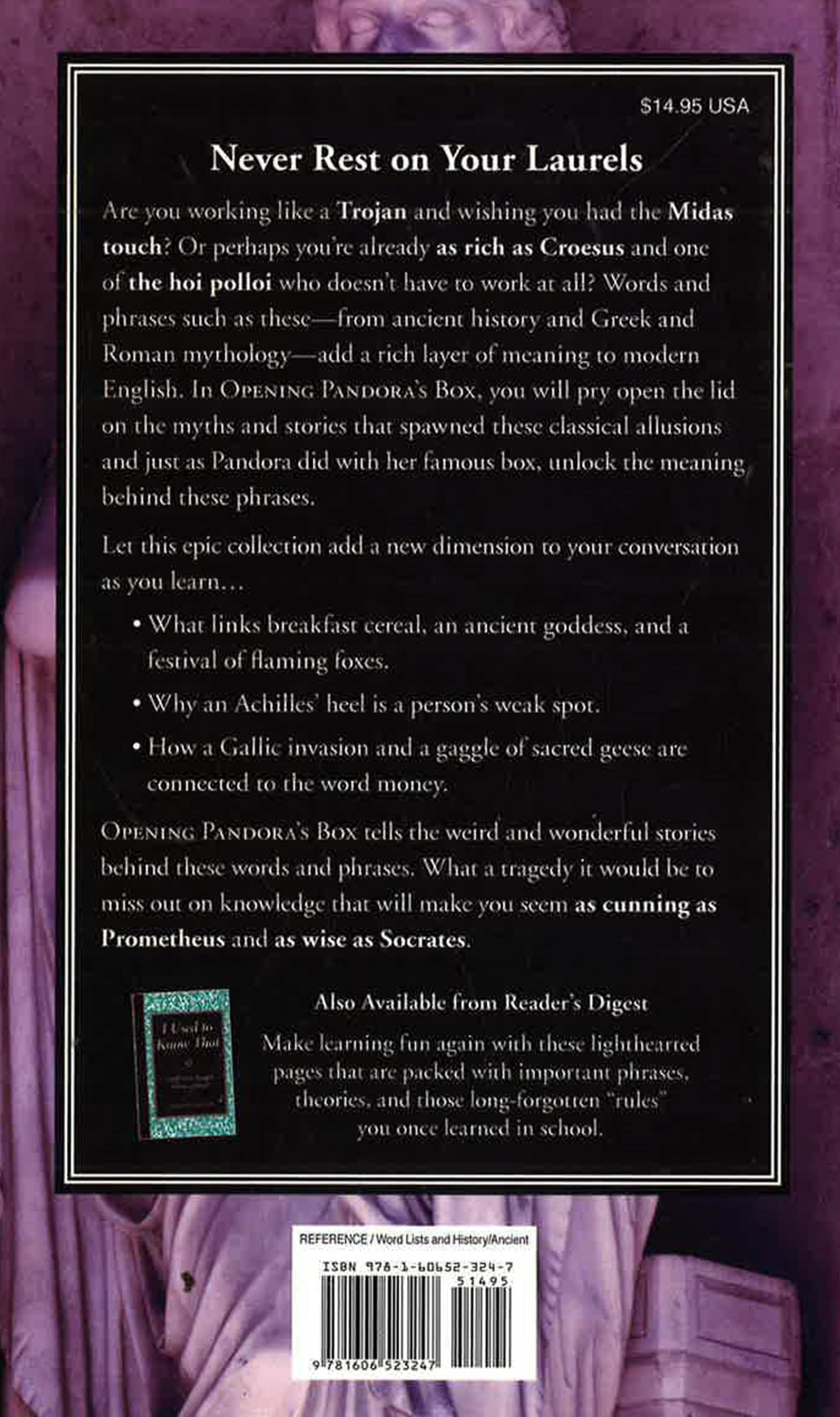 Are you known to strike like a thunderbolt when things don't go your way? Are you fortunate enough to have the Midas touch? Have you ever been struck by Cupid's arrow? Classically derived expressions are commonly used in our everyday language, yet many of us have little knowledge of the Greek and Roman influences that inspired them. With "Opening Pandora's Box" you'll discover the fascinating stories behind familiar phrases like Achilles' Heel, a Nemesis, To Fly too Close to the Sun, and more. For example, did you know that... The lifesaving operation known as the Caesarean section is so named because Julius Caesar was delivered by being cut out of his mother's womb?The original labyrinth was built on the orders of King Minos of Crete after Aphrodite cursed his wife to fall in love with a bull and produce a monstrous baby? The king locked the baby in a maze so complicated and tangled that, once in, he would never emerge.The word cereal is derived from the Italian corn goddess Ceres?Pry open the lid of the English language to find the secrets behind classical phrases we use every day.