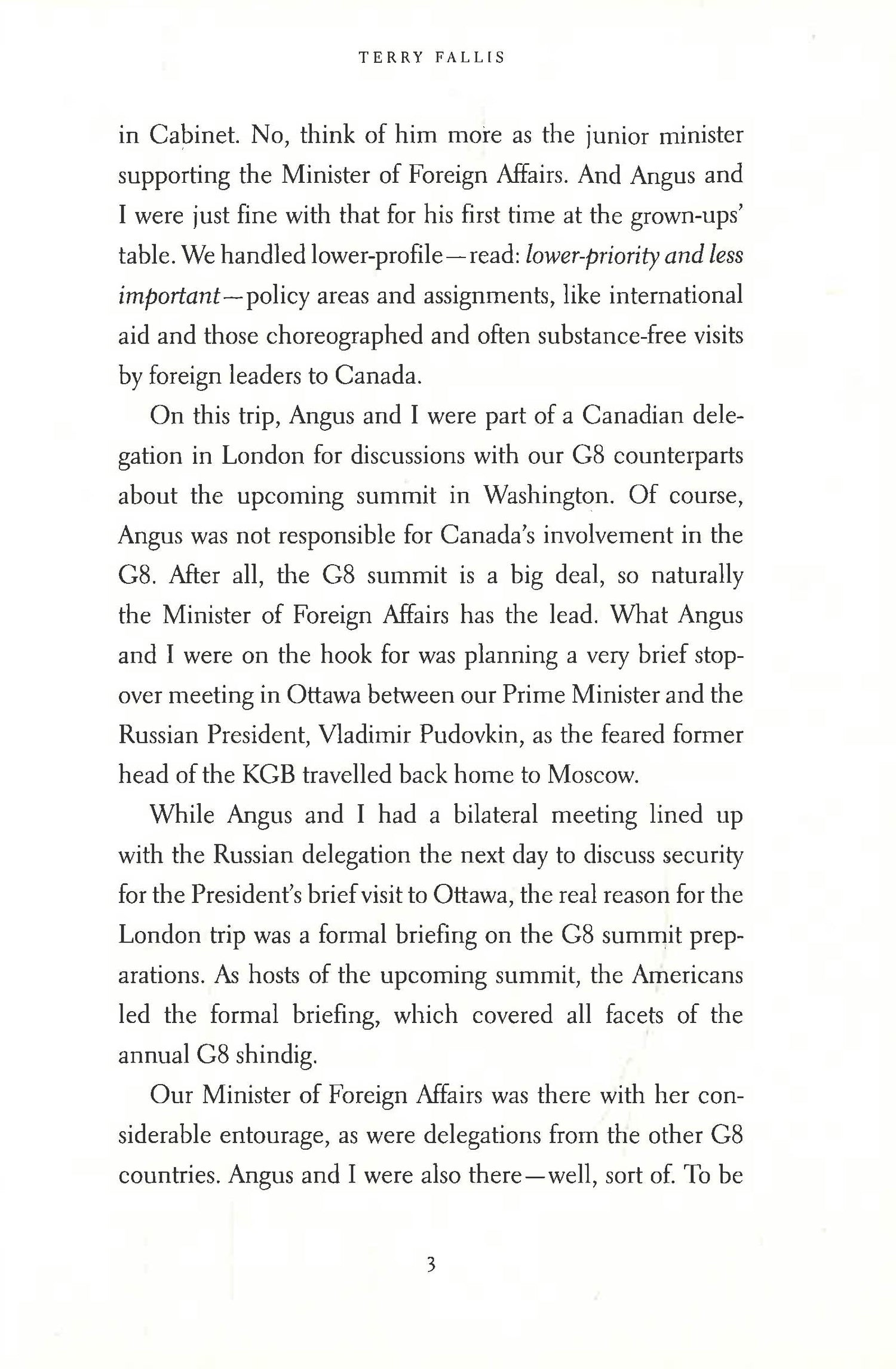 Angus McLintock, accidental Member of Parliament, has won re-election and is now the Minister of State for International Relations—or, in other words, he's the junior global affairs minister. In this new post, he and his trusty Chief of Staff, Daniel Addison, are in London to meet with their international counterparts to discuss the upcoming G8 Summit in Washington. Unfortunately, Angus is not in charge of Canada's involvement in the summit—that task falls to the actual Global Affairs Minister, not the junior one. What Angus is responsible for is planning a brief post-summit meeting in Ottawa between the Prime Minister and the President of Russia, the former head of the KGB.