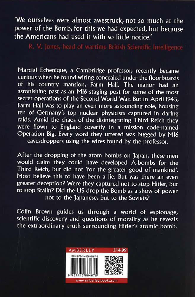 ‘We ourselves were almost awestruck, not so much at the power of the Bomb, for this we had expected, but because the Americans had used it with so little notice.’ R. V. Jones, head of wartime British Scientific IntelligenceMarcial Echenique, a Cambridge professor, recently became curious when he found wiring concealed under the floorboards of his country mansion, Farm Hall. The manor had an astonishing past as an MI6 staging post for some of the most secret operations of the Second World War. But in April 1945, Farm Hall was to play an even more astounding role, housing ten of Germany’s top nuclear physicists captured in daring raids. Amid the chaos of the disintegrating Third Reich they were flown to England covertly in a mission code-named Operation Big. Every word they uttered was bugged by MI6 eavesdroppers using the wires found by the professor.After the dropping of the atom bombs on Japan, these men would claim they could have developed A-bombs for the Third Reich, but did not ‘for the greater good of mankind’. Most believe this to have been a lie. But was there an even greater deception? Were they captured not to stop Hitler, but to stop Stalin? Did the US drop the Bomb as a show of power not to the Japanese, but to the Soviets?Colin Brown guides us through a world of espionage, scientific discovery and questions of morality as he reveals the extraordinary truth surrounding Hitler’s atomic bomb.