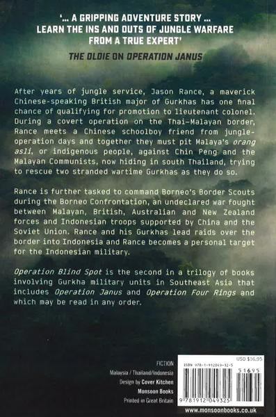 After years of jungle service, Jason Rance, a maverick Chinese-speaking British major of Gurkhas has one final chance of qualifying for promotion to lieutenant colonel. During a covert operation on the Thai-Malayan border, Rance meets a Chinese schoolboy friend from jungle-operation days and together they must pit Malaya's orang asli, or indigenous people, against Chin Peng and the Malayan Communists, now hiding in south Thailand, trying to rescue two stranded wartime Gurkhas as they do. Rance is further tasked to command Borneo's Border Scouts during the Borneo Confontation, an undeclared war fought between British, Australian and New Zealand forces and Indonesian troops supported by China and the Soviet Union. Rance and his Gurkhas lead raids over the border into Indonesia and Rance becomes a personal target for the Indonesian military.Operation Blind Spot is the second in a trilogy of books involving Gurkha military units in Southeast Asia that includes Operation Janus and Operation Four Rings and which may be read in any order.