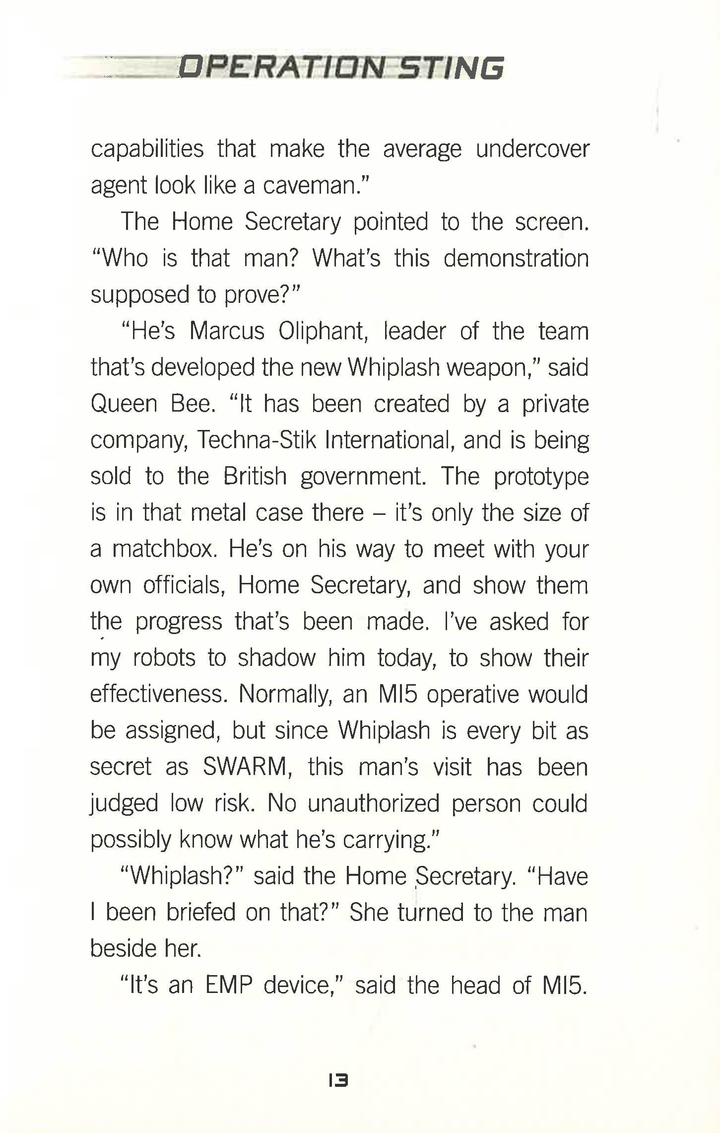 Operation Sting is the first book in an exciting, action-packed new series, SWARM. The Secret Intelligence Agency has a new weapon: SWARM - artificially intelligent robotic bugs that act as undercover agents. Operating below the radar, they can fly faster, see further and sting harder! They won't stop until they've completed their mission, no matter what it takes. In the face of trouble, SWARM are armed and ready to fight. In Operation Sting, the team are set a new mission. When a prototype weapon is stolen, it's a race against time for SWARM to locate and reclaim the weapon before the thieves crack the encryption code protecting it. Can they stop the villains before it's too late?