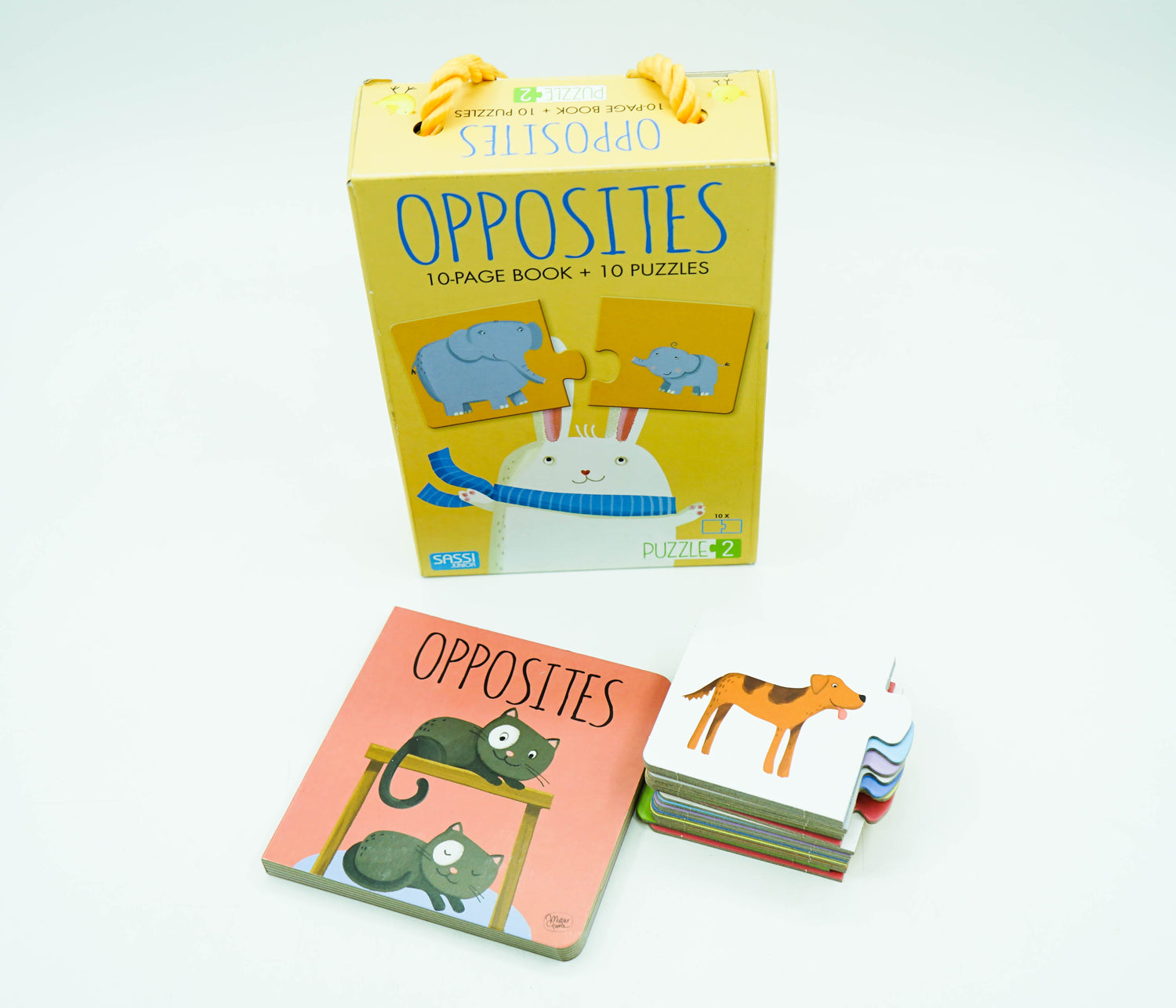 Have fun assembling the two-piece puzzles, then read the rhyming story in the accompanying board book. You'll learn all about opposites!