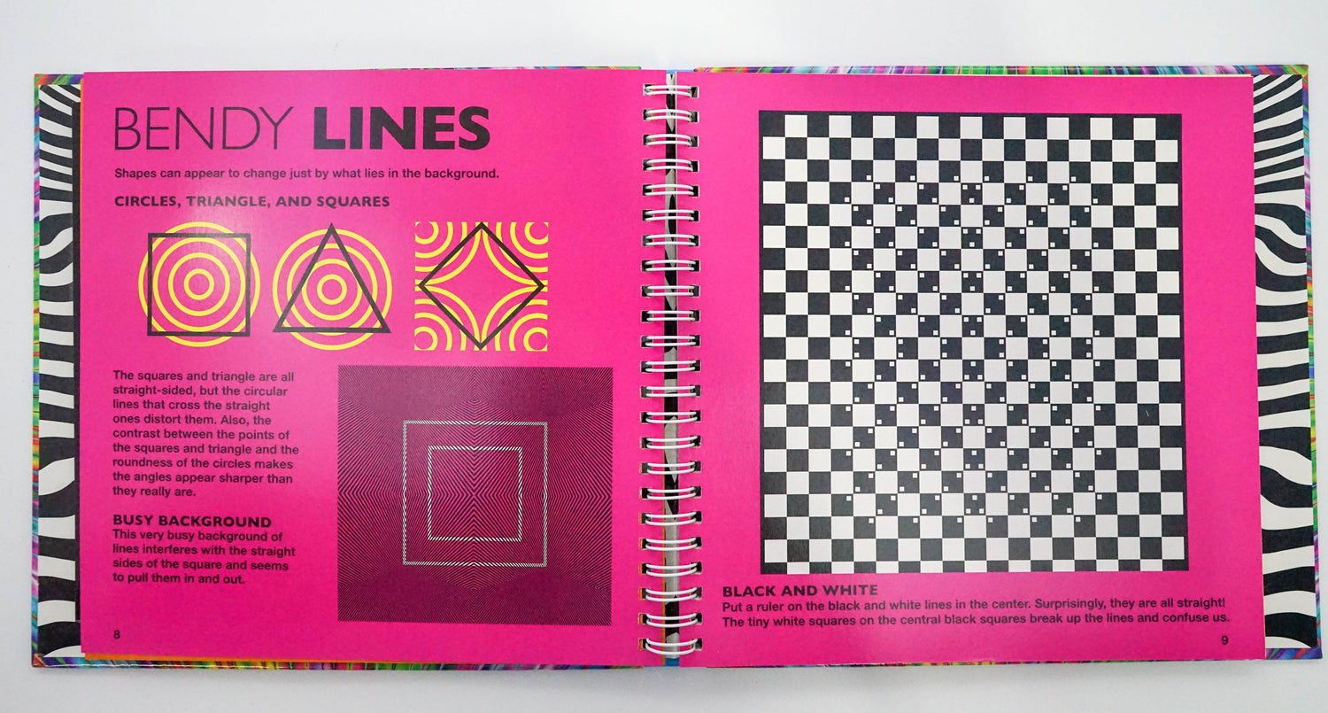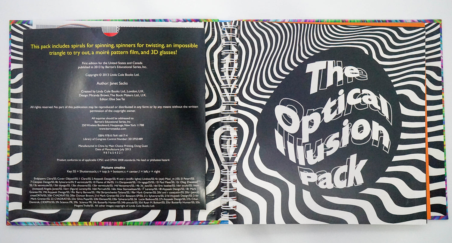 This fun and unusual pack comes complete with lots of cool accessories to help with the illusions including: 3D glasses, a thaumatrope (for animated illusions), a press-out impossible triangle, plus acetate sheets and spinners for creating vibrating lines and other illusions. A built-in storage pocket secures illusion accessories.