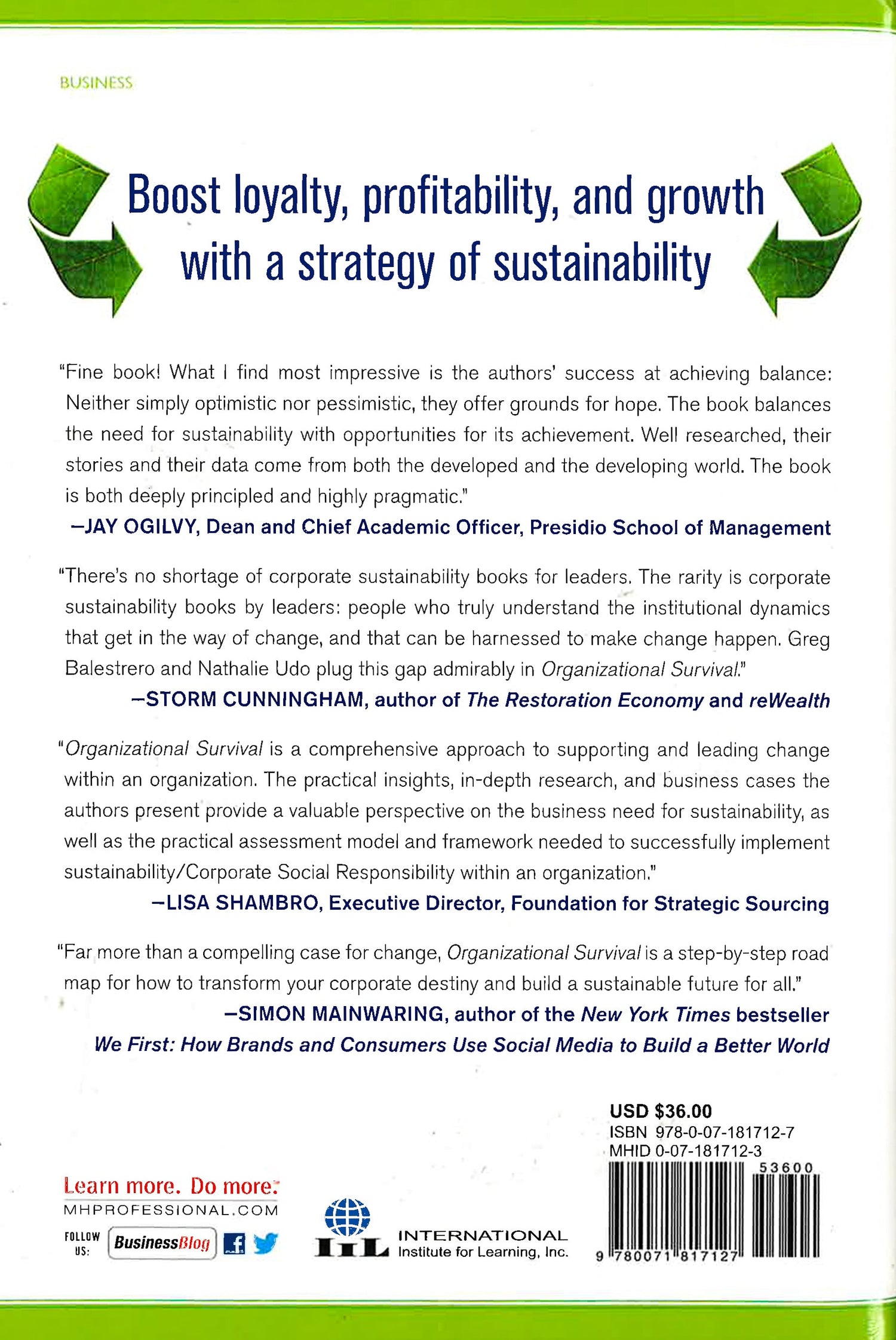 BOOST LOYALTY, PROFITABILITY, AND GROWTH WITH A STRATEGY OF SUSTAINABILITYOrganizational Survival provides a rational, research-based approach to creating a durable business strategy designed to meet the needs of today's customers and position an organization to outperform while positivelyimpacting society, the environment, community, and the bottom line.Balestrero and Udo present an airtight argument forsustainability being essential to any business strategygoing forward. Illustrating how successful companiesaround the globe are already deliberately changing--including Coca-Cola, BMW, BASF, and Walmart--the authors take you step-by-step through the processes of developing a new strategy, or altering an existing one, to integrate sustainability into core business goals.Organizational Survival provides the tools neededto apply risk management, scenario planning, and due diligence to sustainability initiatives via theirinnovative SEEE model framework--developed in conjunction with International Institute for Learning, Inc.--which encompasses the social, economic, environmental, and ethical factors of strategic change.Learn to build adaptive foresight and steer the futureof your company based on:SOCIAL COMMITMENT: Integrate individual and community stakeholder interests into your strategy and align them with your company's valuesECONOMIC COMMITMENT: Develop a business model that will generate profits through sustainabilityENVIRONMENTAL COMMITMENT: Honestly assess the company's impact on the environment and take requisite actionETHICAL COMMITMENT: Build trust among all stakeholders through openness, transparency, and accountabilityEmbrace the changes businesses are facing, and implementa strategy now that will meet market demand and ensure your Organizational Survival.PRAISE FOR ORGANIZATIONAL SURVIVAL:"Fine book! What I find most impressive is the authors' success at achieving balance: Neither simply optimistic nor pessimistic, they offer grounds for hope. The book balances the need for sustainability with opportunities for its achievement. Well researched, their stories and their data come from both the developed and the developing world. The book is both deeply principled and highly pragmatic." -- Jay Ogilvy, Dean and Chief Academic Officer, Presidio School of Management"There's no shortage of corporate sustainability books or leaders. The rarity is corporate sustainability books by leaders: people who truly understand the institutional dynamics that get in the way of change, and that can be harnessed to make change happen. Greg Balestrero and Nathalie Udo plug this gap admirably in Organizational Survival." -- Storm Cunningham, author of The Restoration Economy and reWealth"Organizational Survival is a comprehensive approach to supporting and leading change within an organization. The practical insights, in-depth research, and business cases the authors present provide a valuable perspective on the business need for sustainability, as well as the practical assessment model and framework needed to successfully implement sustainability/Corporate Social Responsibility within an organization." -- Lisa Shambro, Executive Director, Foundation for Strategic Sourcing"Far more than a compelling case for change, Organizational Survival is a step-by-step roadmap for how to transform your corporate destiny and build a sustainable future for all." -- Simon Mainwaring, author of the New York Times bestseller We First: How Brands and Consumers Use Social Media to Build a Better World
