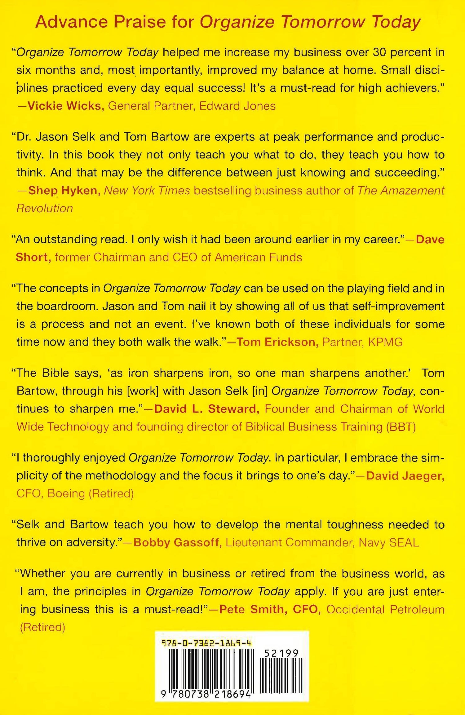 Sports Psychology Meets Wall StreetDr. Jason Selk helps well-known professional and Olympic athletes as well as Fortune 500 executives and organizations develop the mental toughness necessary to thrive in the face of adversity and achieve elite-level results. Tom Bartow, following a career as a winning college basketball coach, became one of the country's top financial advisors and is now one of the premier business coaches nation-wide. Together, Selk and Bartow reveal the secrets of how both elite athletes and business leaders climb to the top.In Organize Tomorrow Today , two of the top minds in human performance come together to deliver the pathway to extreme success. Doing more is not the answer, and Selk and Bartow walk you through how to achieve more by doing less. There is a huge difference between knowing something and understanding. There is an even wider gap between understanding and doing. Highly successful people never get it all finished in any given day however, they always get the most important things completed. Selk and Bartow offer the 8 fundamentals of doing what it is most important. OTT will show you the performance gains that athletes, executives, and salespeople spend tens of thousands of dollars to achieve.