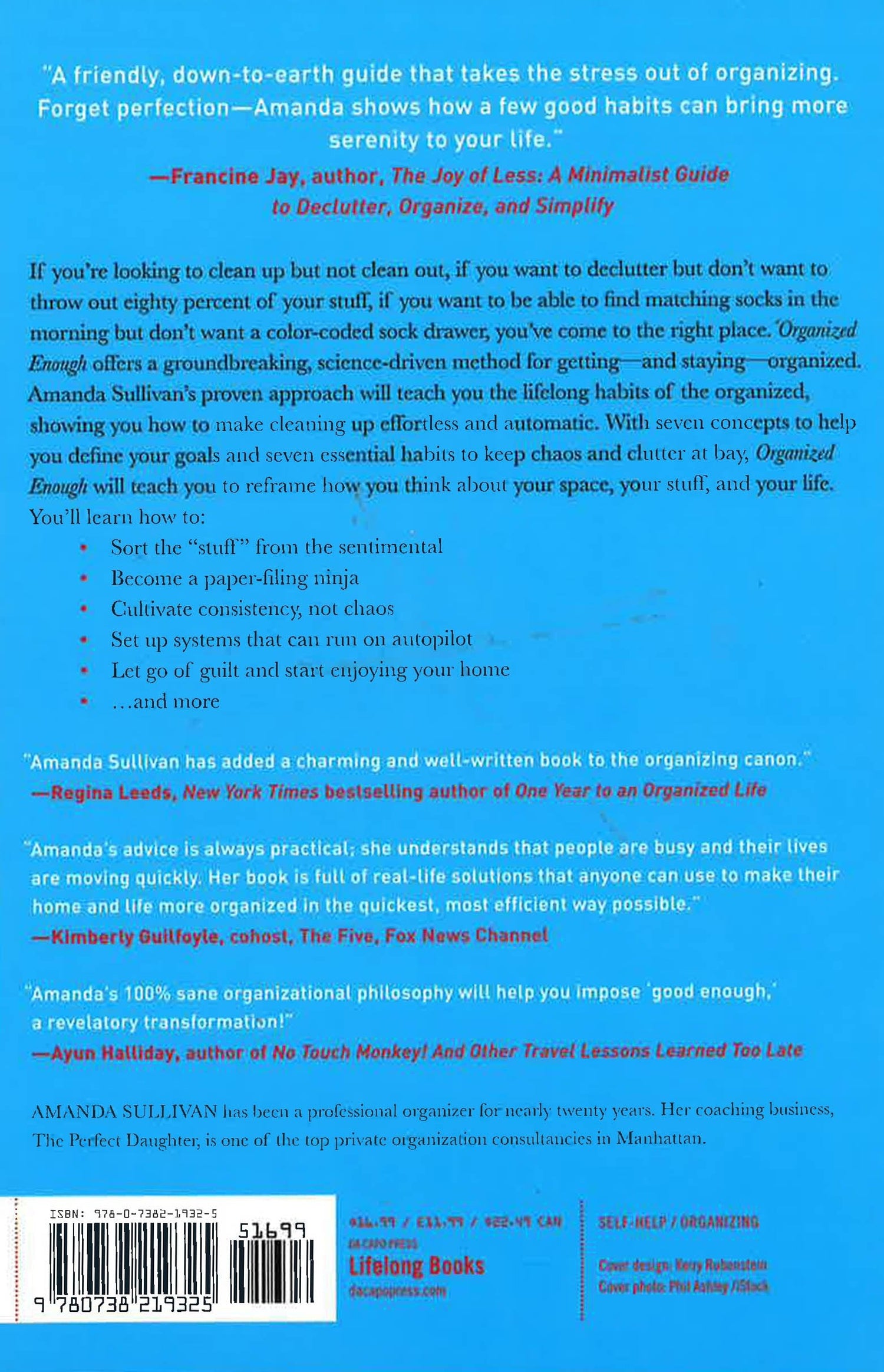 If you're looking to clean up but not clean out, if you want to declutter but don't want to throw out eighty percent of your stuff, if you want to be able to find matching socks in the morning but don't want a color-coded sock drawer, you've come to the right place. Organized Enough offers a groundbreaking, science-driven method for getting--and staying--organized. Amanda Sullivan's proven approach will teach you the lifelong habits of the organized, showing you how to make cleaning up effortless and automatic. With seven concepts to help you define your goals and seven essential habits to keep chaos and clutter at bay, Organized Enough will teach you to reframe how you think about your space, your stuff, and your life.