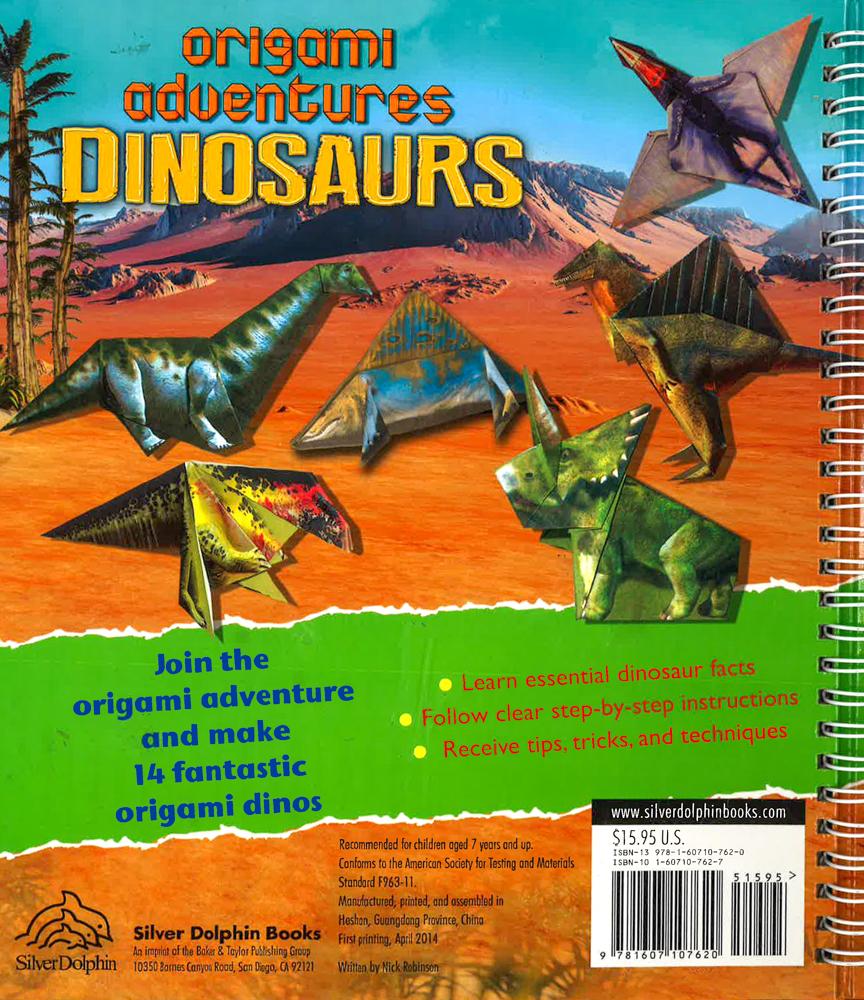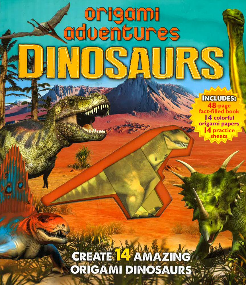 Origami Adventures: Dinosaurs" features everything that children need to become origami experts. Step-by-step origami directions are paired with illustrations and fun facts about different dinosaurs. A 48-page book with clear, step-by-step instructions for creating 14 origami dinosaurs is accompanied by 14 sheets of colorful origami paper and 14 sheets of practice paper.