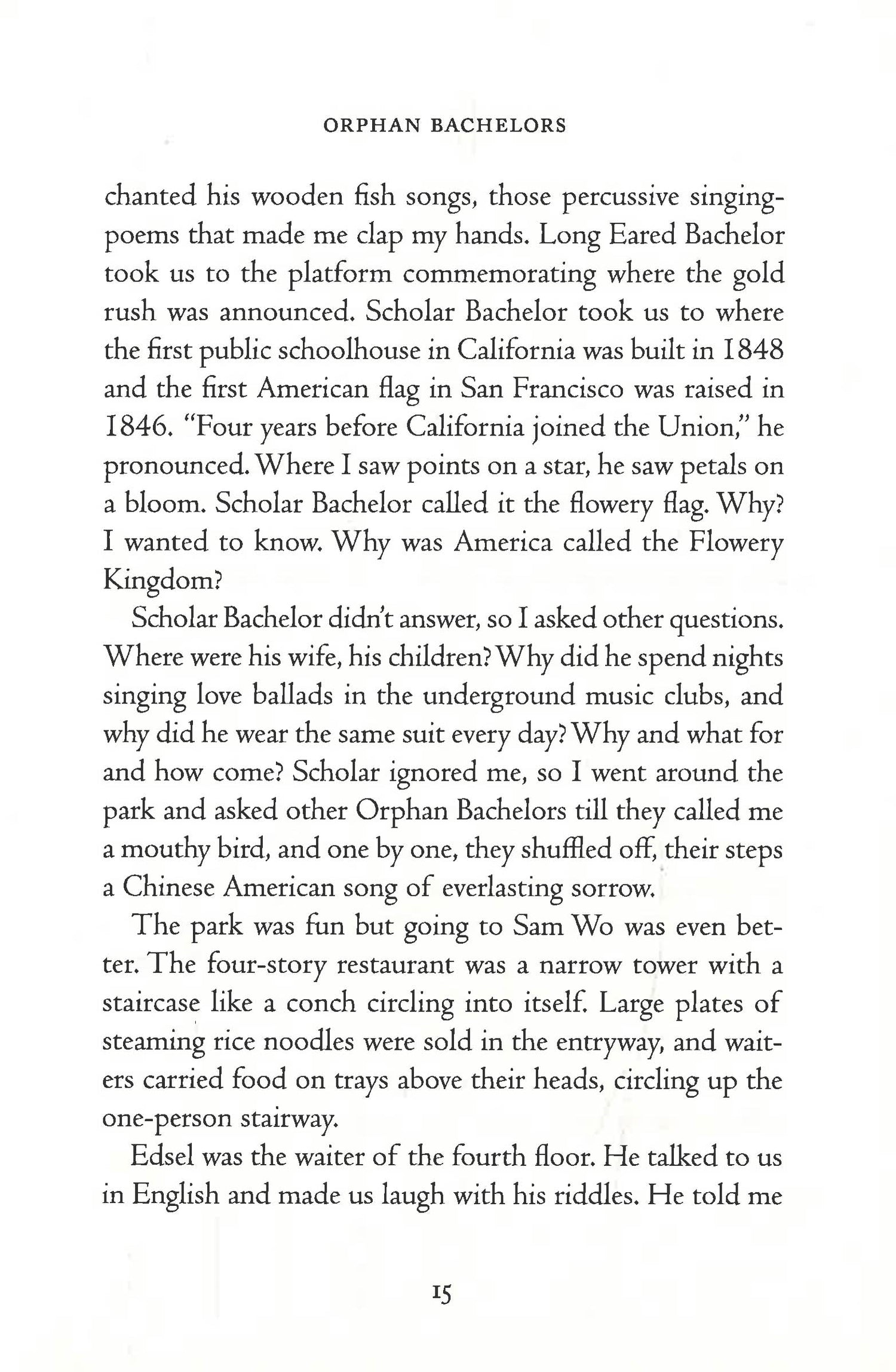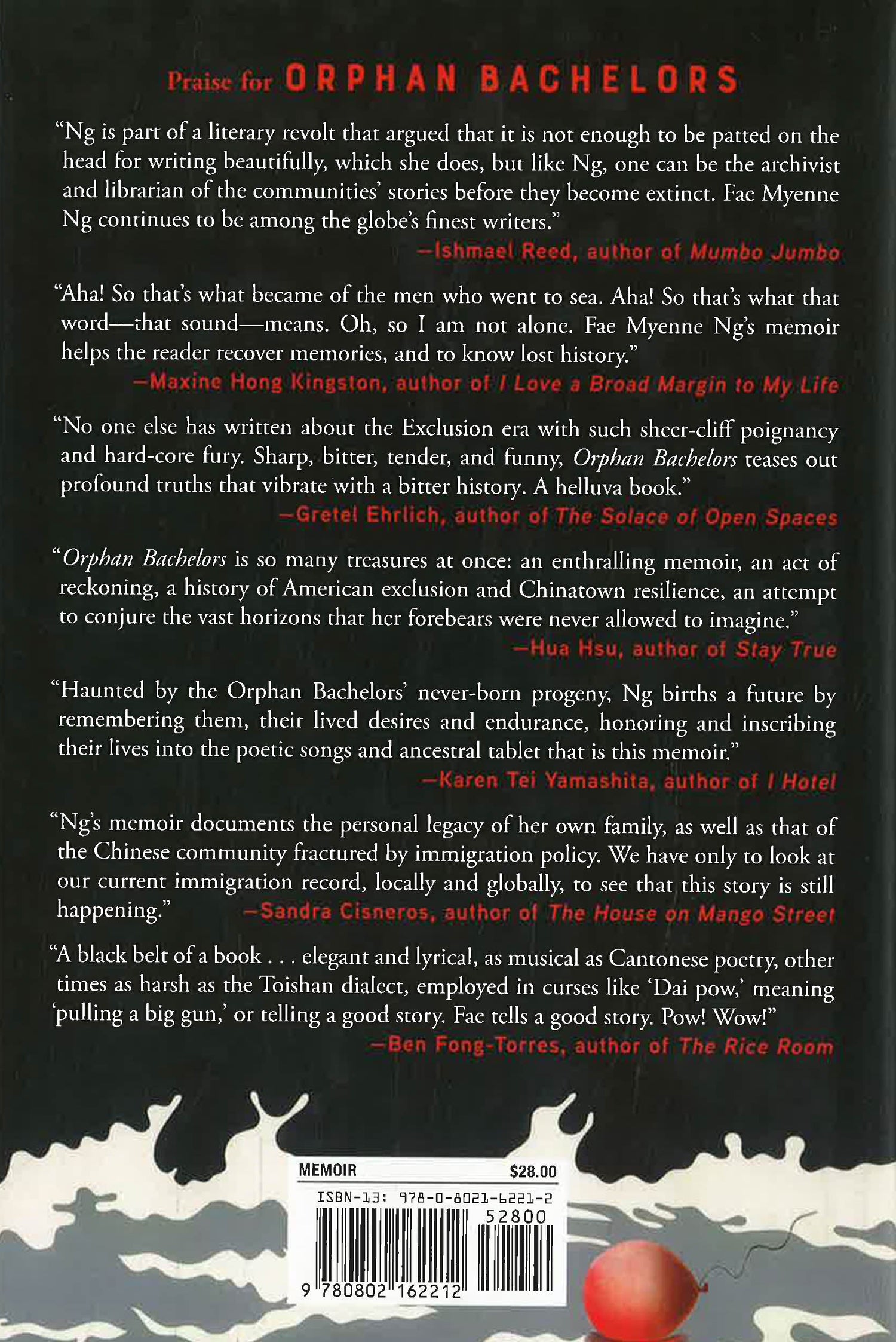 Each Orphan Bachelor bequeathed the children their true American inheritance. Ng absorbed their suspicious, lonely, barren nature; she found storytelling and chosen children in the form of her students. Exclusion's legacy followed her from the back alleys of Chinatown in the 60s, to Manhattan in the 80s, to the high desert of California in the 90s, until her return home in the 2000s when the untimely deaths of her youngest brother and her father devastated the family. A a child, Ng believed her father's lies; as an adult, she returned to her childhood home to write his truth.