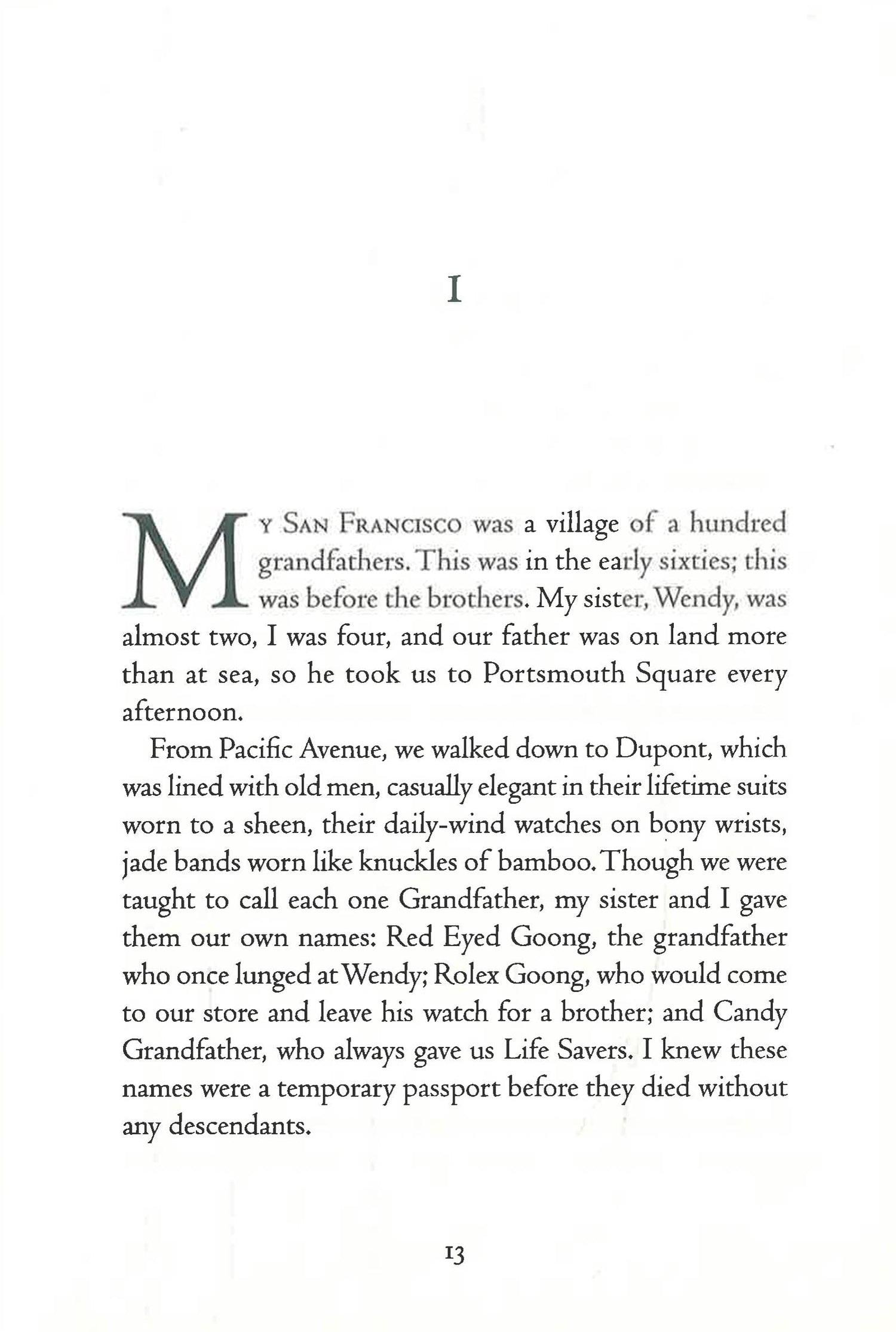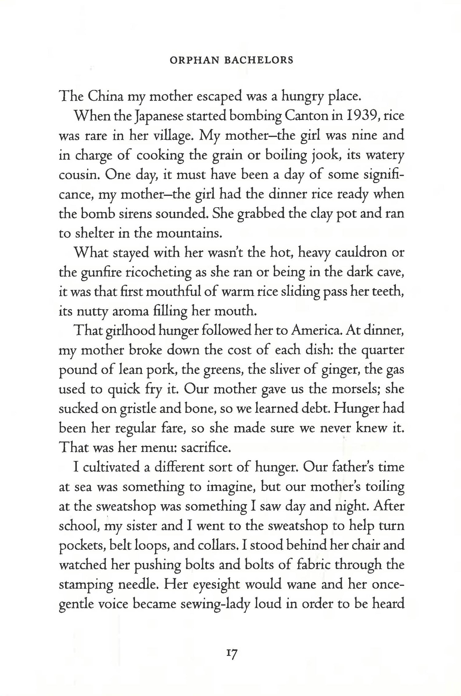 Ng was her parents' precocious first born, the translator, the bossy eldest sister. A child raised by a seafaring father and a seamstress mother, by San Francisco's Chinatown and its legendary Orphan Bachelors -- men without wives or children, Exclusion's living legacy. She and her siblings were their stand-in descendants, Ng's family grocery store their haven.