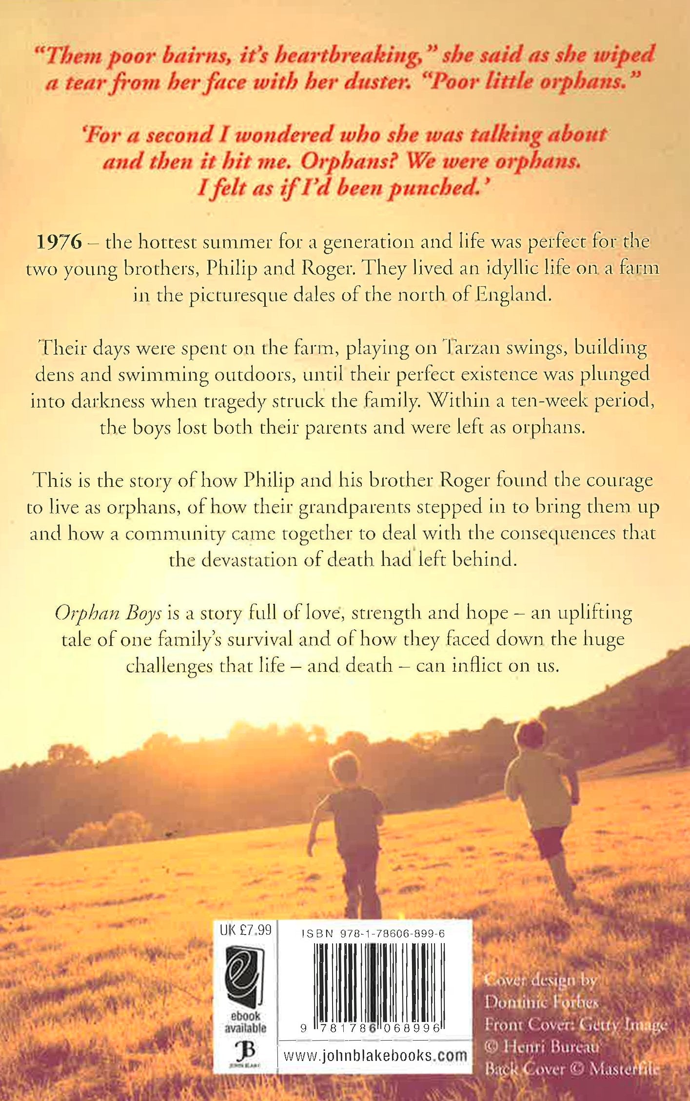 1976, the hottest summer for a generation and life was perfect for the two young brothers Philip and Roger. They lived an idyllic life on a farm in the picturesque dales of the north of England. With their days spent on the farm, playing on Tarzan swings, building dens and swimming outdoors, their perfect existence was plunged into darkness when tragedy struck the family. Within a ten-week period, the boys lost their parents and were left as orphans. This is the story of Philip and his brother Roger, how their grandparents stepped in to bring them up and how a family and community came together to deal with the consequences that the devastation of death had left behind. Orphan Boys is not a misery memoir. It is a story full of love, strength and hope - an uplifting tale of a family's survival and how they faced the huge challenges that life threw at them.