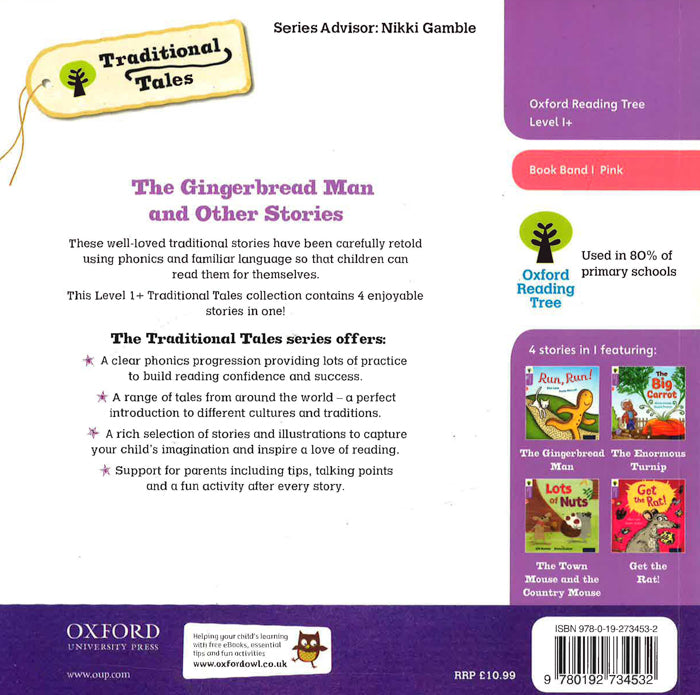 These well-loved traditional stories have been carefully retold using phonics and familiar language so that children can read them for themselves. This Level 1+ collection contains these 4 enjoyable stories: Run, Run! which is based on the American tale The Gingerbread Man; The Big Carrot which is based on The Enormous Turnip; Lots of Nuts which is based on Aesop's fable The Town Mouse and the Country Mouse; and Get the Rat! is a humorous new story, based on the familiar structure of traditional tales -a rat needs to be caught in the palace, but where is it hiding? The Traditional Tales series offers: *A clear phonics progression providing lots of practice to build reading confidence and success. *A range of tales from around the world - a perfect introduction to different cultures and traditions. *A rich selection of stories and illustrations to capture your child's imagination and inspire a love of reading. *Support for parents including tips, talking points and a fun activity after every story. Also visit www.oxfordowl.co.uk practical advice, helpful information about phonics, lots of fun activities, free storyteller videos and free eBooks.