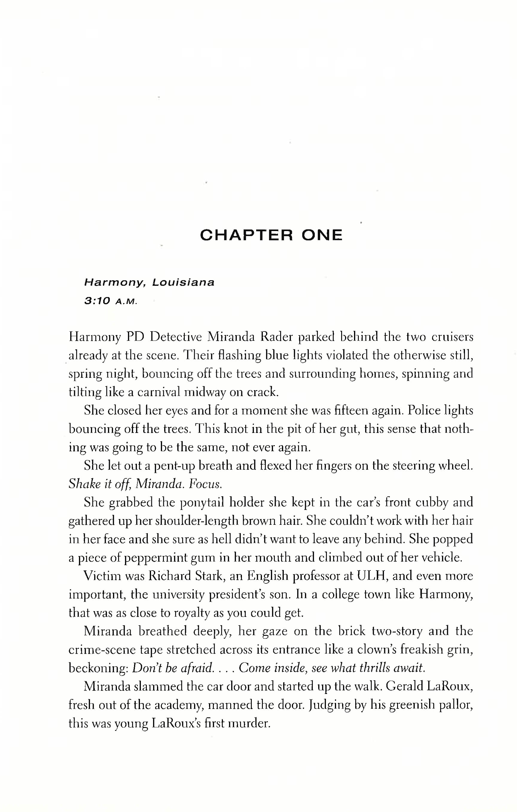 When Miranda and her partner are called to investigate the murder of one of the town's most beloved college professors, they're unprepared for the brutality of the scene. Just when Miranda thinks she's seen the worst of it, she finds a piece of evidence that chills her to the core: a faded newspaper clipping about a terrible night fifteen years ago. The night she'd buried, along with the girl she'd been back then, and until now that grave had stayed sealed.