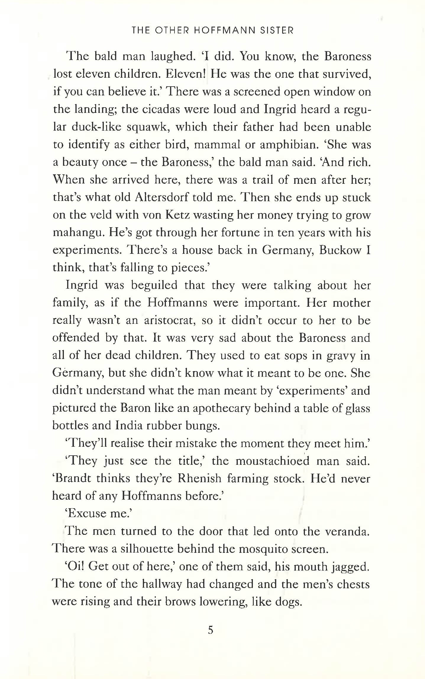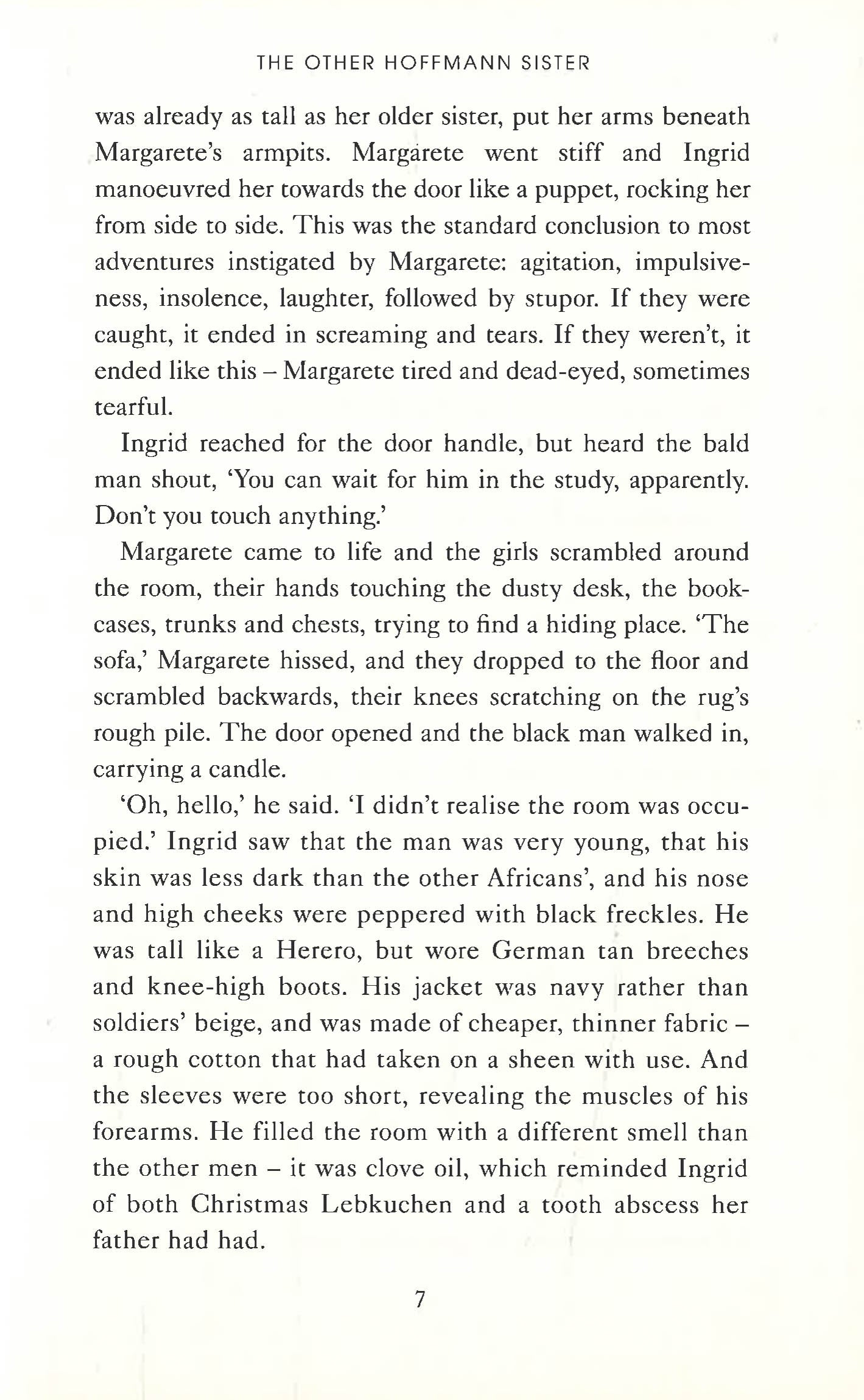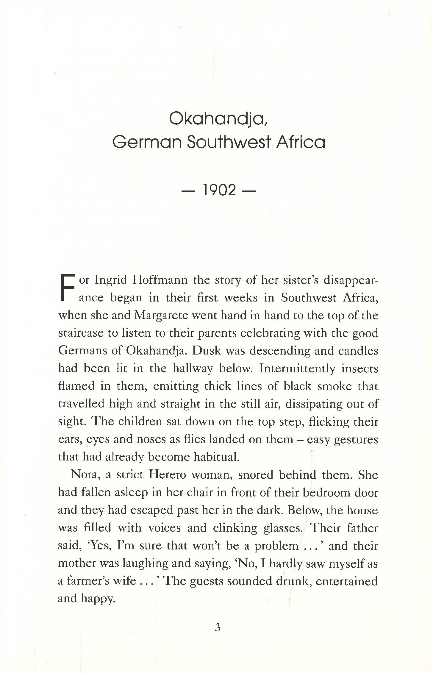 Ingrid Hoffmann has always felt responsible for her sister Margarete and when their family moves to German Southwest Africa in 1902, her anxieties only increase. The casual racism that pervades the German community, the strange relationship between her parents and Baron von Ketz, from whom they bought their land, and the tension with the local tribes all culminate in tragedy when Baron von Ketz is savagely murdered. Baroness von Ketz and their son, Emil, flee with the Hoffmanns as the Baron's attackers burn down the family's farm.