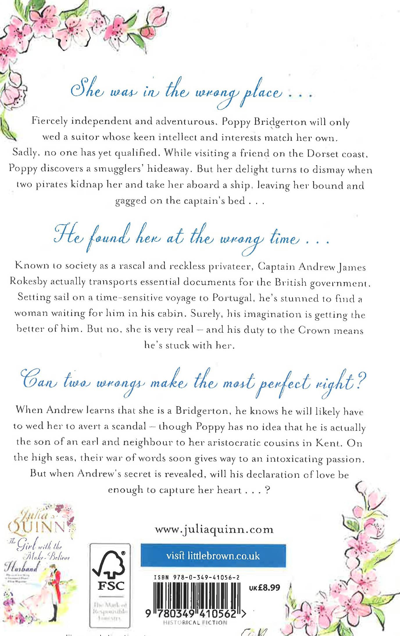 She was in the wrong place...Fiercely independent and adventurous, Poppy Bridgerton will only wed a suitor whose keen intellect and interests match her own. Sadly, none of the fools from her London season qualify. While visiting a friend on the Dorset coast, Poppy is pleasantly surprised to discover a smugglers' hideaway tucked inside a cave. But her delight turns to dismay when two pirates kidnap her and take her aboard a ship, leaving her bound and gagged on the captain's bed... He found her at the wrong time... Known to society as a rascal and reckless privateer, Captain Andrew James Rokesby actually transports essential goods and documents for the British government. Setting sail on a time-sensitive voyage to Portugal, he's stunned to find a woman waiting for him in his cabin. Surely, his imagination is getting the better of him. But no, she is very real-and his duty to the Crown means he's stuck with her. Can two wrongs make the most perfect right? When Andrew learns that she is a Bridgerton, he knows he will likely have to wed her to avert a scandal-though Poppy has no idea that he is the son of an earl and neighbor to her aristocratic cousins in Kent. On the high seas, their war of words soon gives way to an intoxicating passion. But when Andrew's secret is revealed, will his declaration of love be enough to capture her heart...?