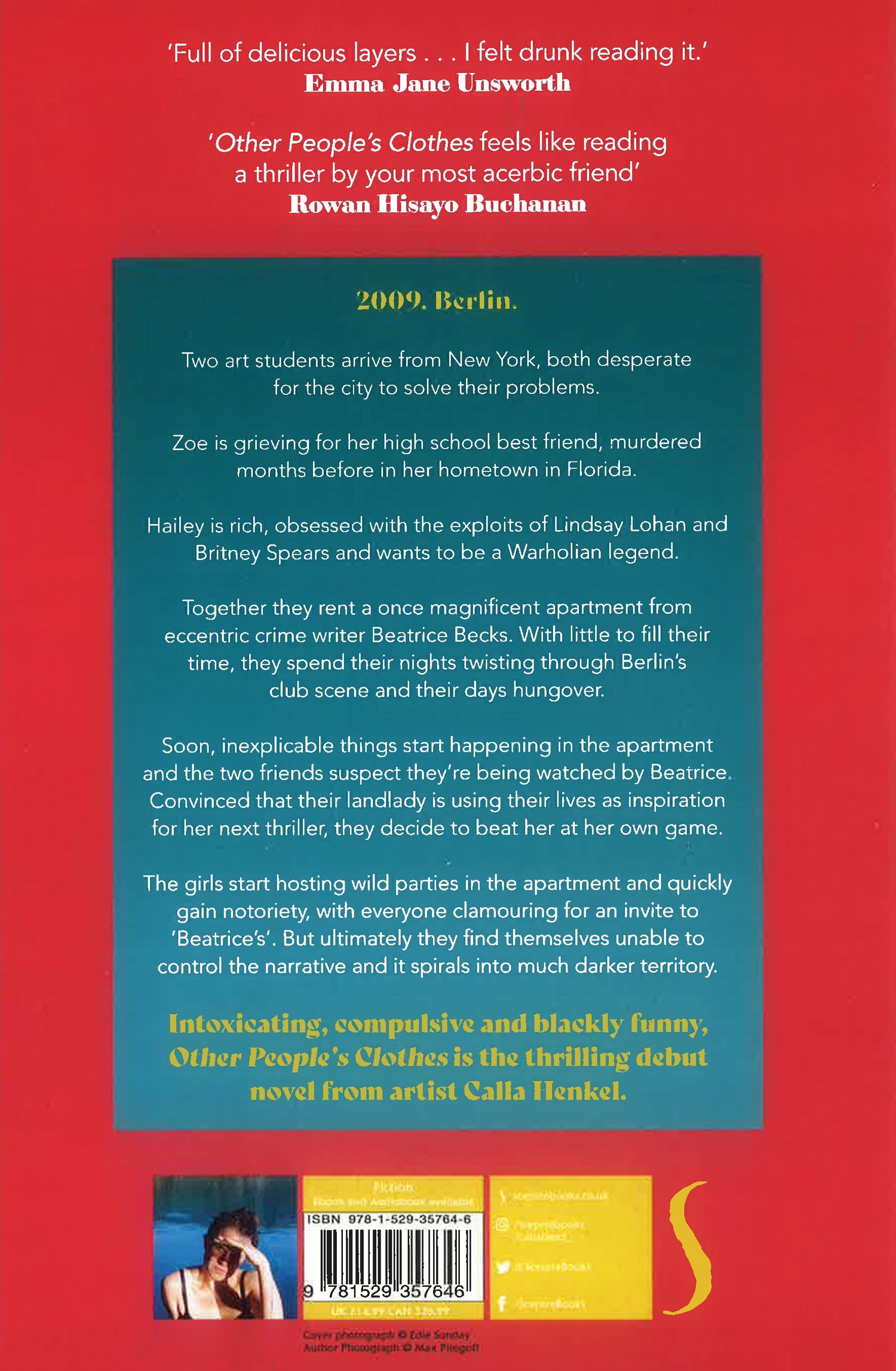A sparkling debut...this is a very good plot-driven thriller dressed in a glittery jumpsuit.' GUARDIAN'I couldn't stop turning the pages . . . a debut you won't want to miss' MEGAN ABBOTT'A wild, energetic gem of a novel' DAILY MAIL Intoxicating, compulsive and blackly funny, Other People's Clothes is the thrilling novel from Berlin-based American artist Calla Henkel.2009. Berlin. Two art students arrive from New York, both desperate for the city to solve their problems.Zoe is grieving for her high school best friend, murdered months before in her hometown in Florida.Hailey is rich, obsessed with the exploits of Lindsay Lohan and Britney Spears and wants to be a Warholian legend.Together they rent a once-magnificent apartment from eccentric crime writer Beatrice Becks. With little to fill their time, they spend their nights twisting through Berlin's club scene and their days hungover. Soon inexplicable things start happening in the apartment and the two friends suspect they are being watched by Beatrice. Convinced that their landlord is using their lives as inspiration for her next thriller novel, they decide to beat her at her own game. The girls start hosting wild parties in the flat and quickly gain notoriety, with everyone clamouring for an invite to 'Beatrice's.' But ultimately they find themselves unable to control the narrative and it spirals into much darker territory . . .'Thrilling' Cosmopolitan'Full of delicious layers . . . I felt drunk reading it.' Emma Jane Unsworth'Other People's Clothes feels like reading a thriller by your most acerbic friend' Rowan Hisayo Buchanan