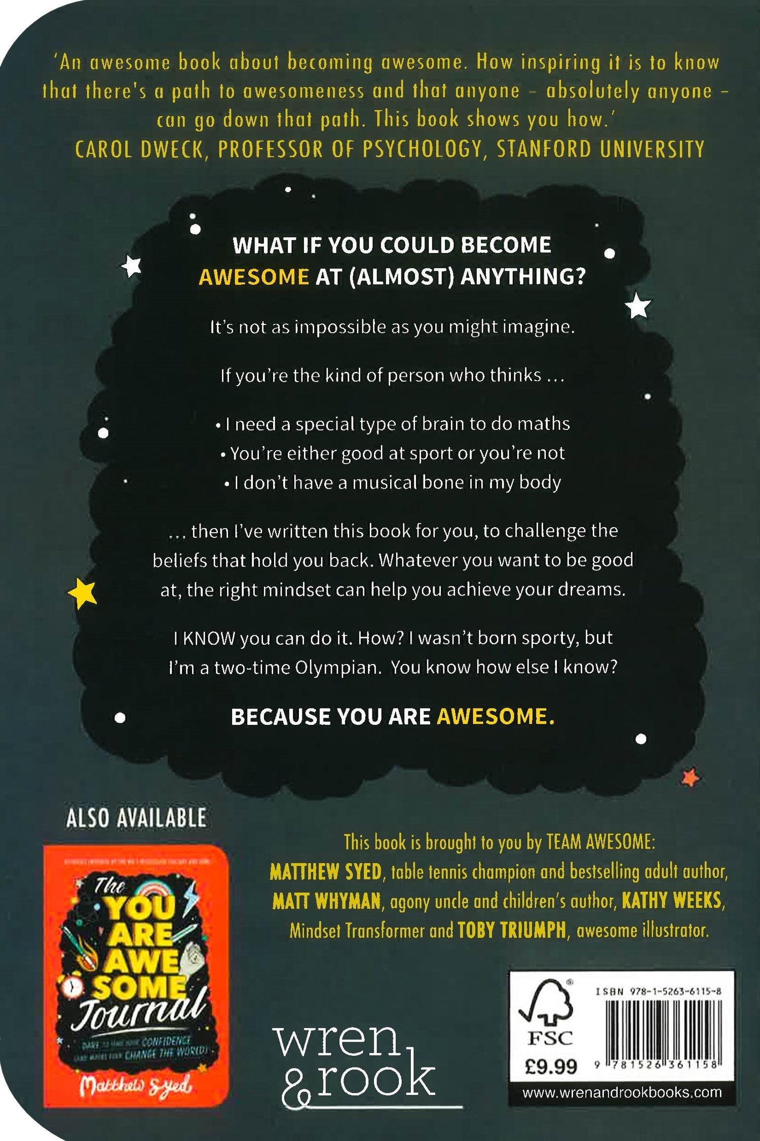 This positive and empowering guide, by bestselling mindset author Matthew Syed, will help boys and girls build resilience, fulfil their potential and become successful, happy, awesome adults. CHILDREN'S BOOK OF THE YEAR 2019SUNDAY TIMES NUMBER ONE BESTSELLER"A very funny and inspiring read! Brilliantly practical with a wide variety of examples that make it relevant for both boys and girls (and adults)!" - online customer review"A truly inspiring book for the younger generation!" - online customer review"Genuinely funny and engaging. There are messages in this book for both adults and children. It's a must read." - online customer review"An awesome book about becoming awesome. How inspiring it is to know that there's a path to awesomeness and that anyone - absolutely anyone - can go down that path. This book shows you how." - Carol Dweck, Professor of Psychology, Stanford UniversityThis positive and empowering guide, by bestselling mindset author Matthew Syed, will help boys and girls build resilience, fulfil their potential and become successful, happy, awesome adults.I'm no good at sport ... I can't do maths ... I really struggle with exams ... Sound familiar?If you believe you can't do something, the chances are you won't try. But what if you really could get better at maths, or sport or exams? In fact, what if you could excel at anything you put your mind to?You Are Awesome can help you do just that, inspiring and empowering young readers to find the confidence to realise their potential. The first children's book from Times journalist, two-time Olympian and best-selling mindset author Matthew Syed, it uses examples of successful people from Mozart to Serena Williams to demonstrate that success really is earned rather than given, and that talent can be acquired. With hard work and determination, practice and self-belief, and, most importantly, a Growth Mindset, there's no reason why anyone can't achieve anything. Practical, insightful and positive, this is the book to help children build resilience, embrace their mistakes and grow into successful, happy adults.Also available: The You Are Awesome Journal. Whether setting out your goals, planning the best practice ever, keeping calm with breathing exercises or making paper aeroplanes to understand marginal gains, you'll love the brilliant activities in The You Are Awesome Journal - it's the perfect companion to You Are Awesome!