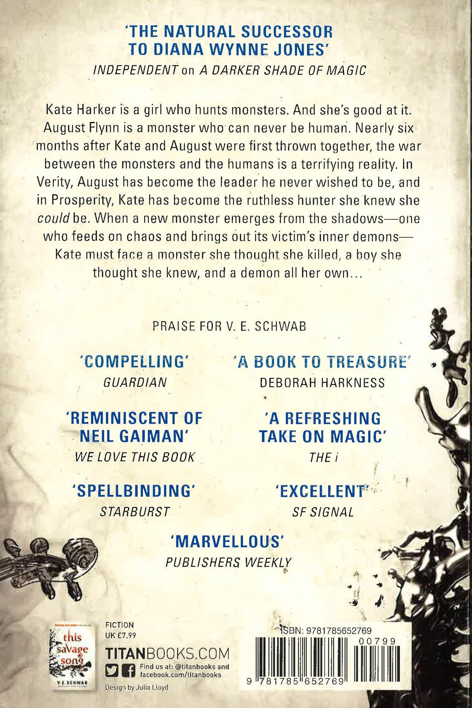 The sequel-and conclusion-to Victoria Schwab's instant #1 New York Times bestseller, This Savage Song.Kate Harker is a girl who isn't afraid of the dark. She's a girl who hunts monsters. And she's good at it. August Flynn is a monster who can never be human. No matter how much he once yearned for it. He has a part to play. And he will play it, no matter the cost.Nearly six months after Kate and August were first thrown together, the war between the monsters and the humans is a terrifying reality. In Verity, August has become the leader he never wished to be, and in Prosperity, Kate has become the ruthless hunter she knew she could be. When a new monster emerges from the shadows-one who feeds on chaos and brings out its victim's inner demons-it lures Kate home, where she finds more than she bargained for. She'll face a monster she thought she killed, a boy she thought she knew, and a demon all her own.