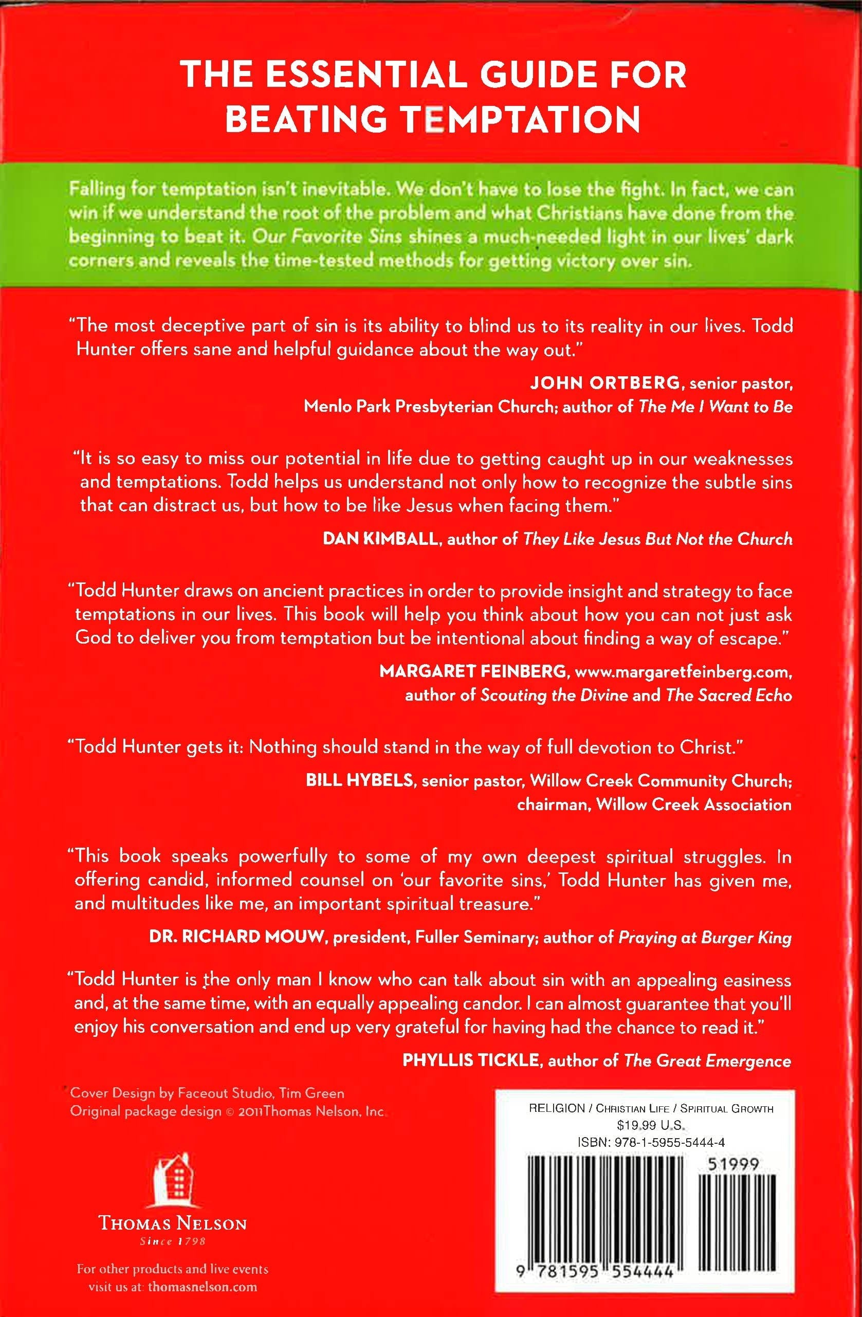 The Essential Guide for Beating Temptation Falling for temptation isn't inevitable. We don't have to lose the fight. In fact, we can win if we understand the root of the problem and what Christians have done from the beginning to beat it. Our Favorite Sins shines a much-needed light in our lives' dark corners and reveals the time-tested methods for getting victory over sin. Are you tyrannized by your own desires? If you are breathing, your answer is probably yes. The question is: What are you going to do about it? With more than thirty years of pastoral experience, Todd D. Hunter knows that most people himself included struggle every day with temptation. All too often, we fail and fall, and some of us are at our wit's end, utterly defeated. What do we do to get a grip on the sin in our life and live like God wants? There's good news: despite all our failures and shameful "moments after," there really is a way out, a way forward, and a way that draws us closer to the life that God desires for us. In Our Favorite Sins, Hunter cracks open the problem of temptation and points to practical, biblically based, time-tested solutions. First revealing the role played by our disordered desires, Hunter shows how different temptations trip us up and how we can resist and overcome them, even if we've fallen prey to them for decades. Victory starts with reordering our desires, and the church has given us the tools for the job. Hunter shows us how to use them and start beating the temptations that so often beat us. Informed by exclusive research from the Barna Group, Our Favorite Sins offers a view that works for any believer wherever they are and no matter how big the battle they're fighting.