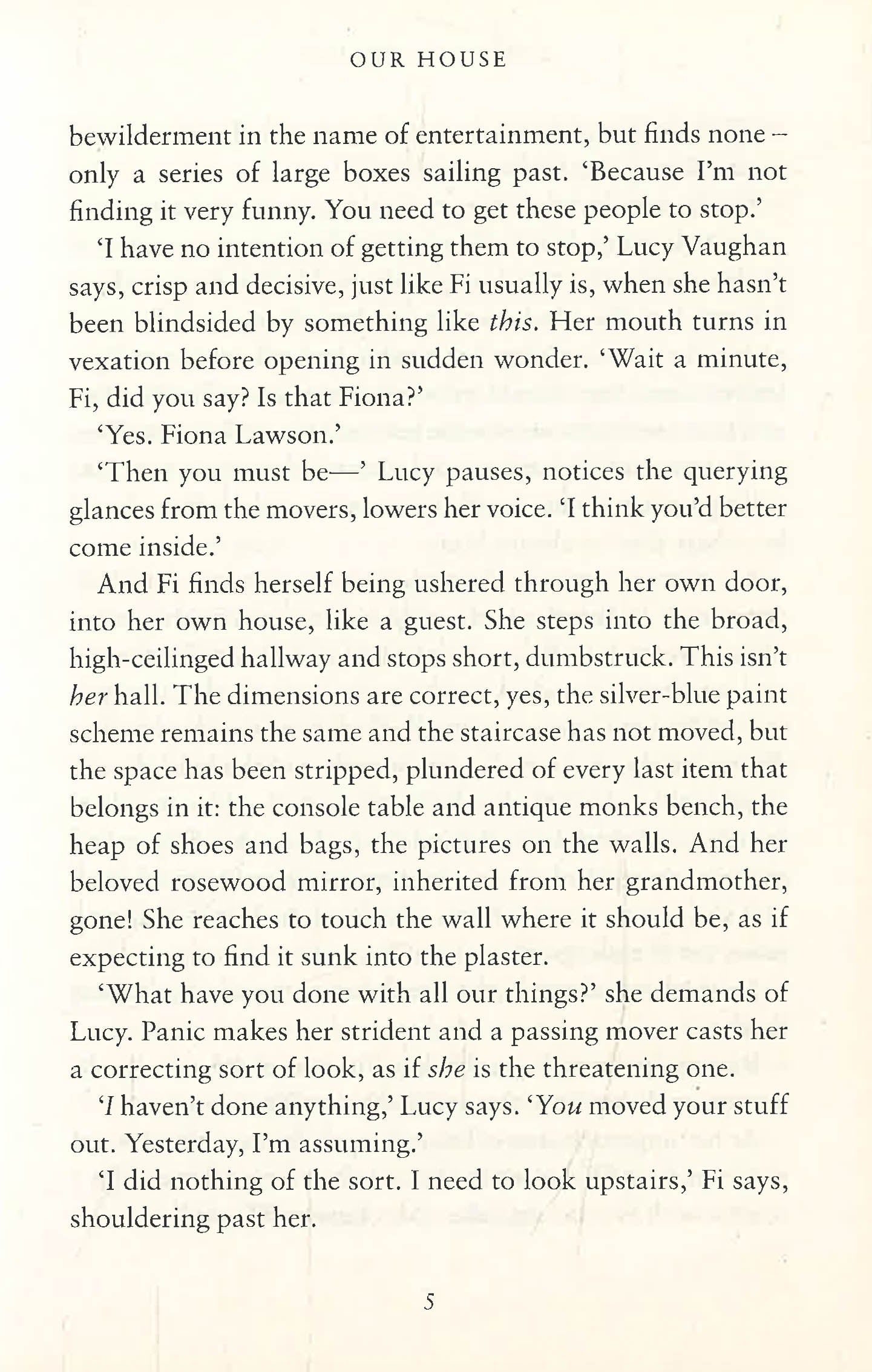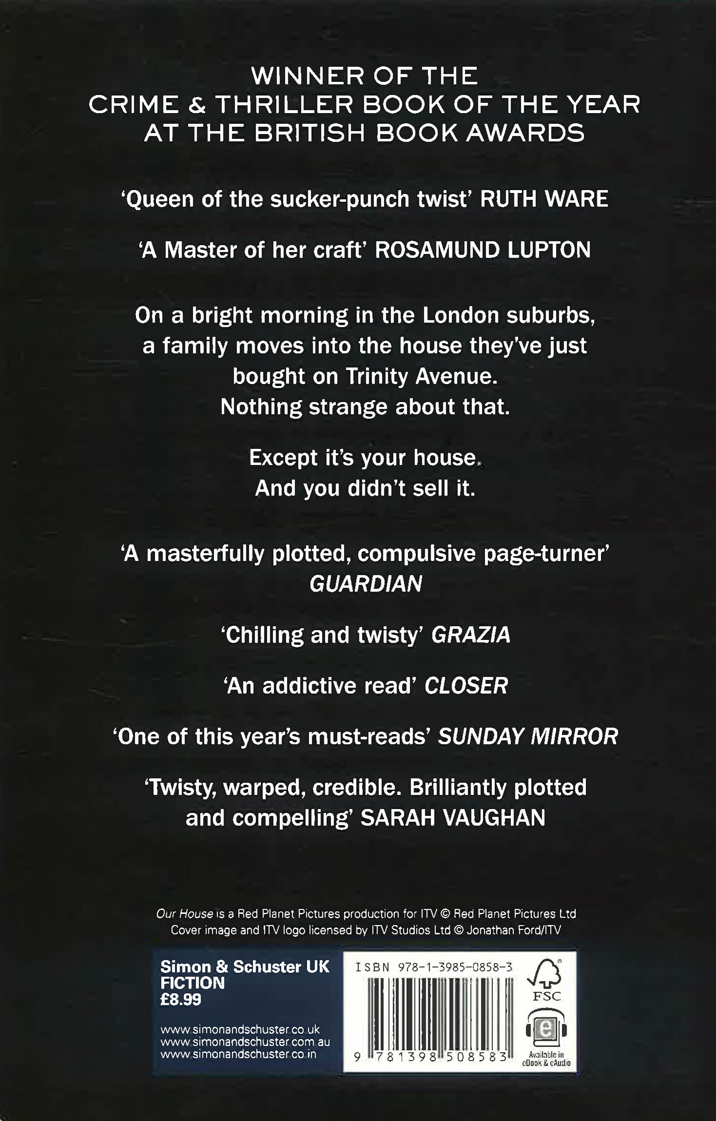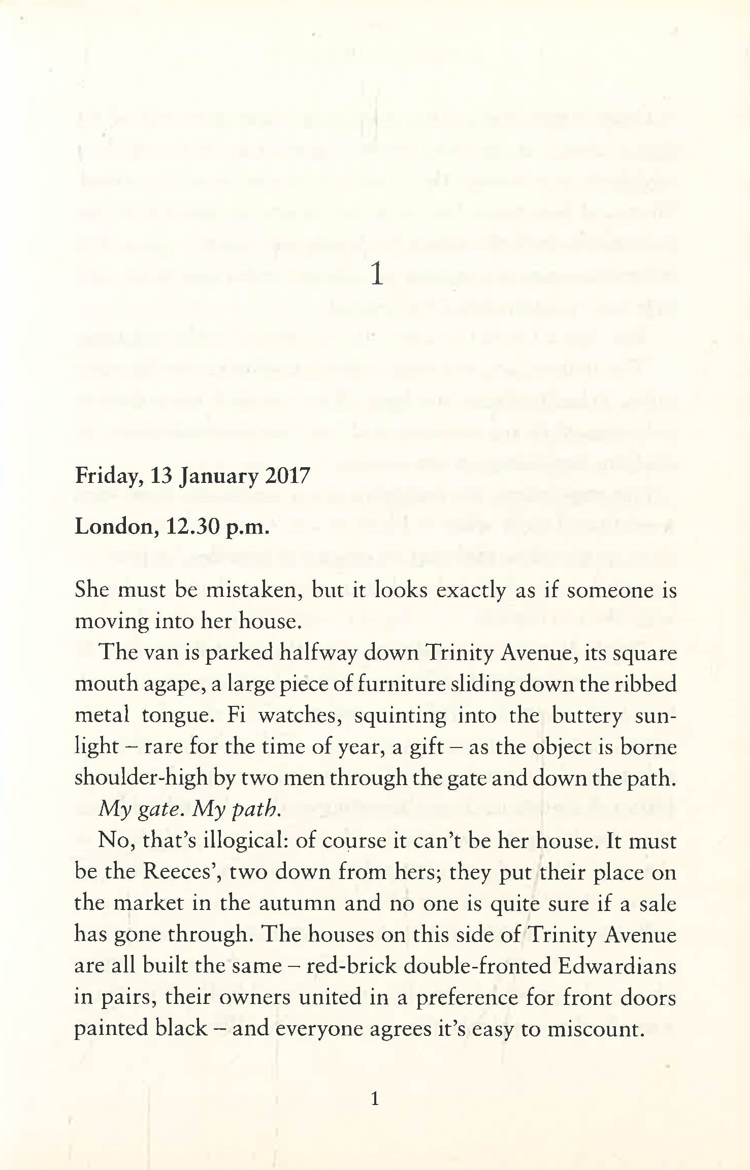 When Fi Lawson arrives home to find strangers moving into her house, she is plunged into terror and confusion. She and her husband Bram have owned their home on Trinity Avenue for years and have no intention of selling. How can this other family possibly think the house is theirs? And why has Bram disappeared when she needs him most?